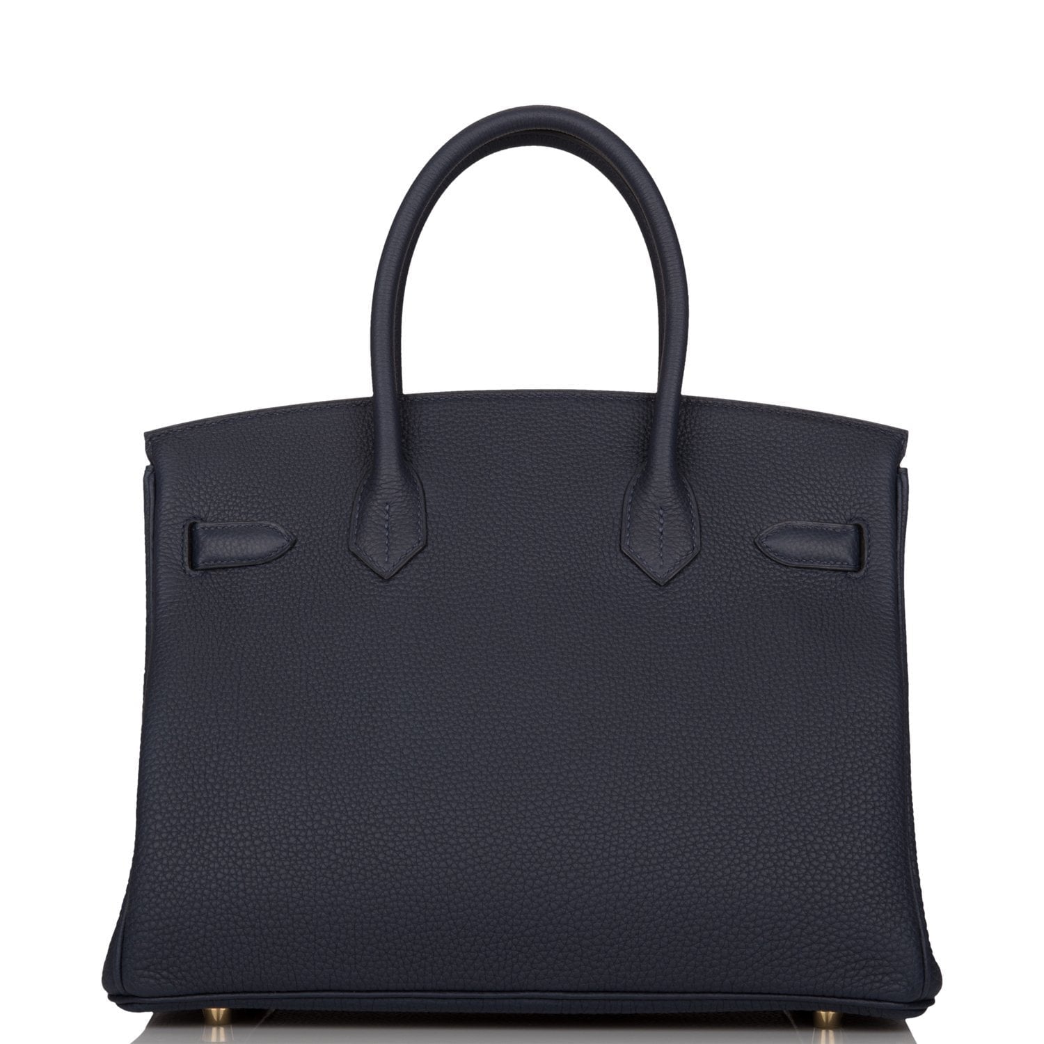 This Birkin is in Bleu Nuit togo leather with gold hardware and has tonal stitching, front flap, two straps with center toggle closure, clochette with lock and two keys, and double rolled handles.