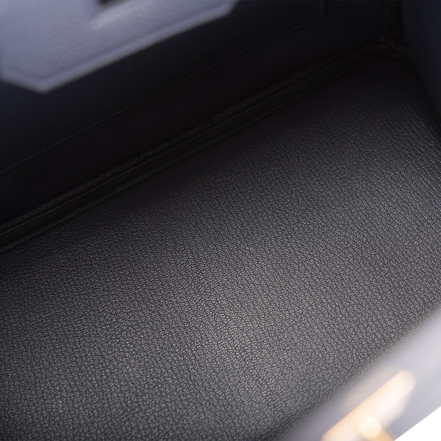 The interior is lined with Bleu Nuit chevre and has one zip pocket with an Hermes engraved zipper pull and an open pocket on the opposite side.
