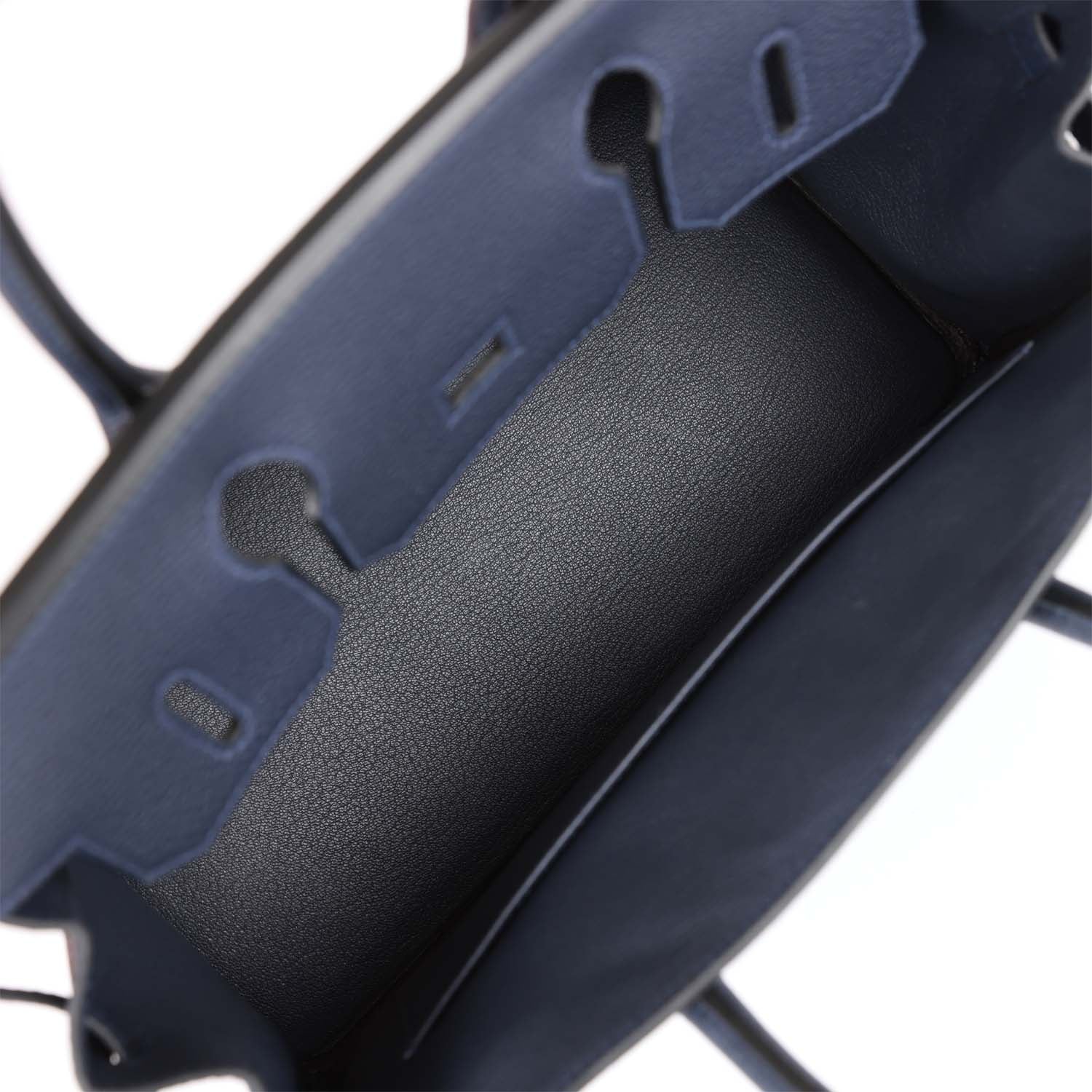 The interior is lined with Bleu Nuit chevre and has one zip pocket with an Hermes engraved zipper pull and an open pocket on the opposite side.