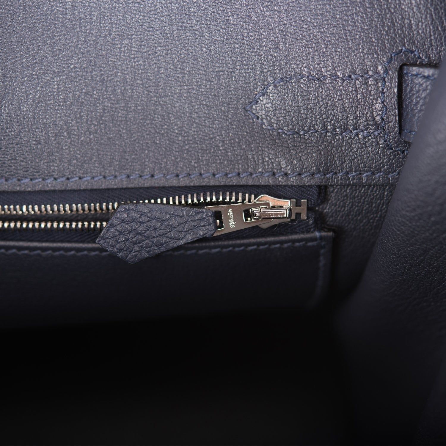 The interior is lined with Bleu Nuit chevre and has one zip pocket with an Hermes engraved zipper pull and an open pocket on the opposite side.