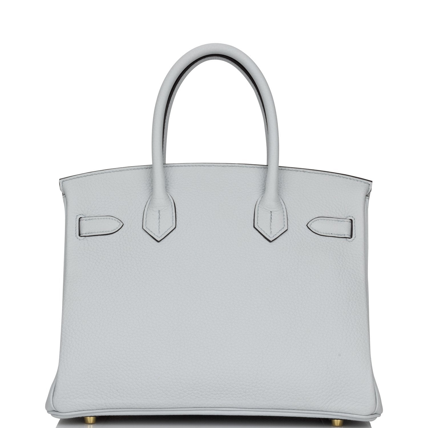 This Birkin is in Bleu Pale clemence leather with gold hardware and has tonal stitching, front flap, two straps with center toggle closure, clochette with lock and two keys, and double rolled handles.