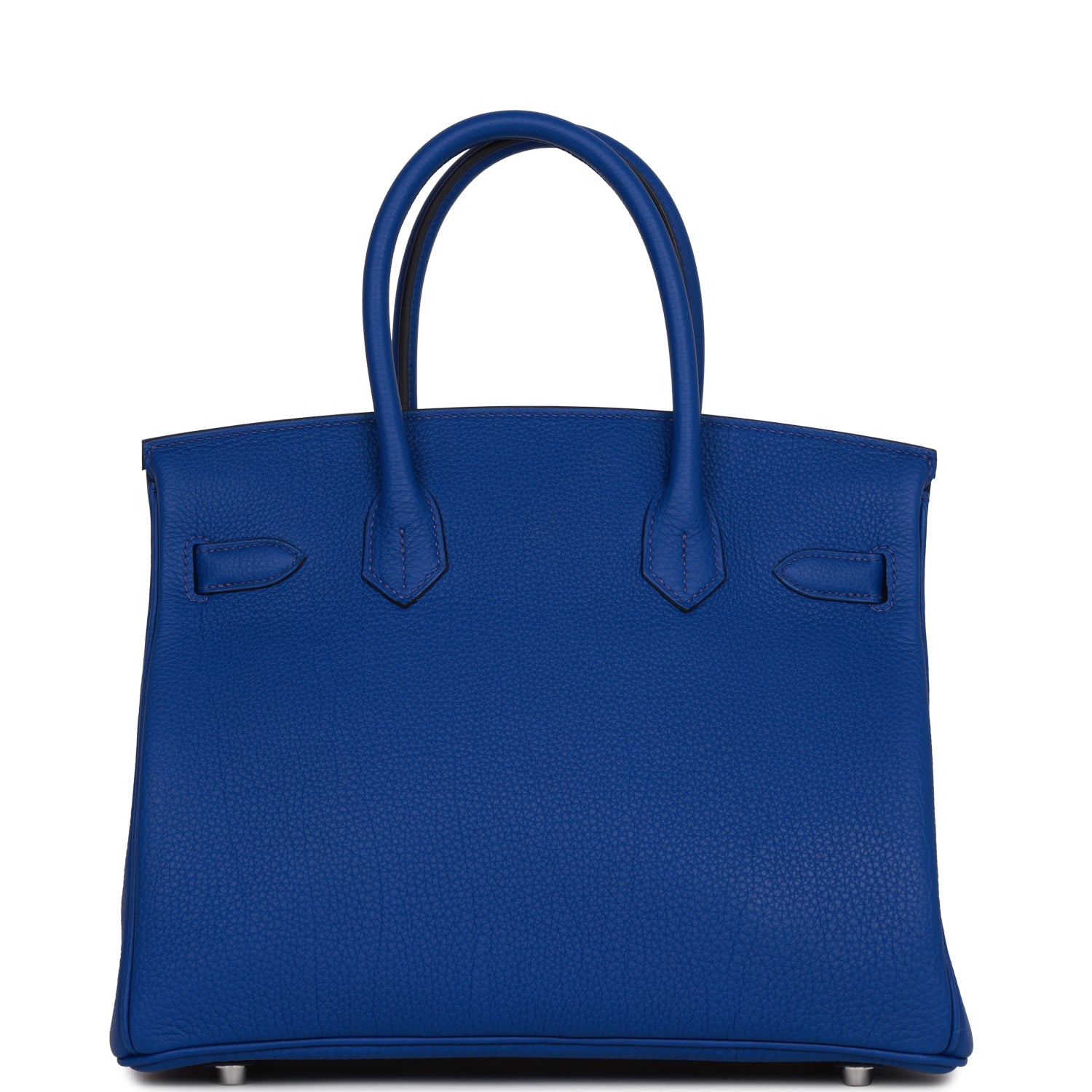 This Birkin is in Bleu Royal togo leather with palladium hardware and has tonal stitching, front flap, two straps with center toggle closure, clochette with lock and two keys, and double rolled handles.