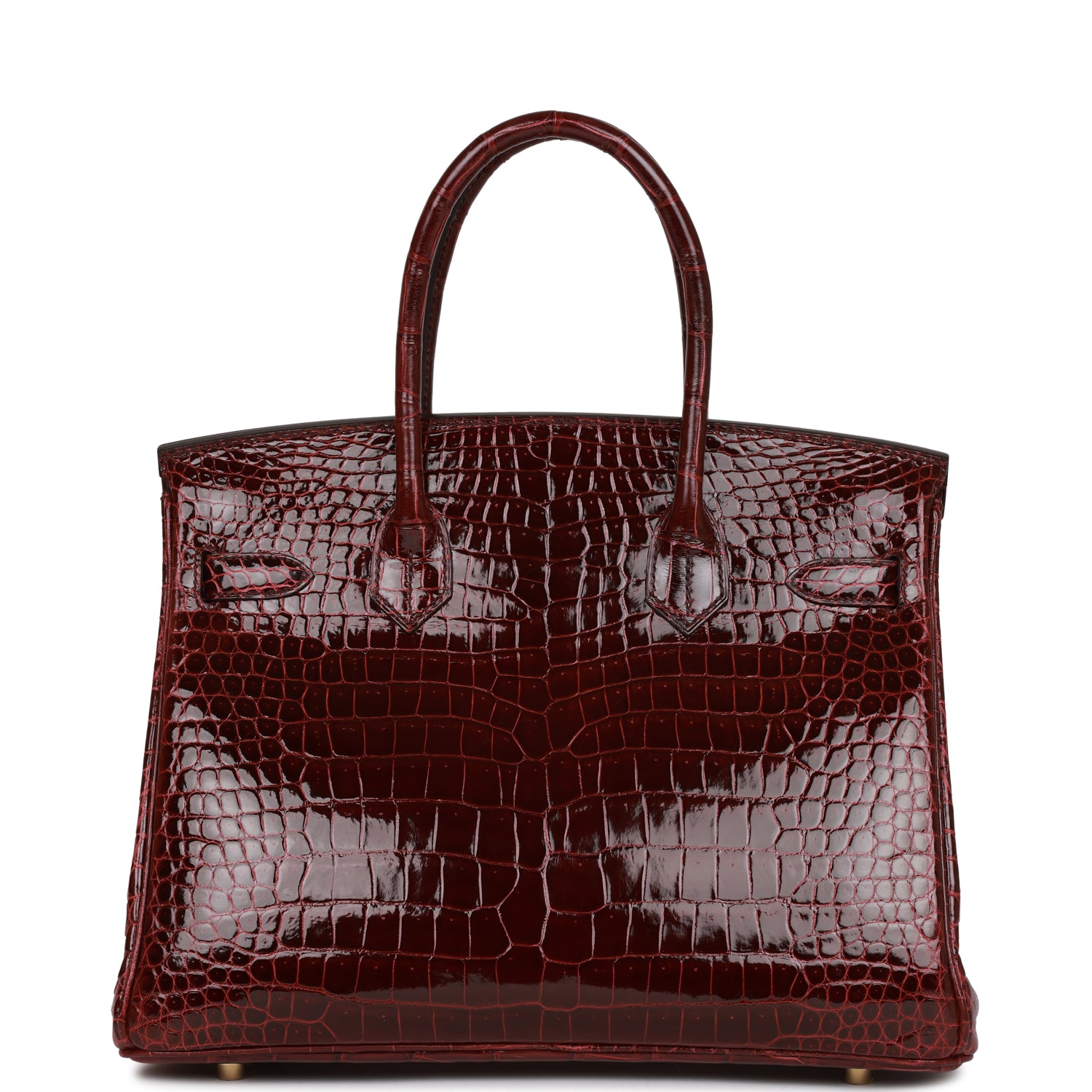 This Birkin is in Bordeaux shiny Porosus crocodile with gold hardware and has tonal stitching, front flap, two straps with center toggle closure, clochette with lock and two keys, and double rolled handles.