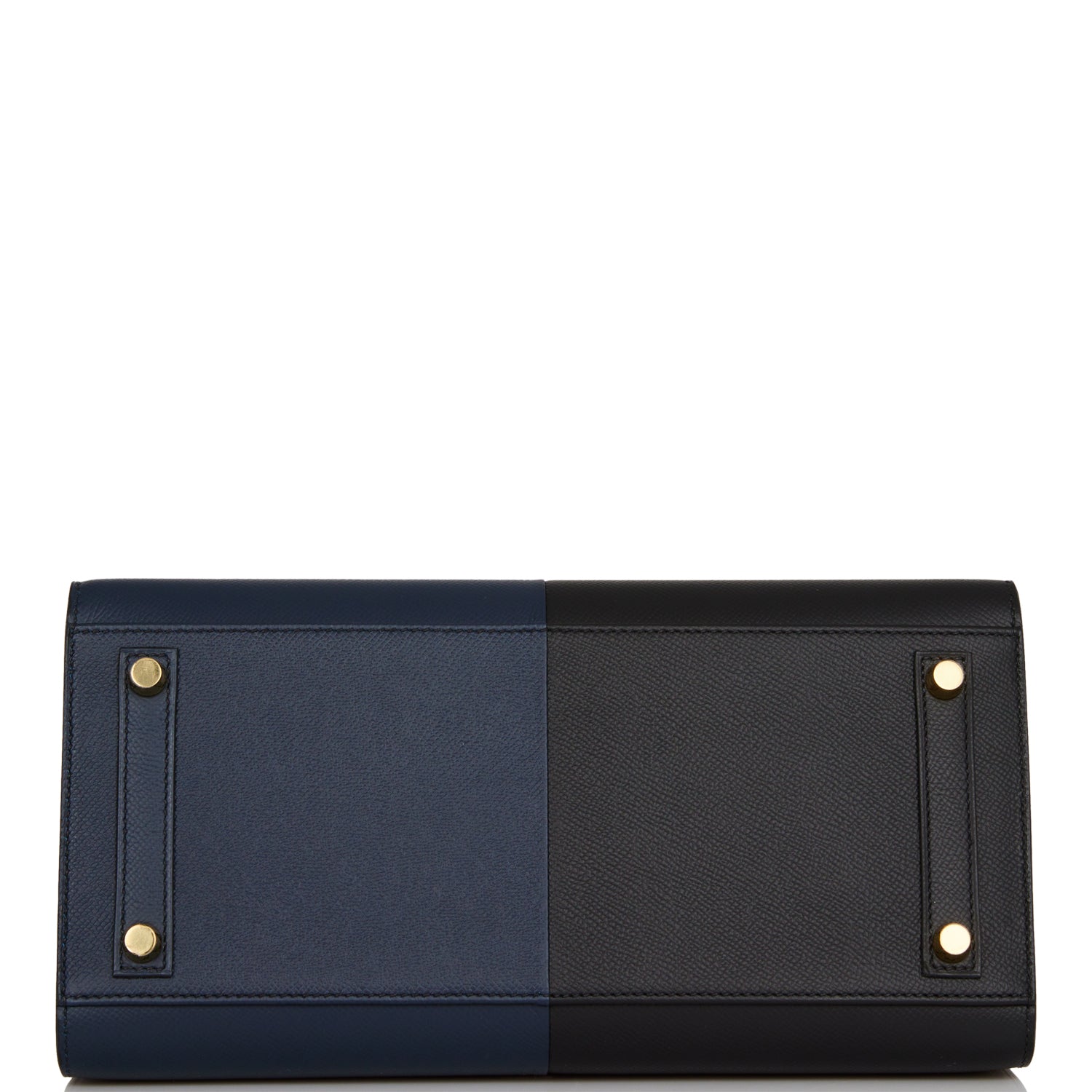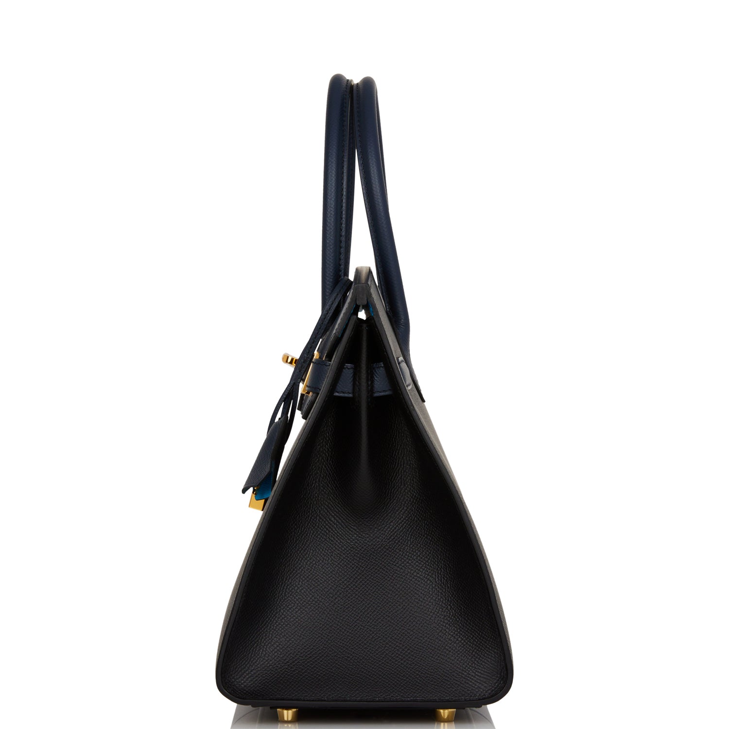 This Casaque Sellier Birkin is of Black and Bleu Indigo Epsom leather with gold hardware and has tonal stitching, front flap, two straps with center toggle closure, clochette with lock and two keys, and double rolled handles.