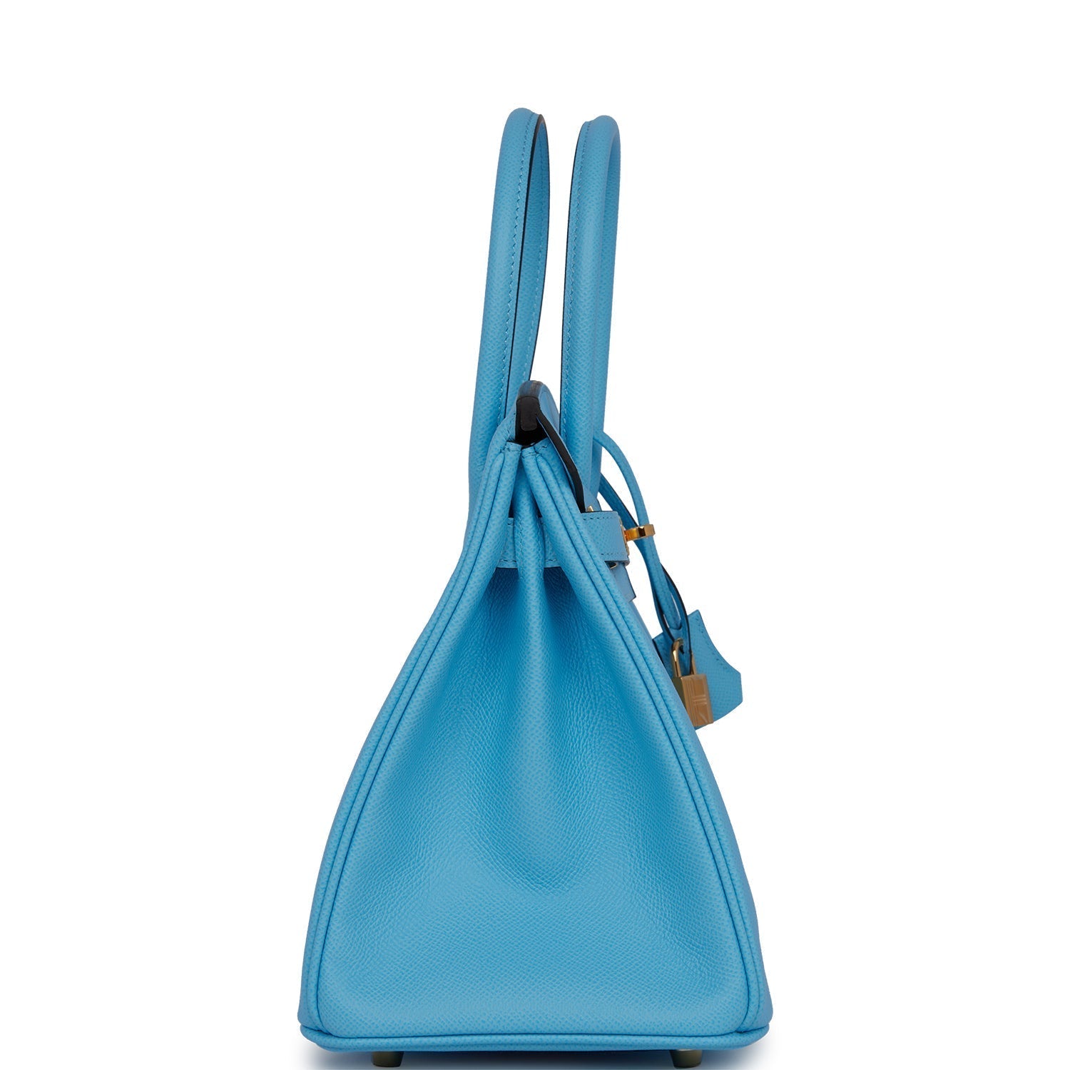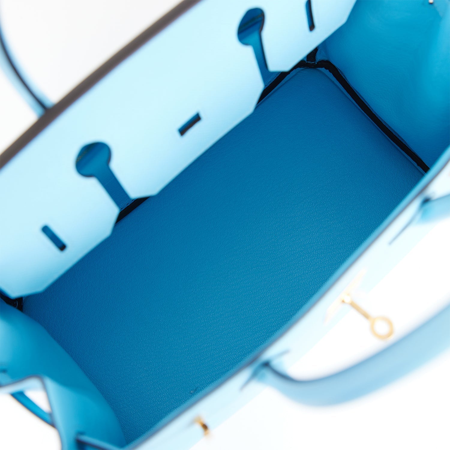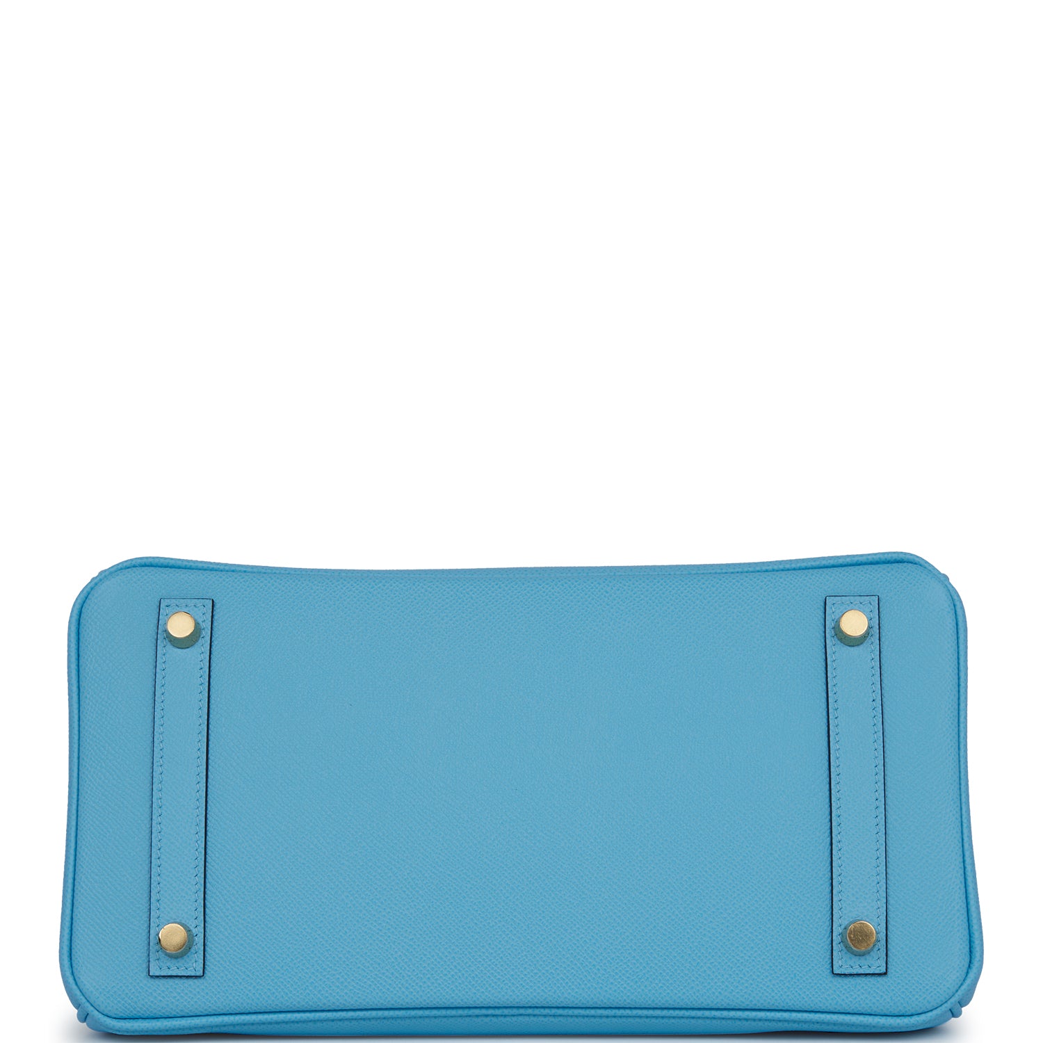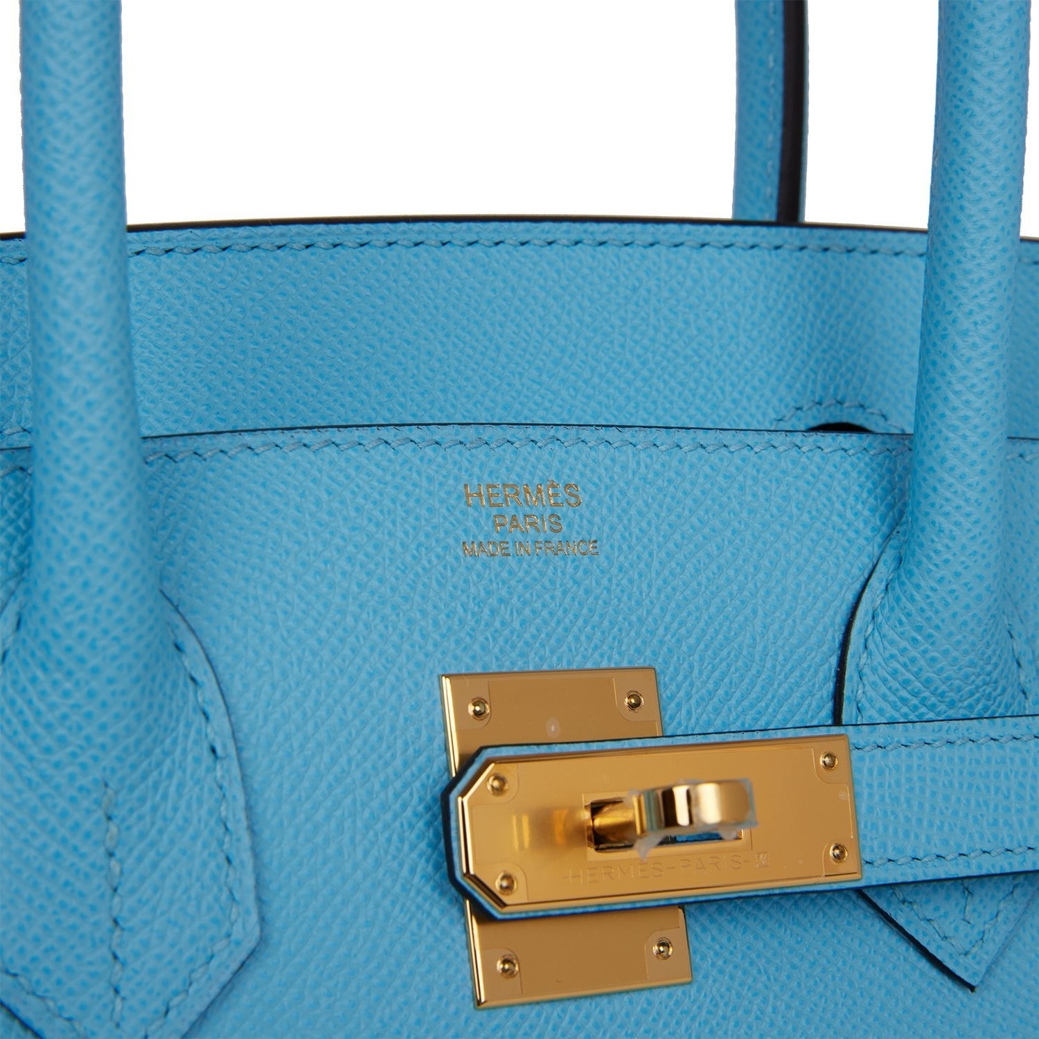 This Birkin is in Celeste epsom leather with gold hardware and has tonal stitching, front flap, two straps with center toggle closure, clochette with lock and two keys, and double rolled handles.
