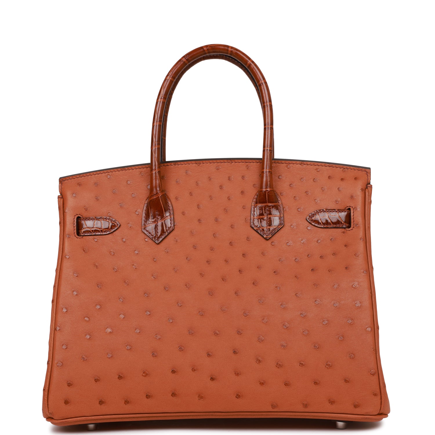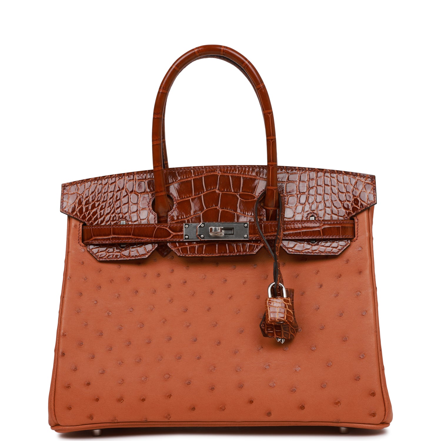 This Birkin "Touch" is in Cognac and Miel shiny alligator and ostrich with palladium hardware and has tonal stitching, two straps with front toggle closure, clochette with lock and two keys and double rolled crocodile handles.