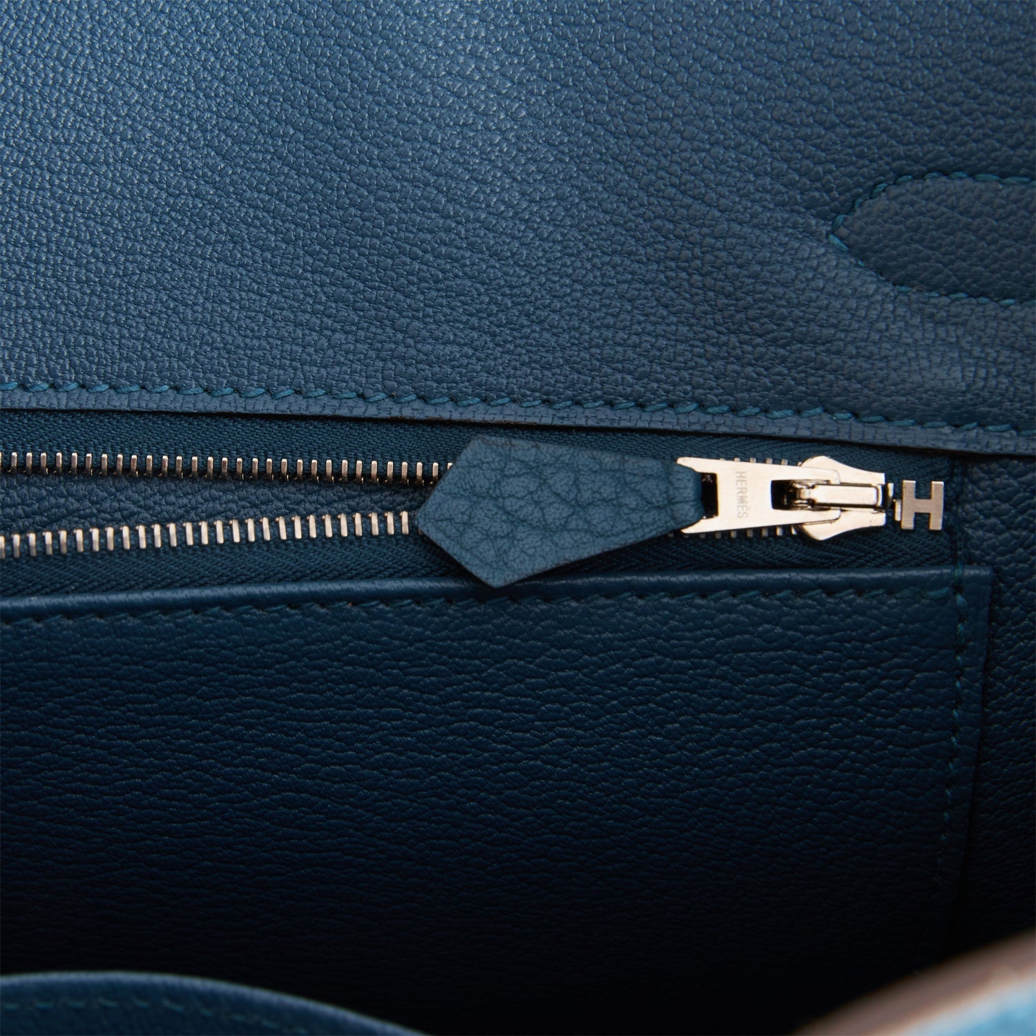 The interior is lined with Colvert chevre and has one zip pocket with an Hermes engraved zipper pull and an open pocket on the opposite side.