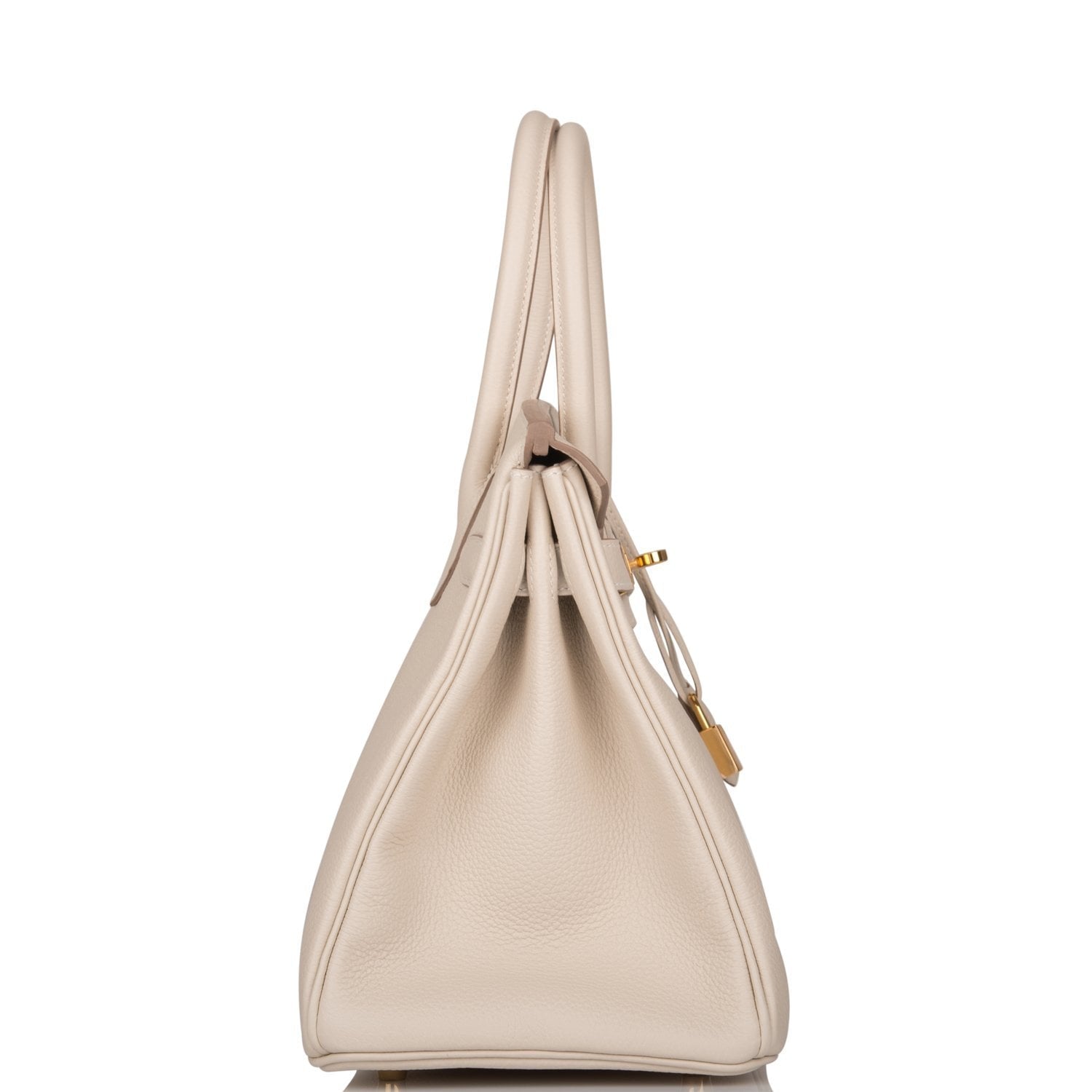 This Birkin is in Craie togo leather with gold hardware and has tonal stitching, front flap, two straps with center toggle closure, clochette with lock and two keys, and double rolled handles.
