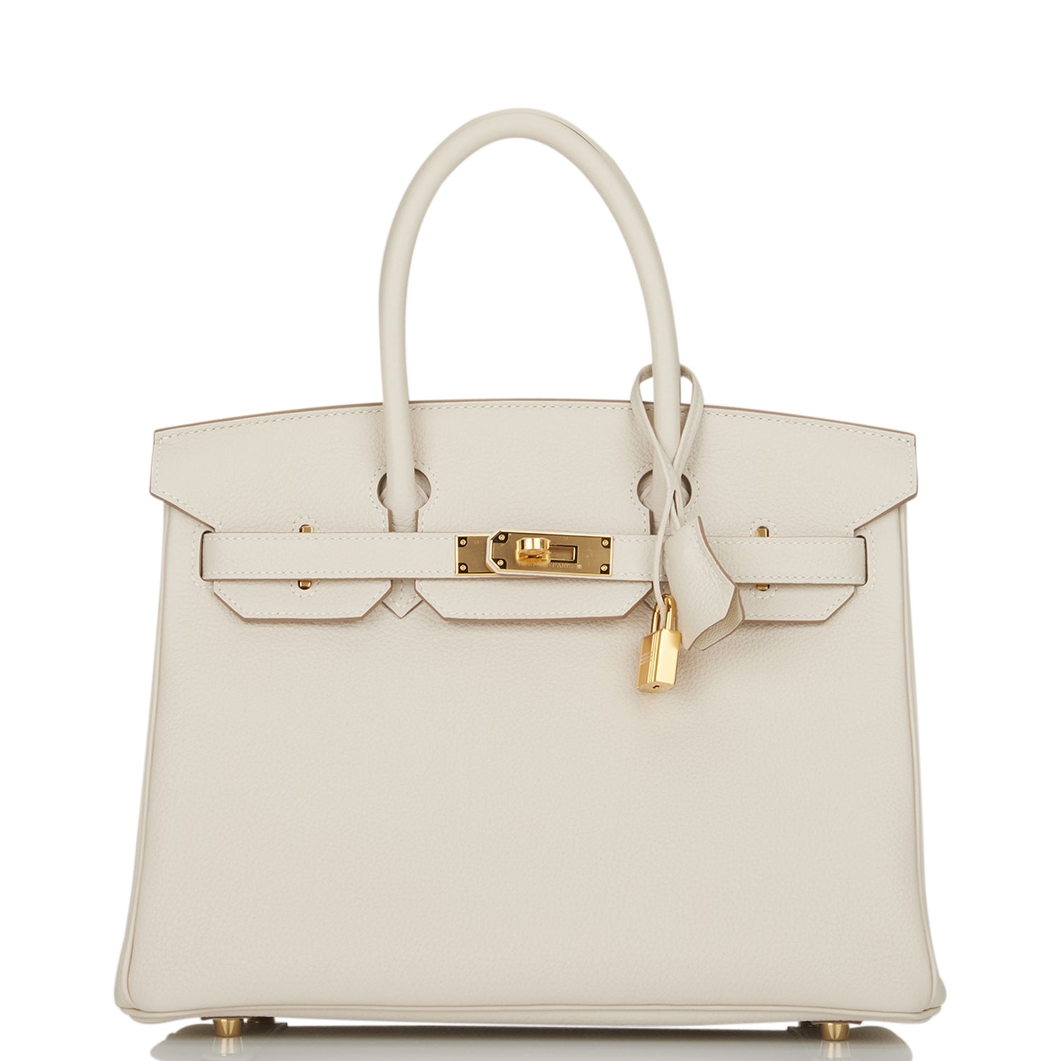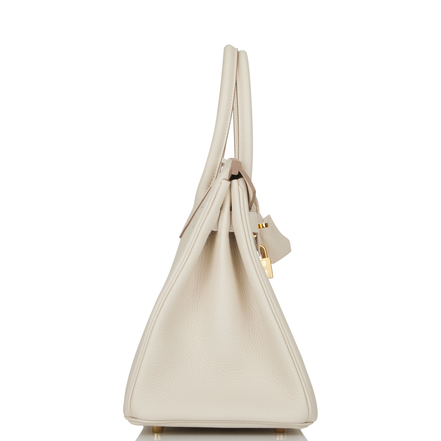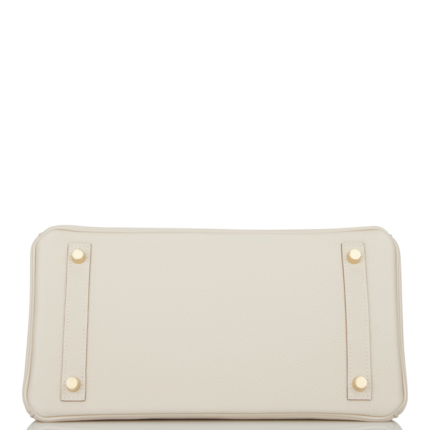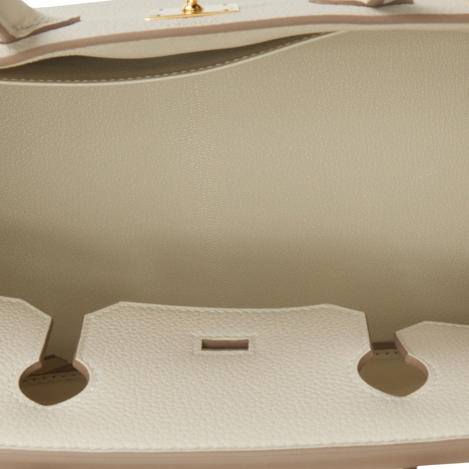 This Birkin is in Craie togo leather with gold hardware and has tonal stitching, front flap, two straps with center toggle closure, clochette with lock and two keys, and double rolled handles.