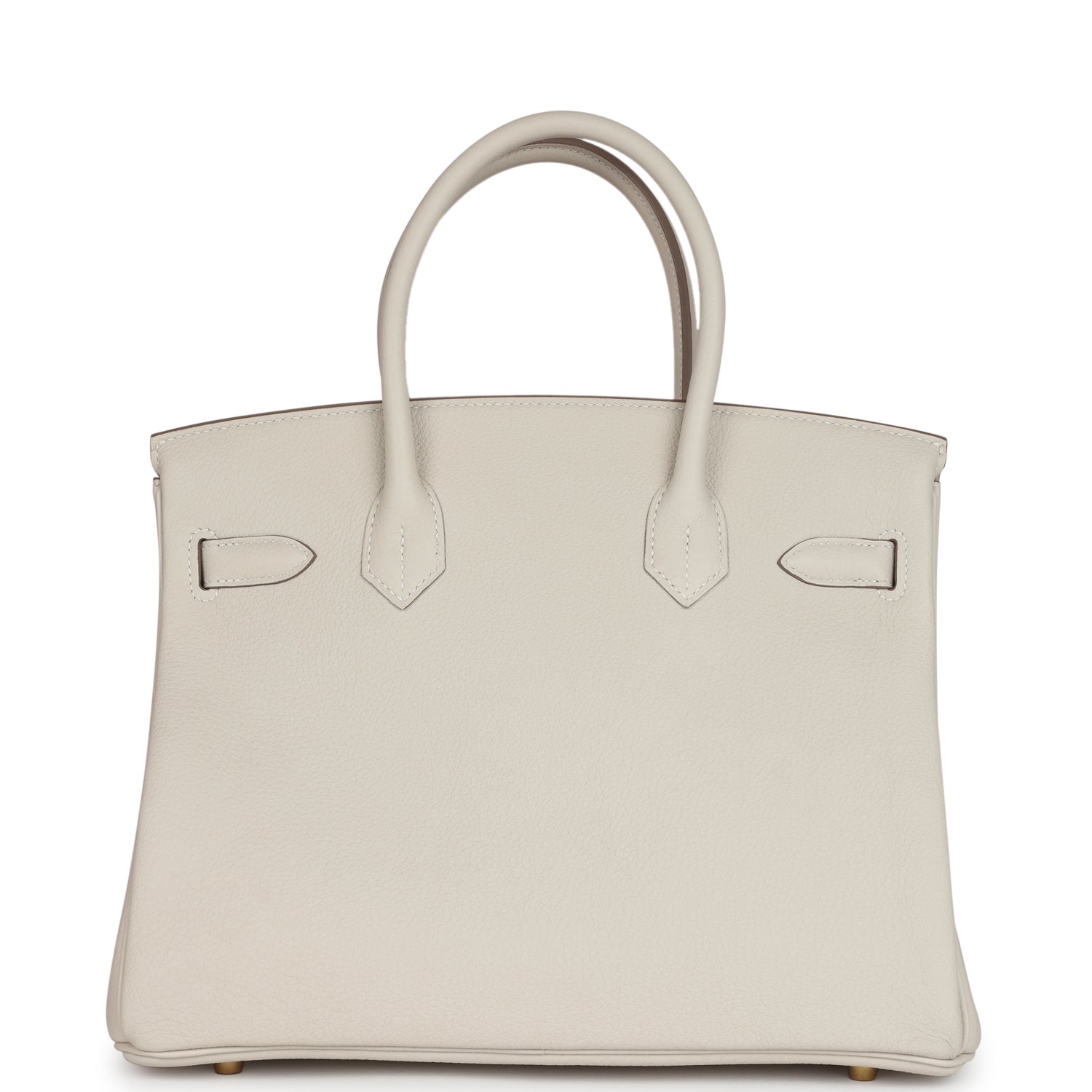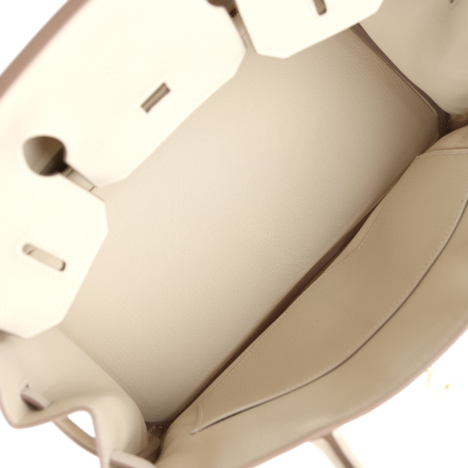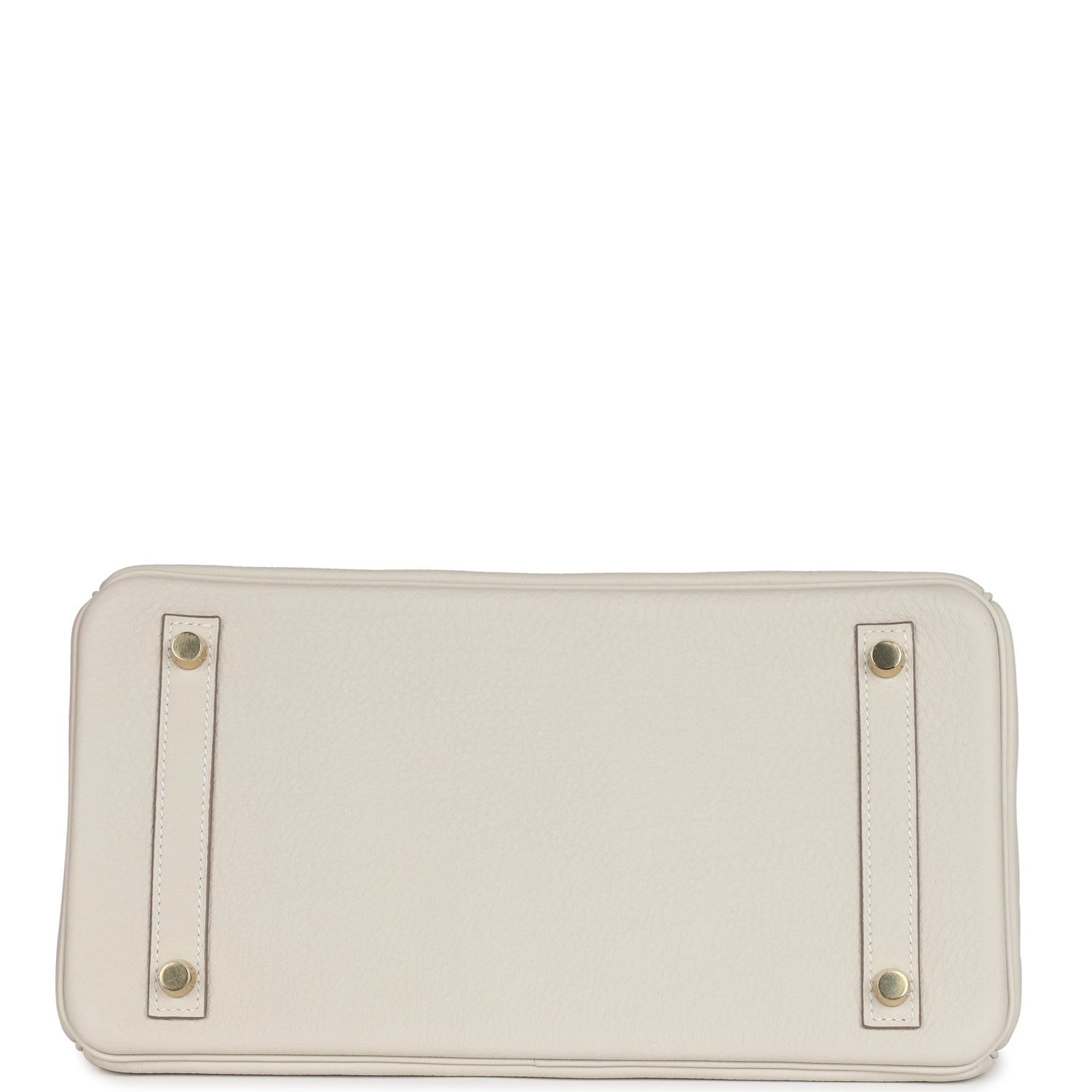 This Birkin is in Craie togo leather with gold hardware and has tonal stitching, front flap, two straps with center toggle closure, clochette with lock and two keys, and double rolled handles.