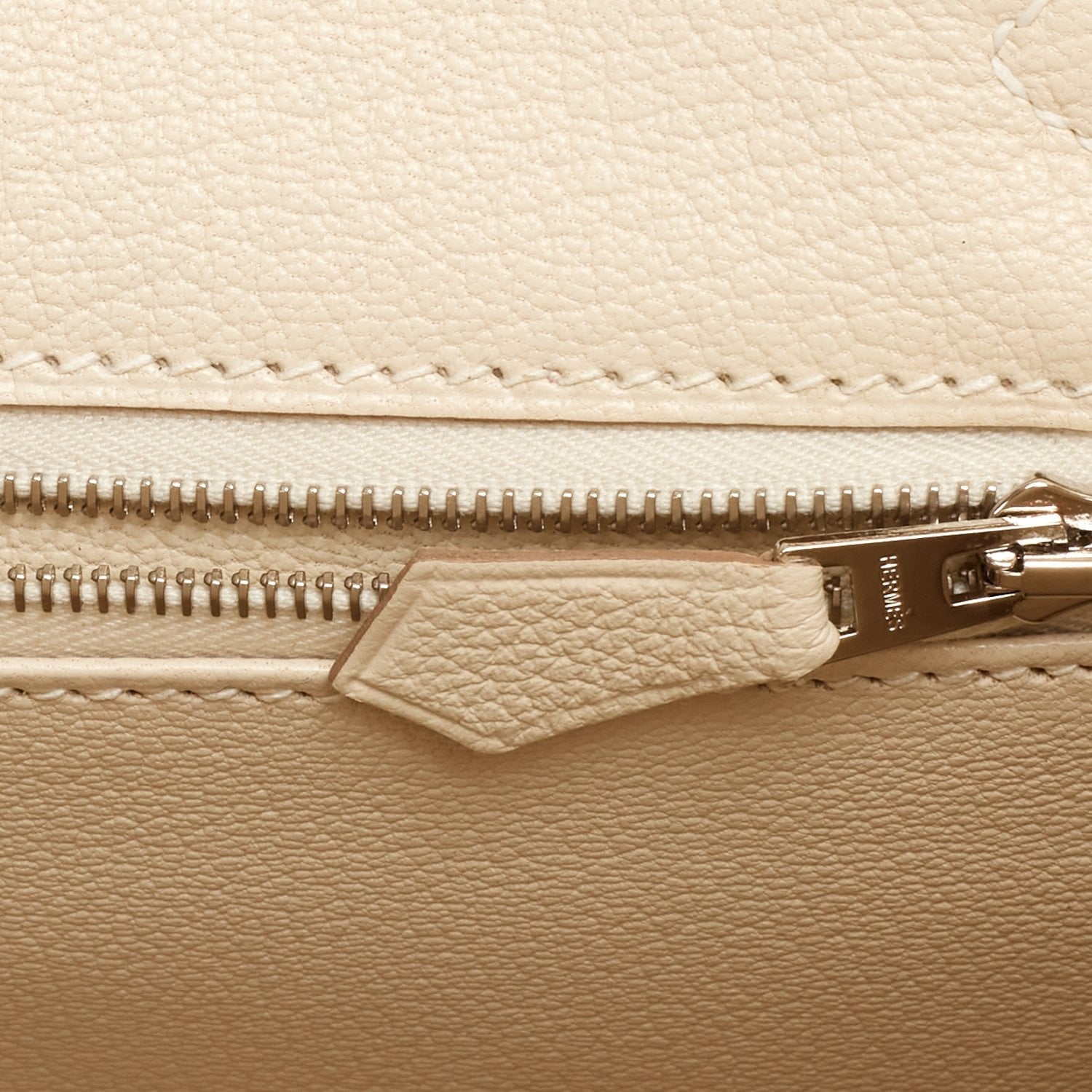 This Birkin is in Craie togo leather with palladium hardware and has tonal stitching, front flap, two straps with center toggle closure, clochette with lock and two keys, and double rolled handles.