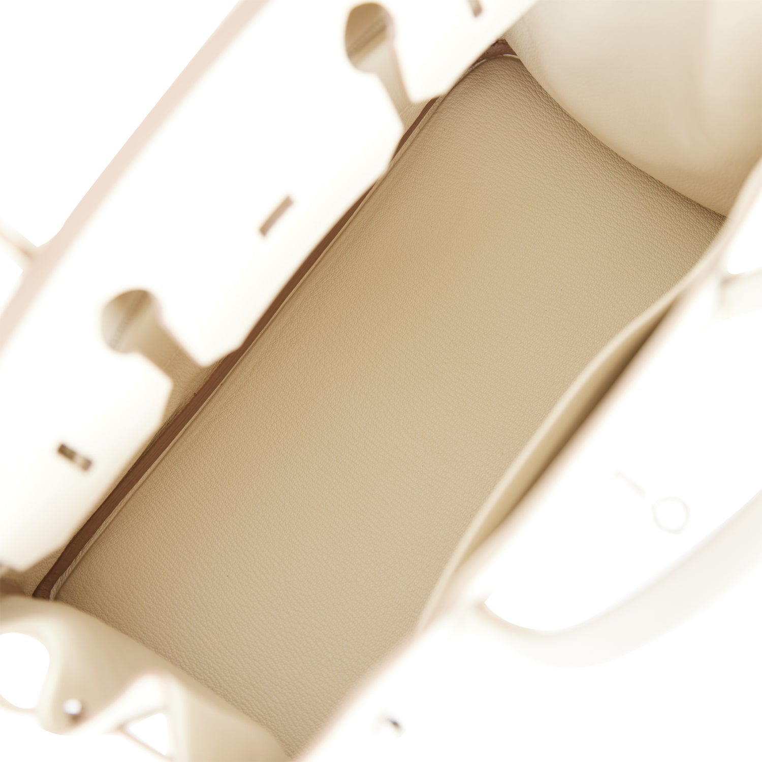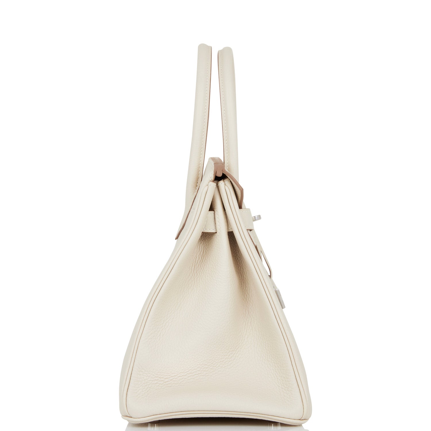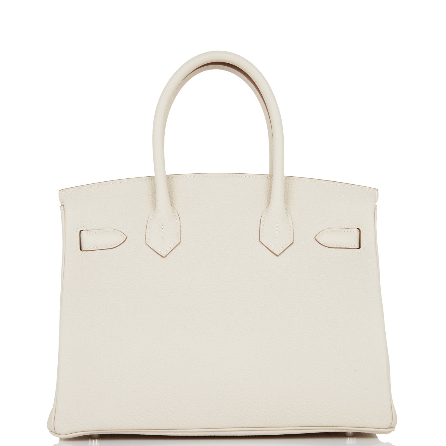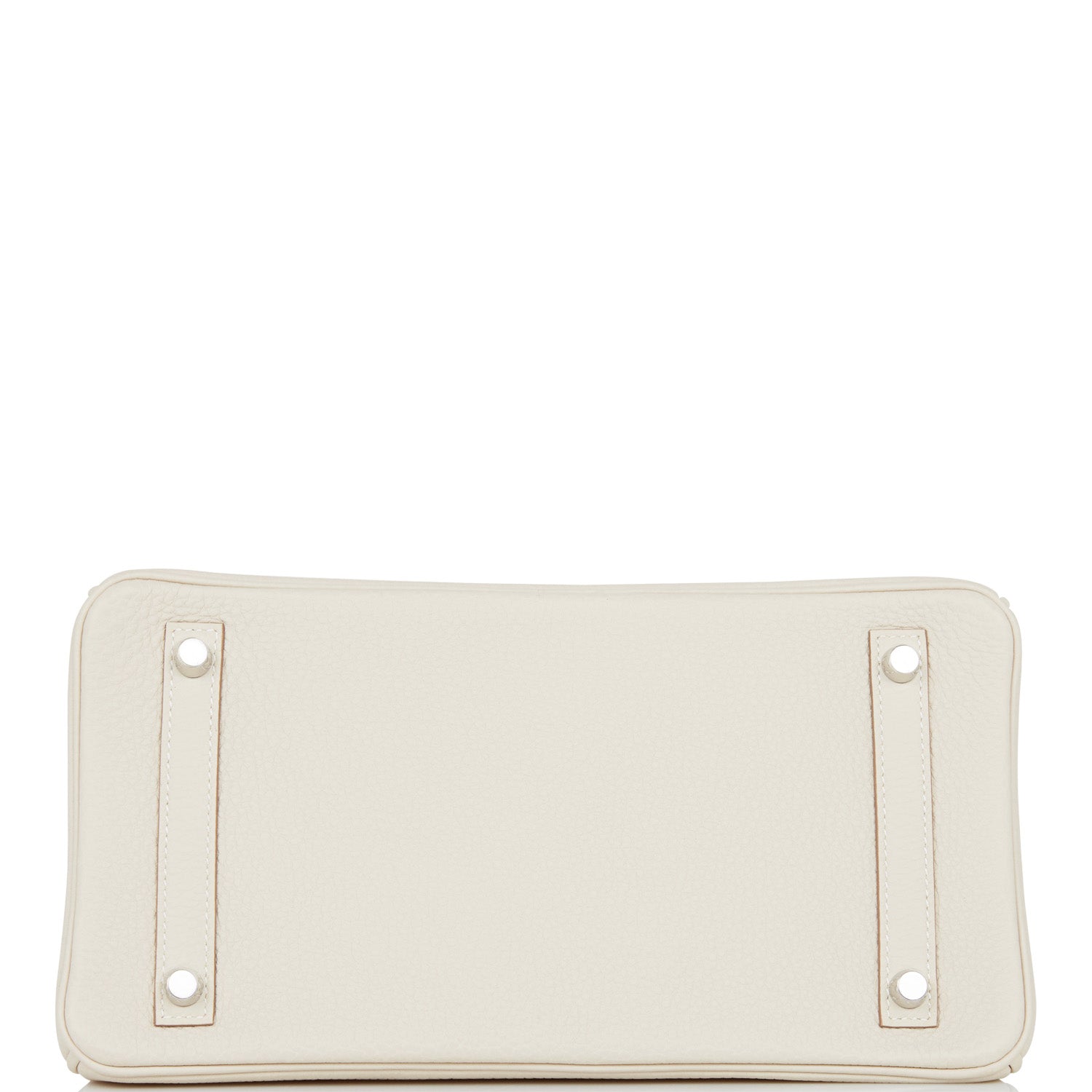 This Birkin is in Craie togo leather with palladium hardware and has tonal stitching, front flap, two straps with center toggle closure, clochette with lock and two keys, and double rolled handles.