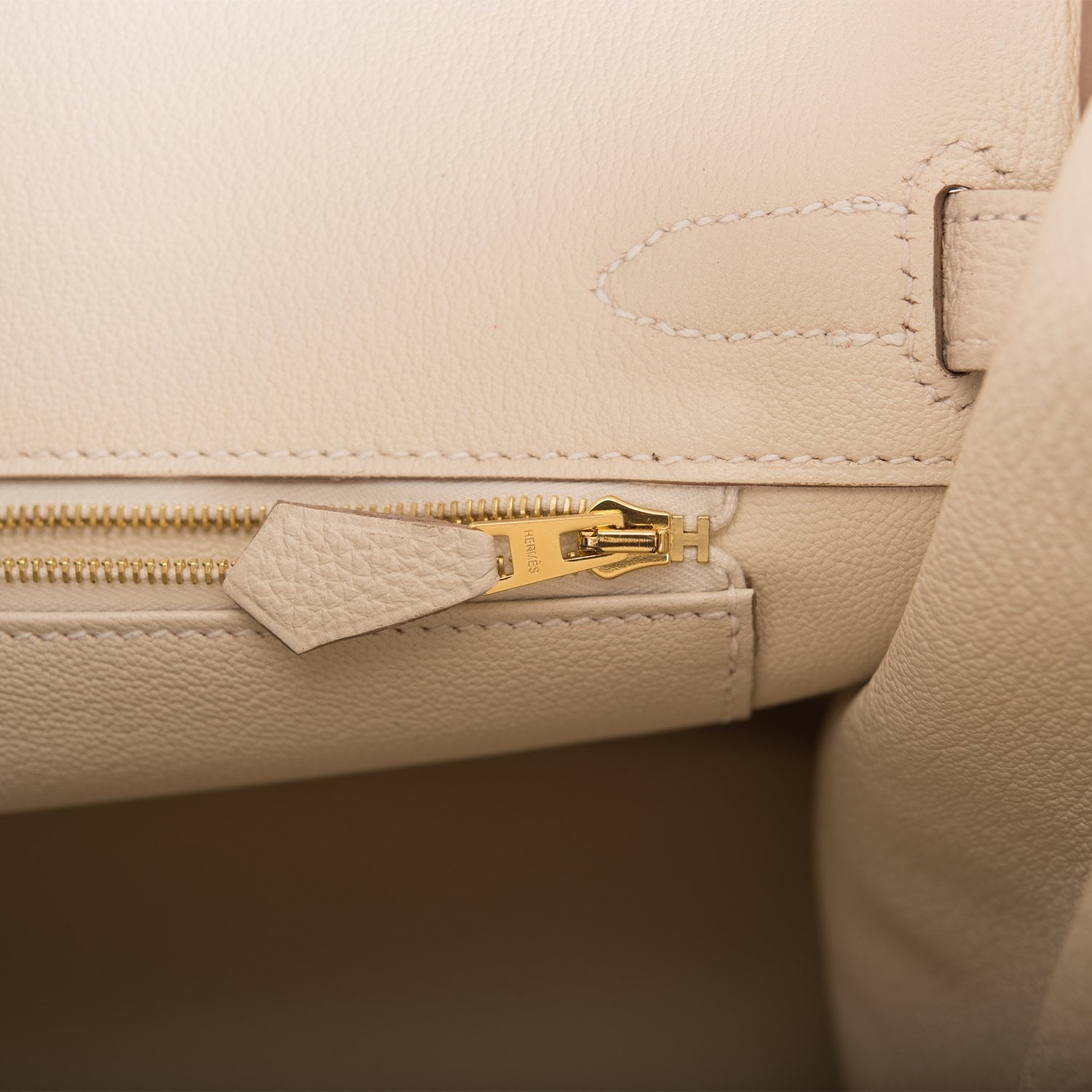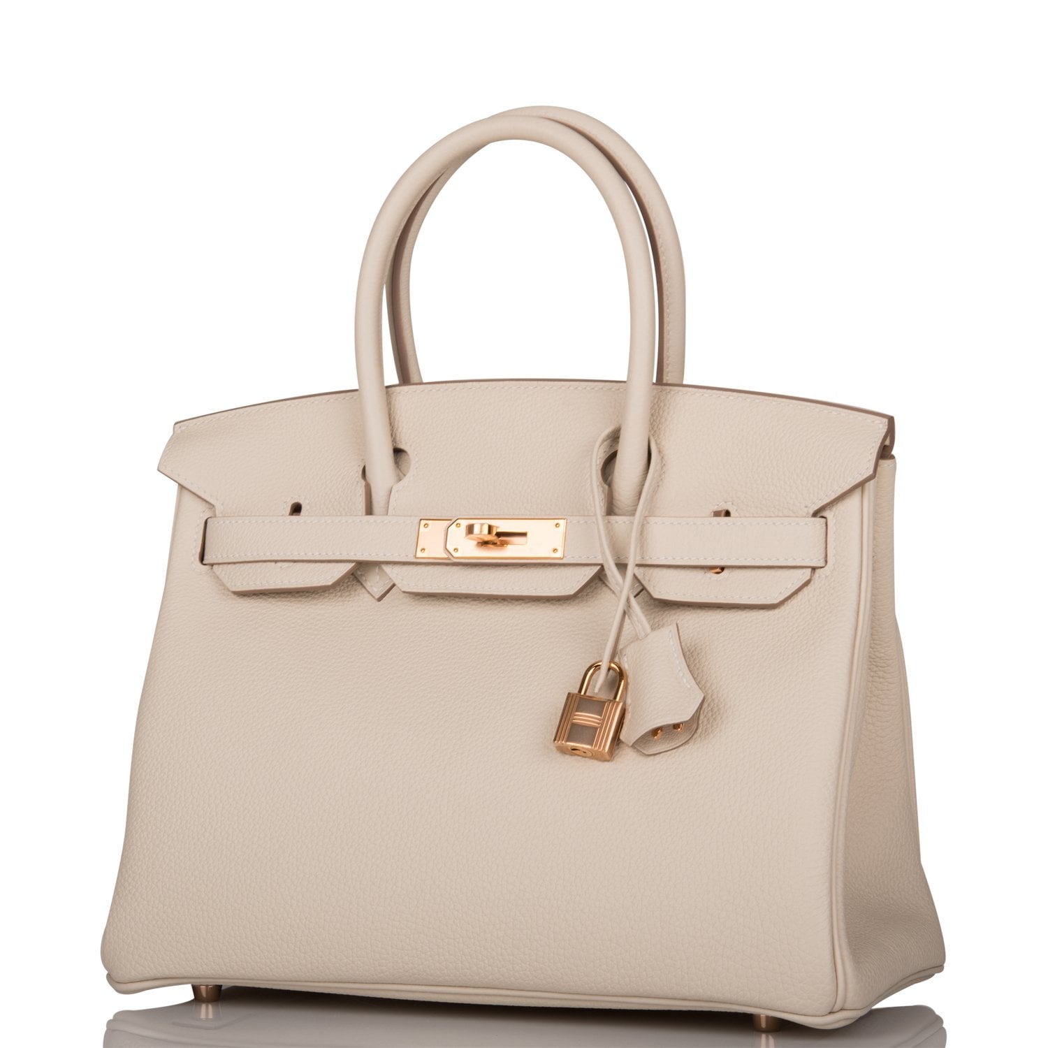 This Birkin is in Craie togo leather with rose gold hardware and has tonal stitching, front flap, two straps with center toggle closure, clochette with lock and two keys, and double rolled handles.