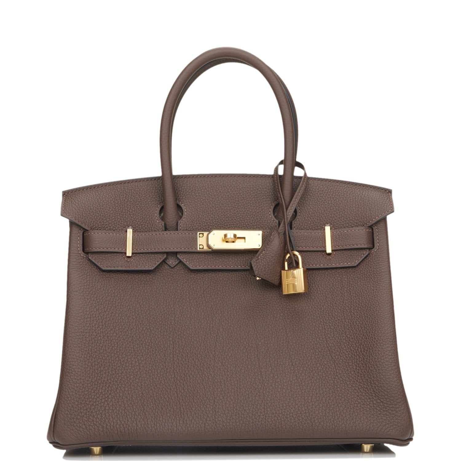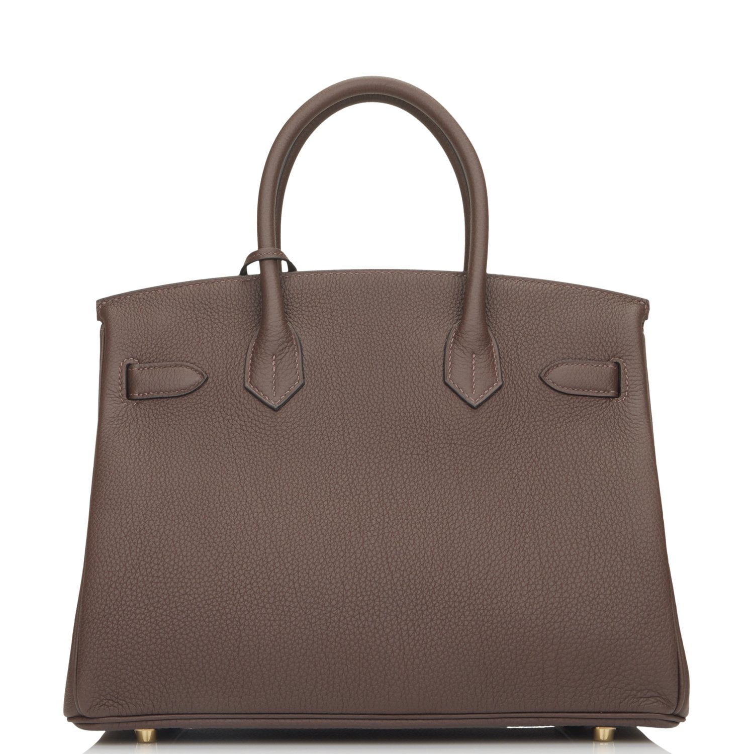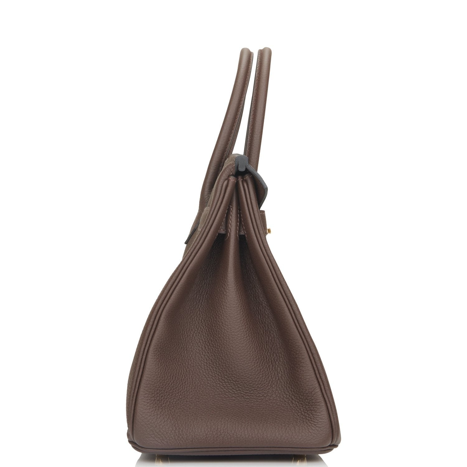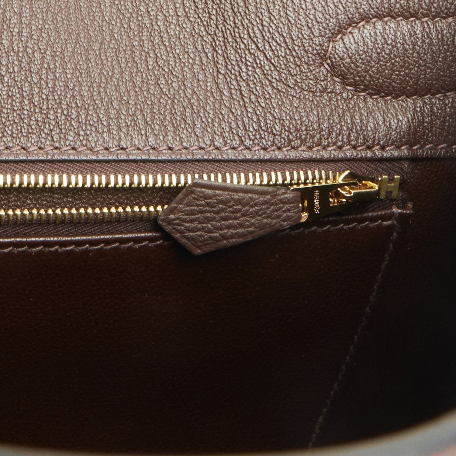 This Birkin is in Ebene togo leather with gold hardware and has tonal stitching, front flap, two straps with center toggle closure, clochette with lock and two keys, and double rolled handles.
