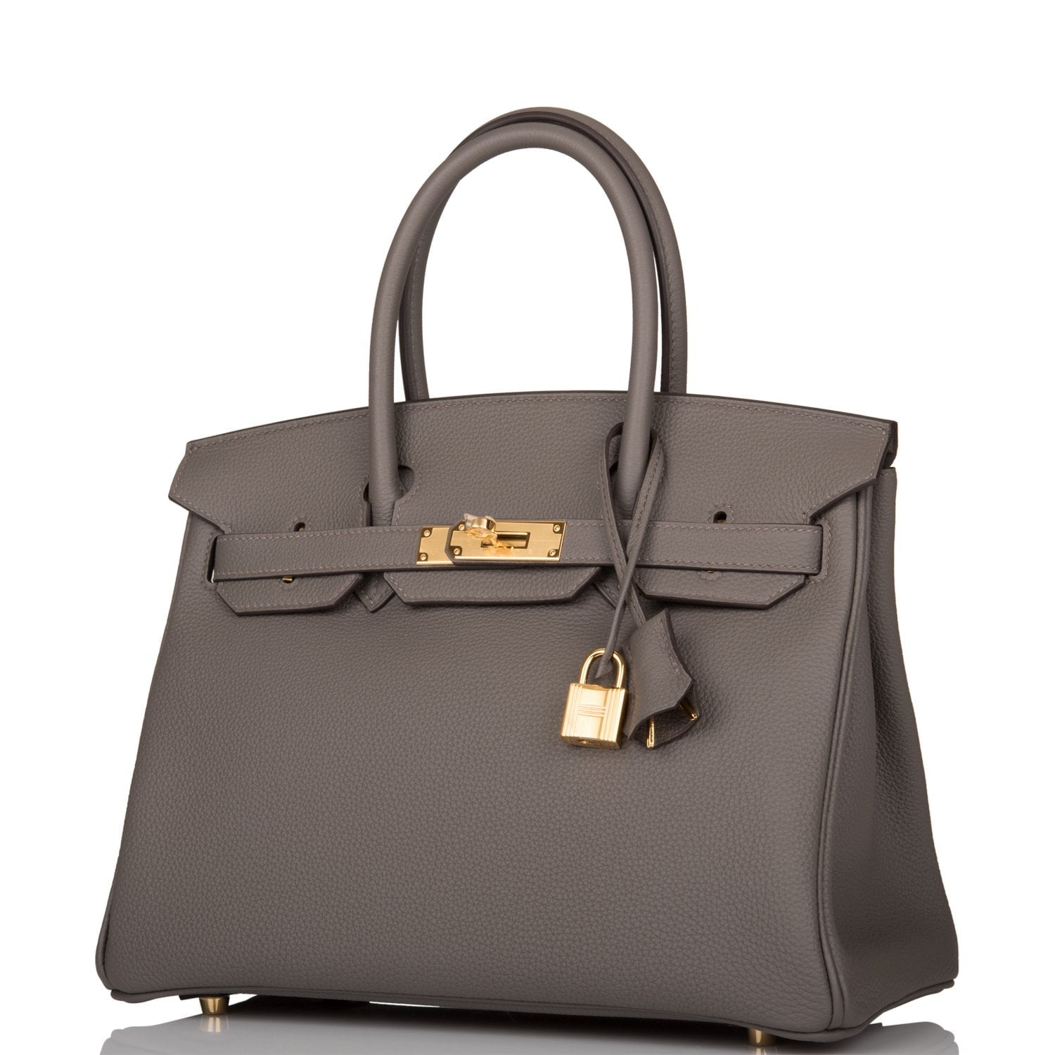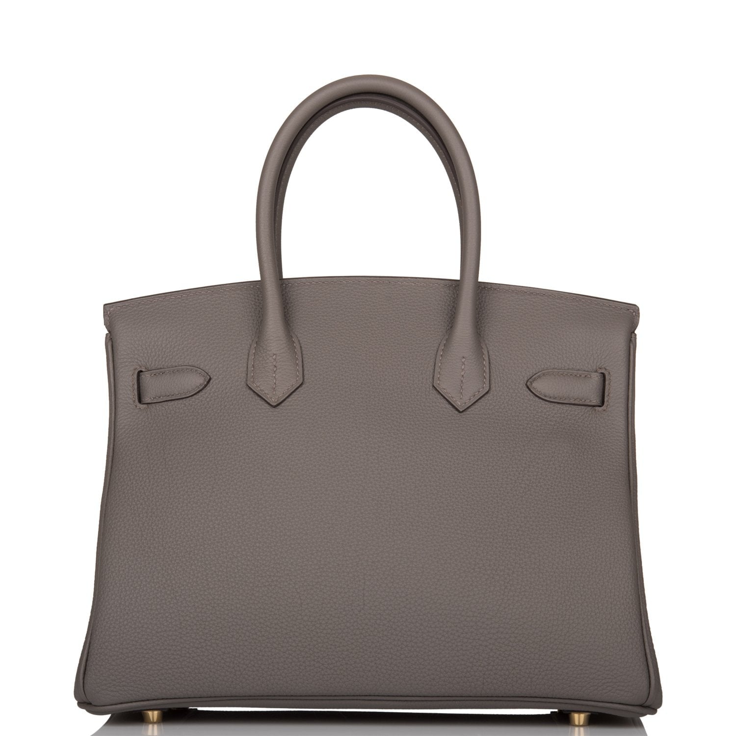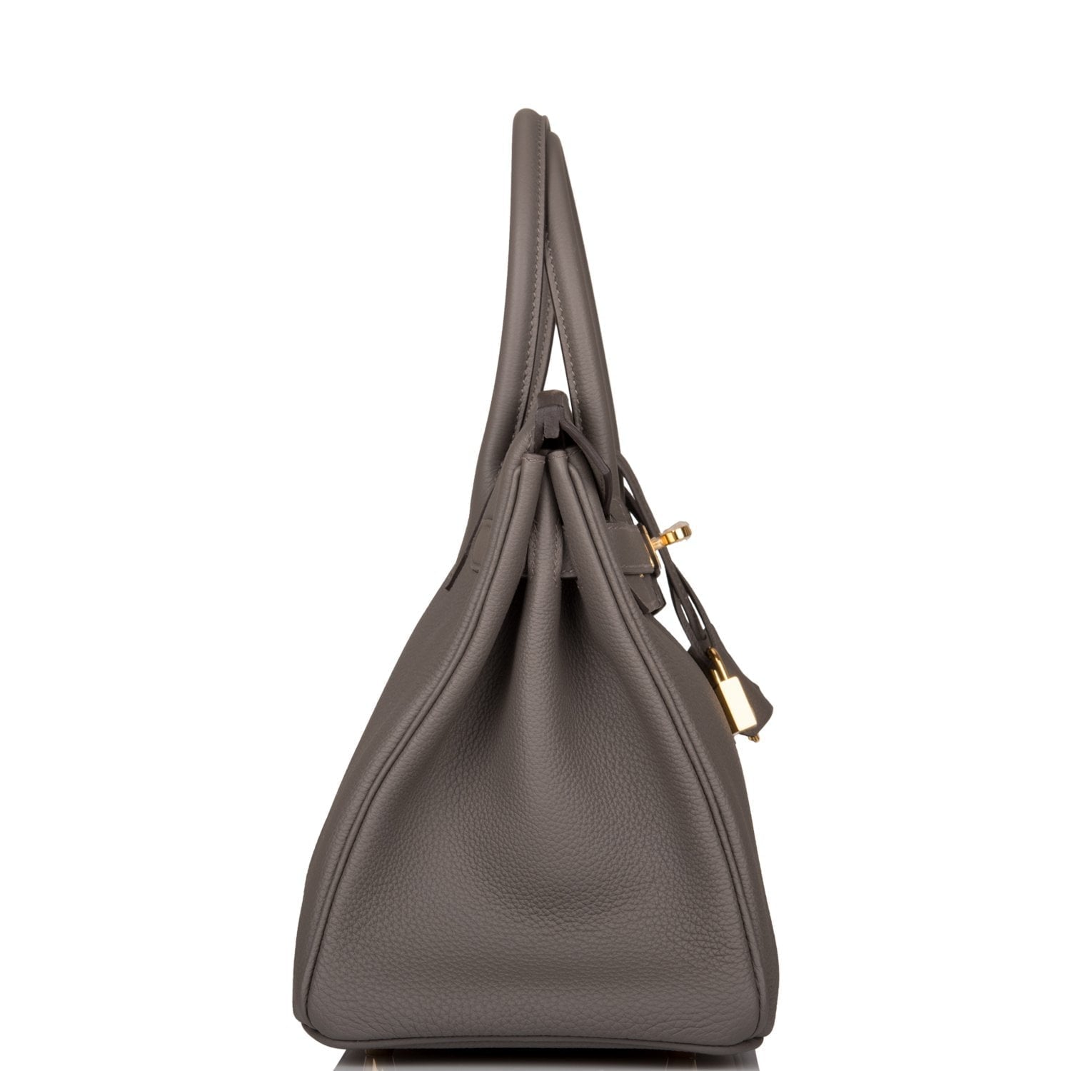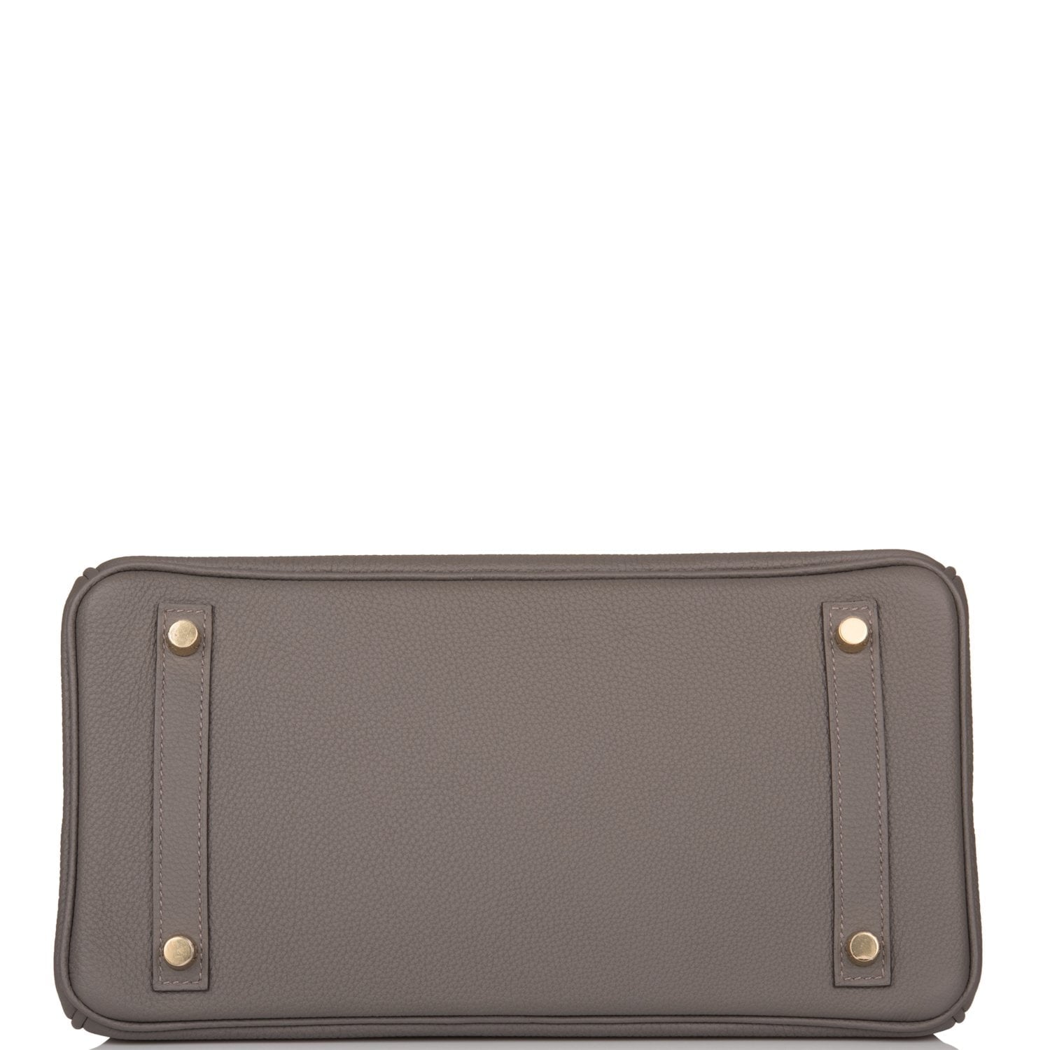 This Birkin is in Etain togo leather with gold hardware and has tonal stitching, front flap, two straps with center toggle closure, clochette with lock and two keys, and double rolled handles.
