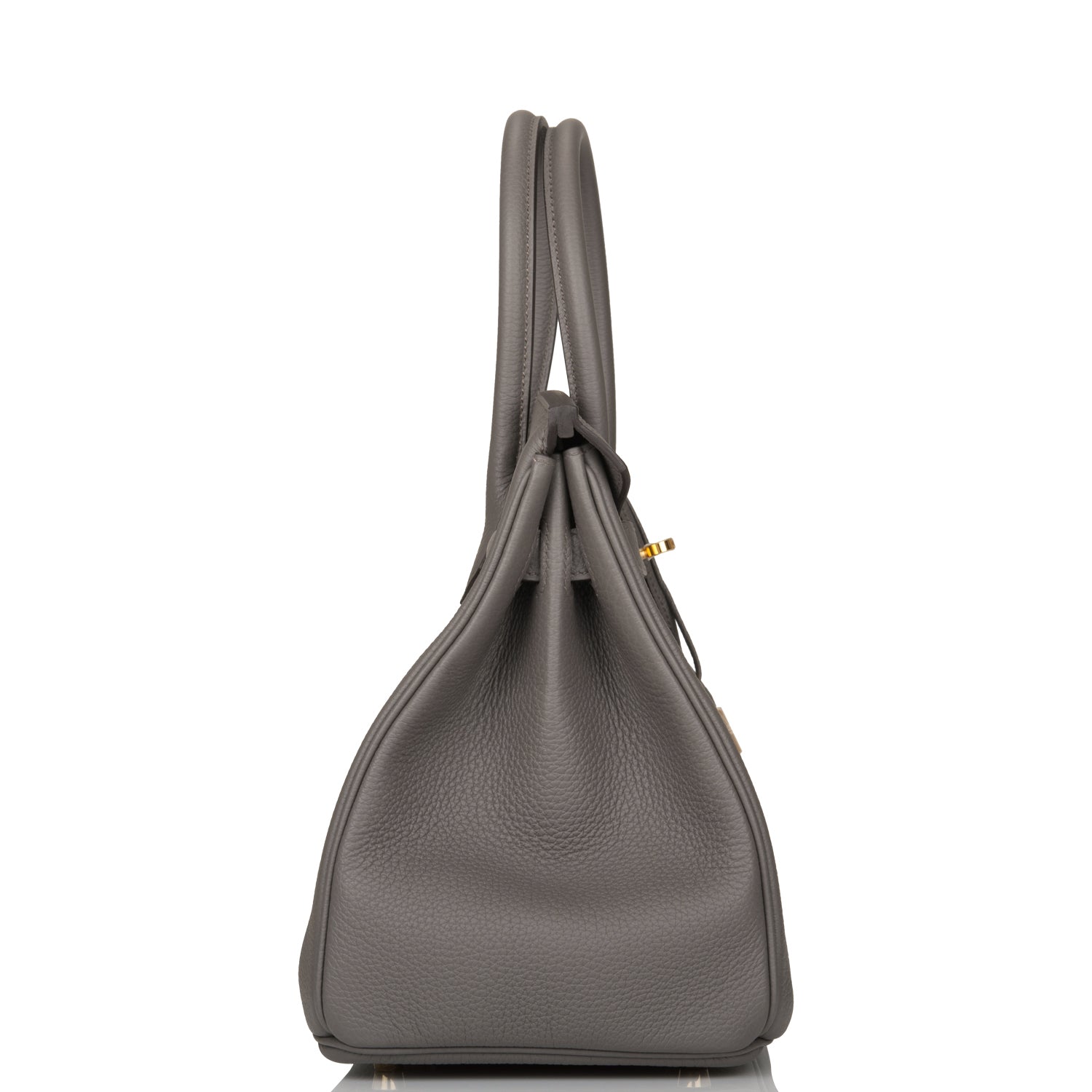 This Birkin is in Etain togo leather with gold hardware and has tonal stitching, front flap, two straps with center toggle closure, clochette with lock and two keys, and double rolled handles.