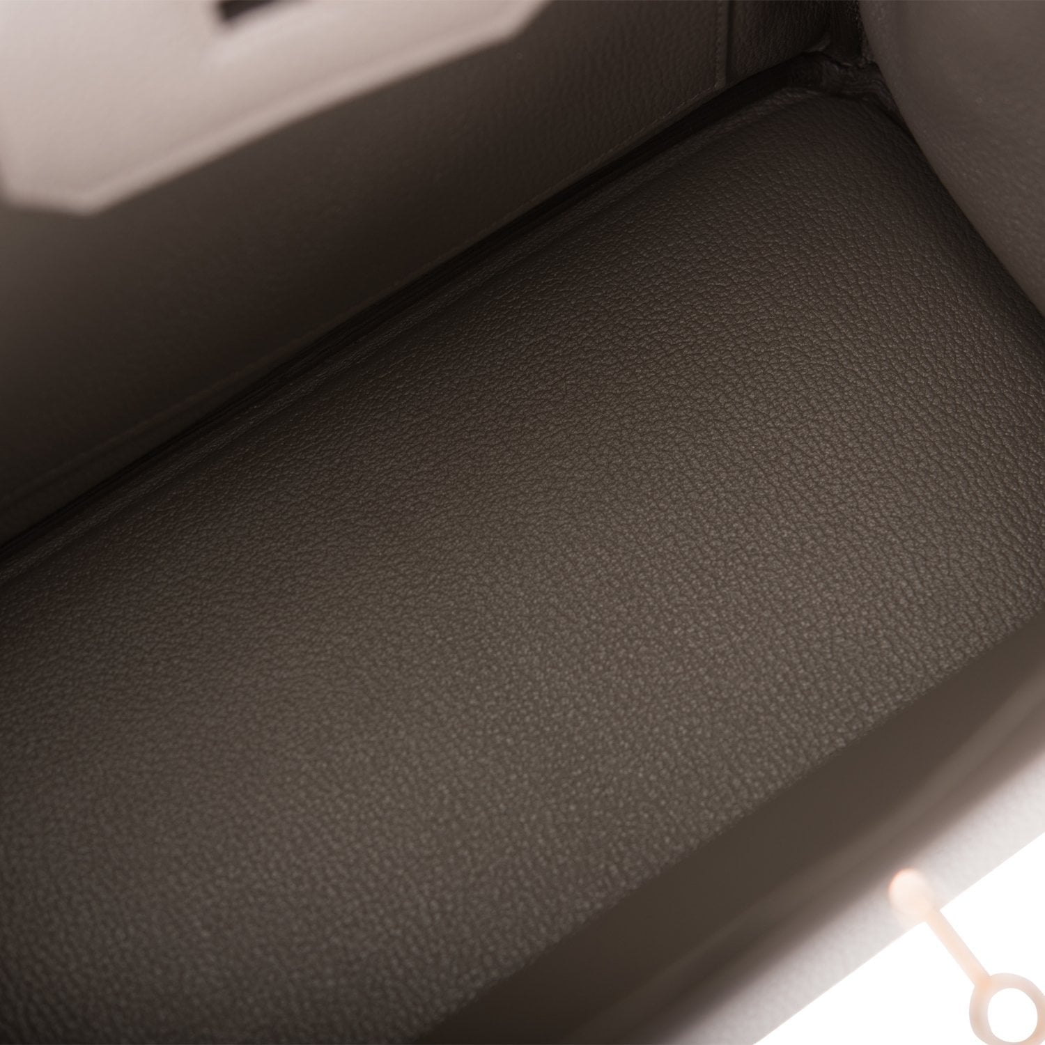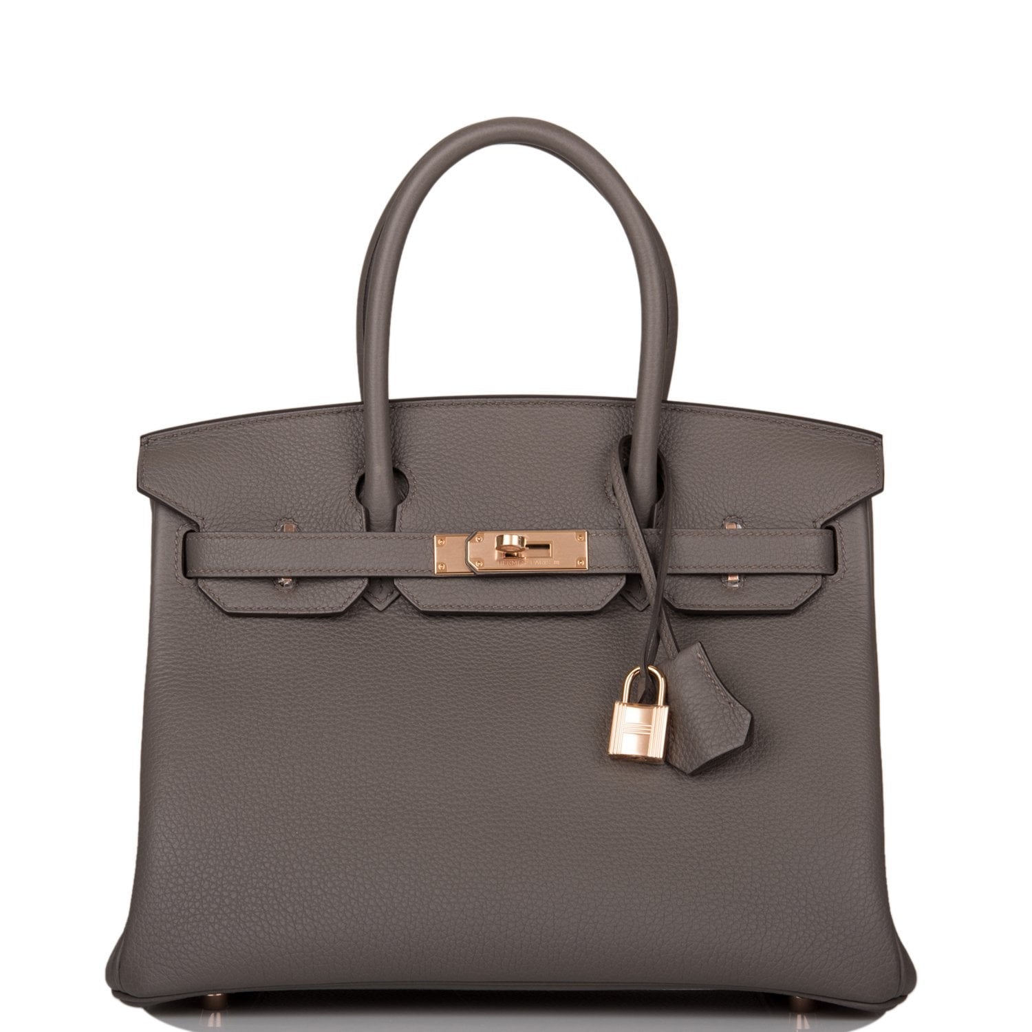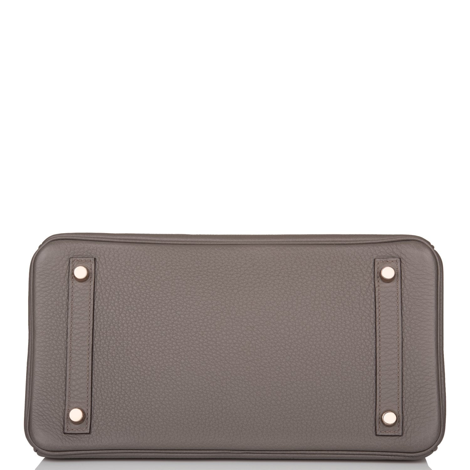 This Birkin is in Etain togo leather with rose gold hardware and has tonal stitching, front flap, two straps with center toggle closure, clochette with lock and two keys, and double rolled handles.