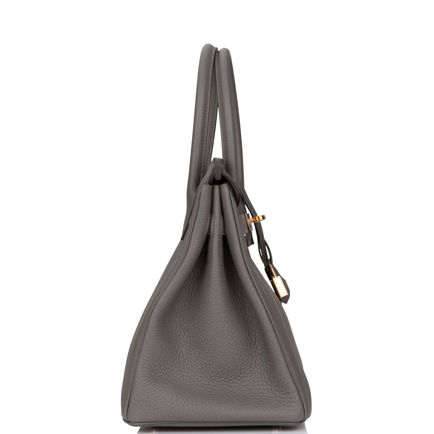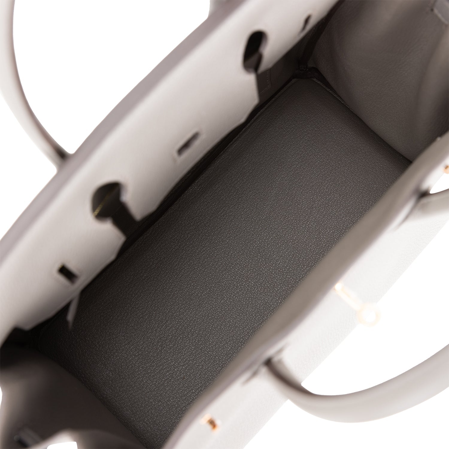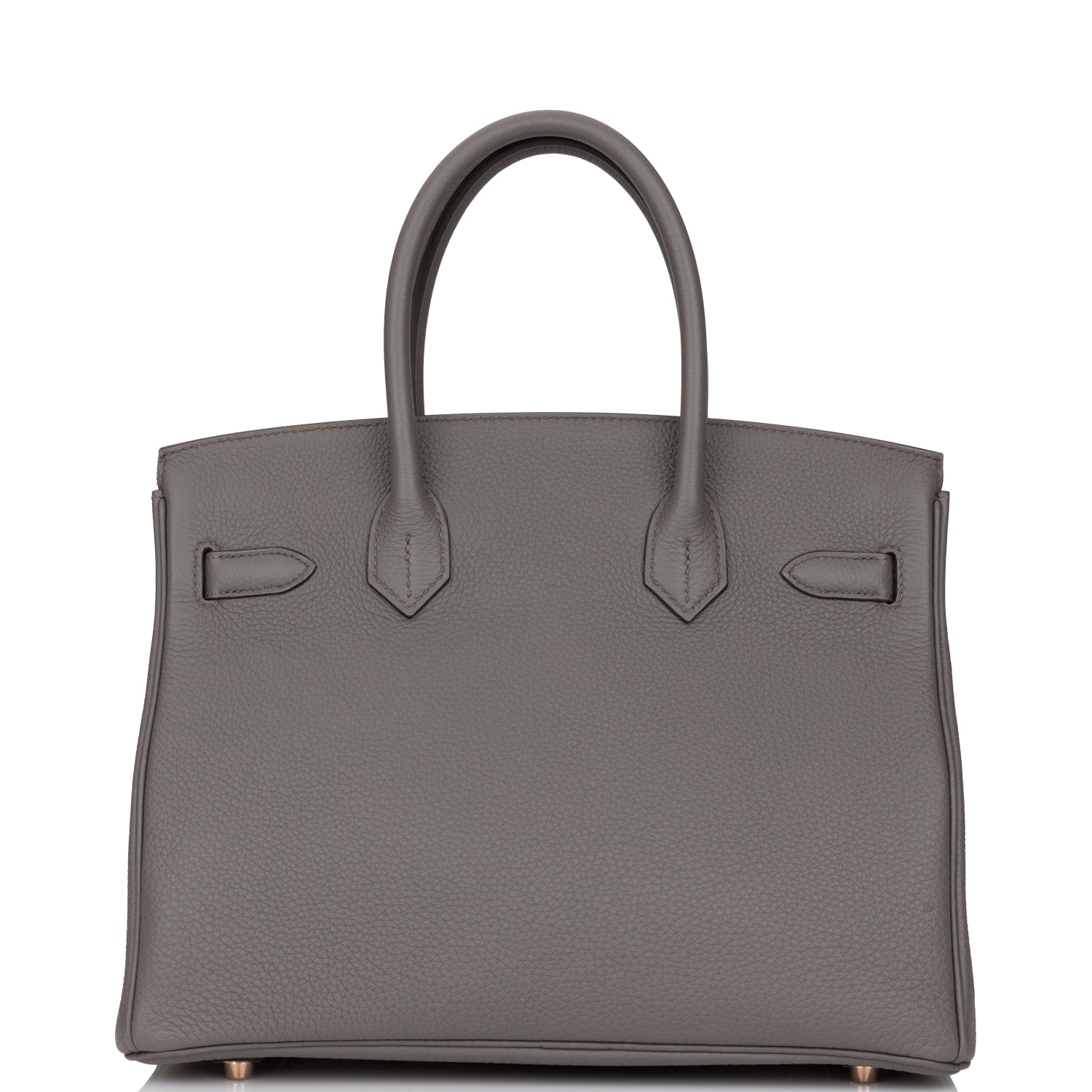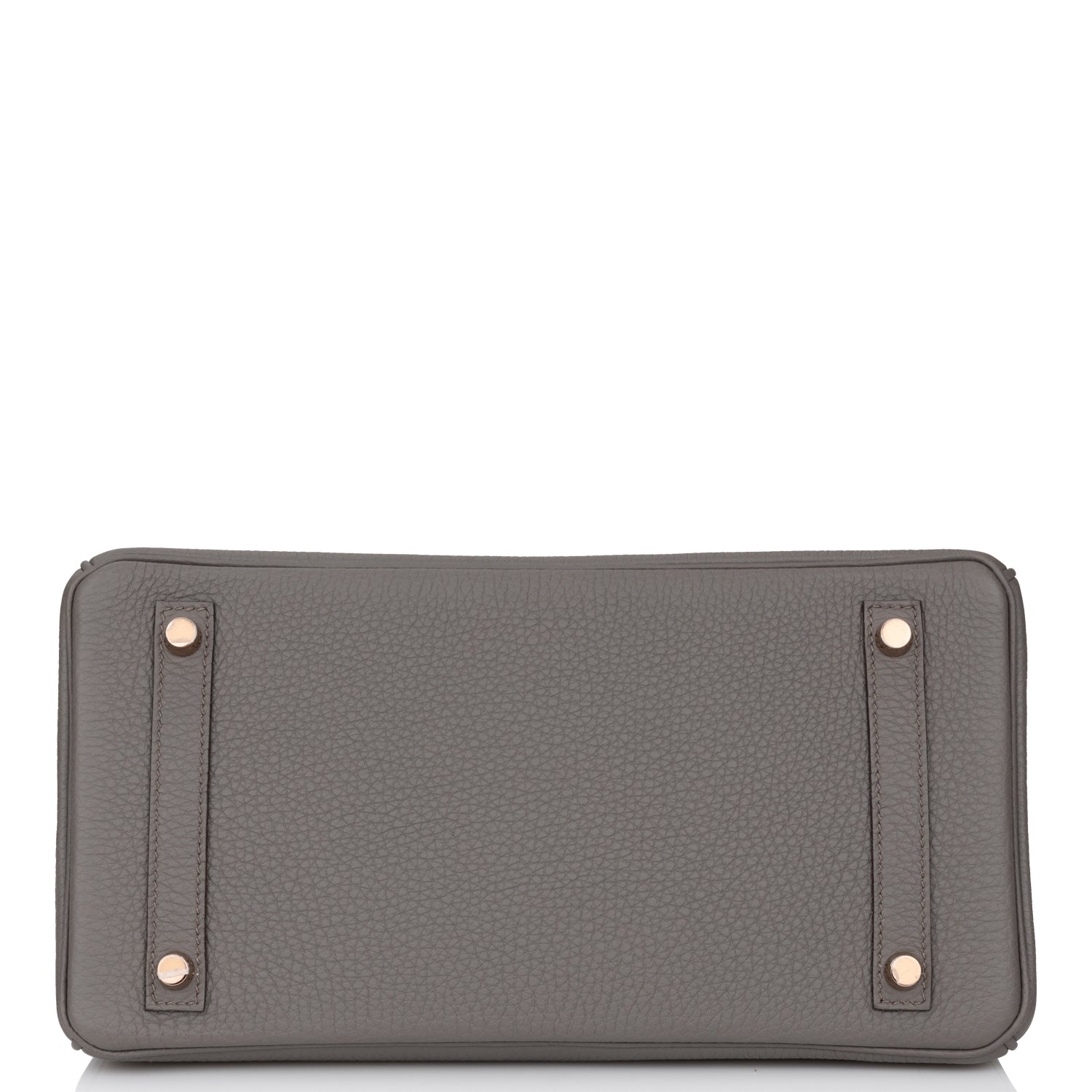 This Birkin is in Etain togo leather with rose gold hardware and has tonal stitching, front flap, two straps with center toggle closure, clochette with lock and two keys, and double rolled handles.