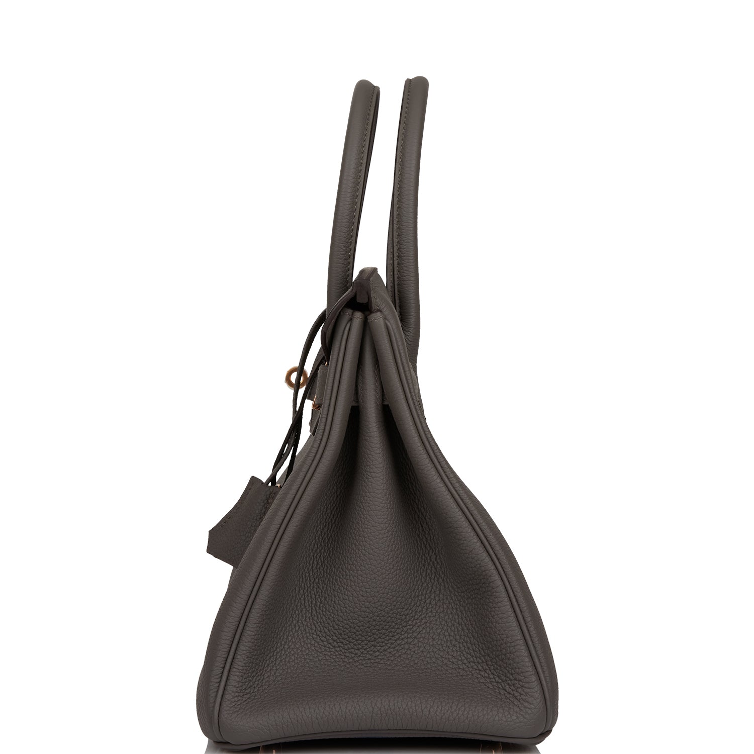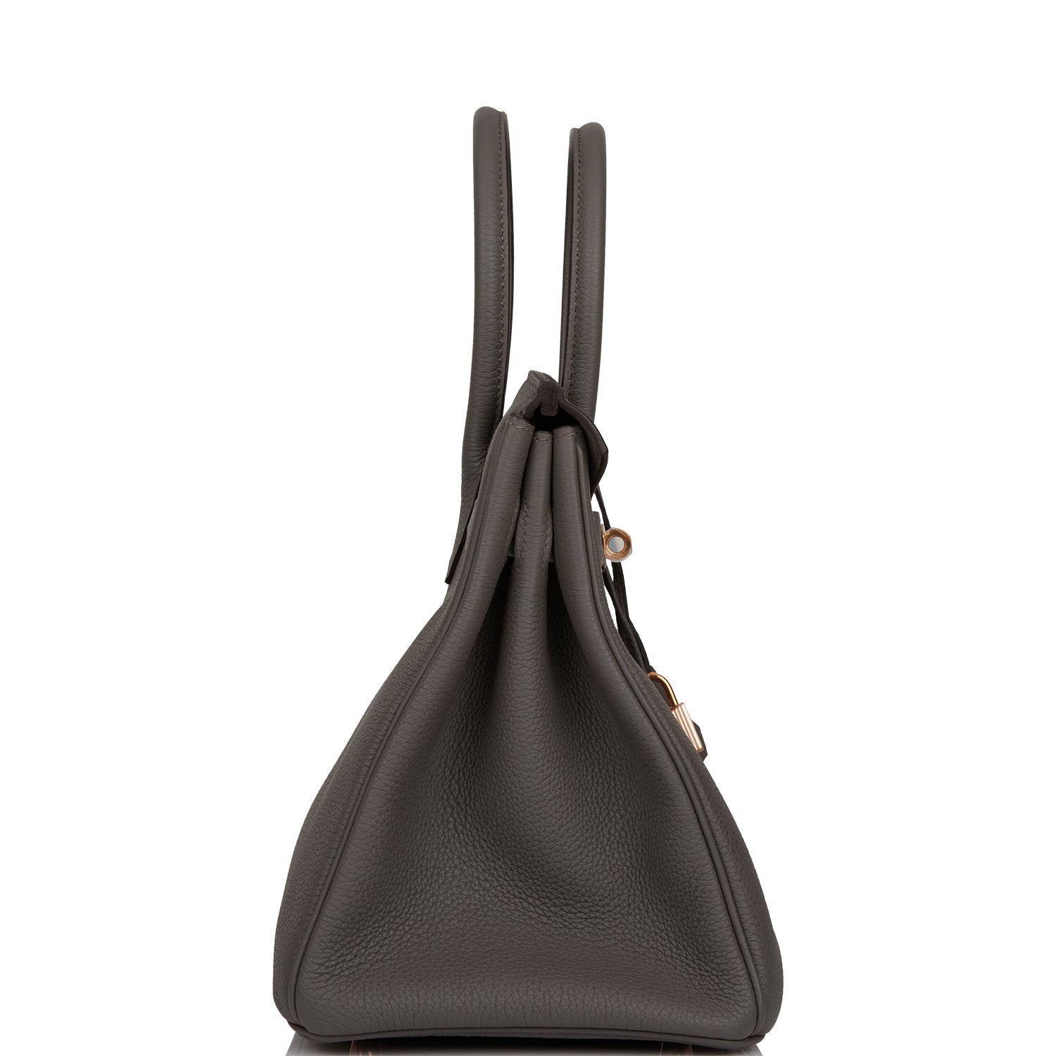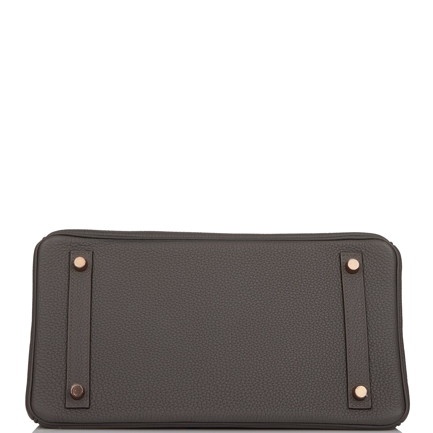 This Birkin is in Etain togo leather with rose gold hardware and has tonal stitching, front flap, two straps with center toggle closure, clochette with lock and two keys, and double rolled handles.