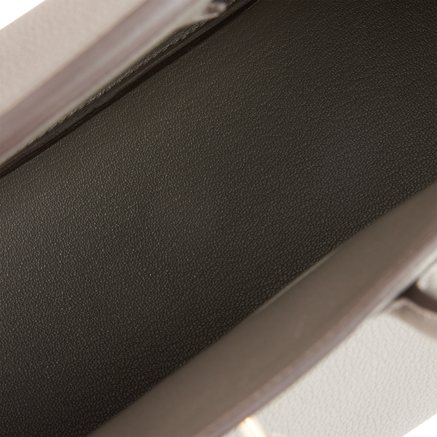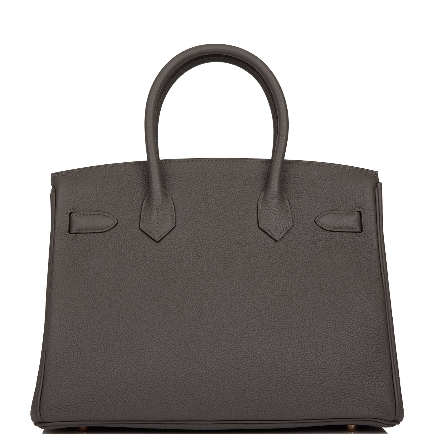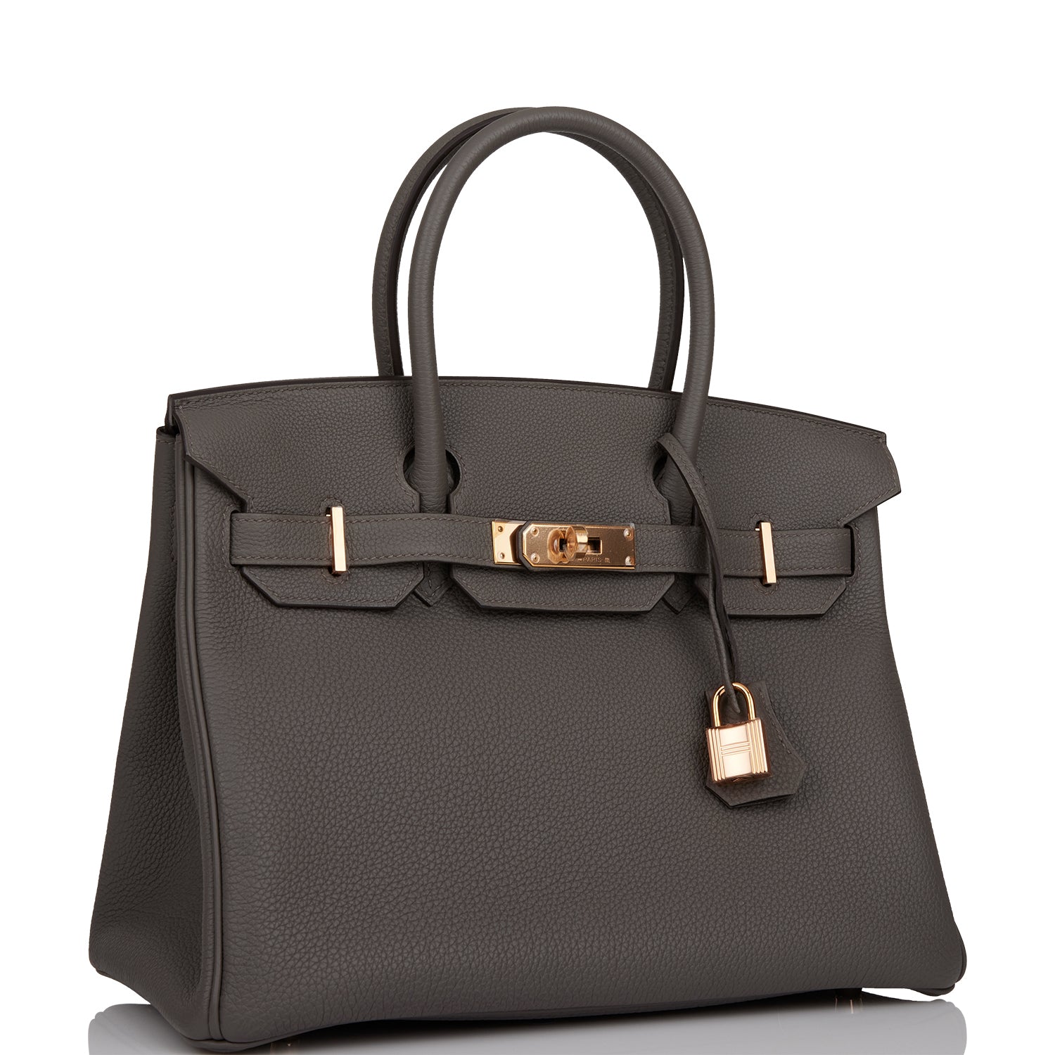 This Birkin is in Etain togo leather with rose gold hardware and has tonal stitching, front flap, two straps with center toggle closure, clochette with lock and two keys, and double rolled handles.