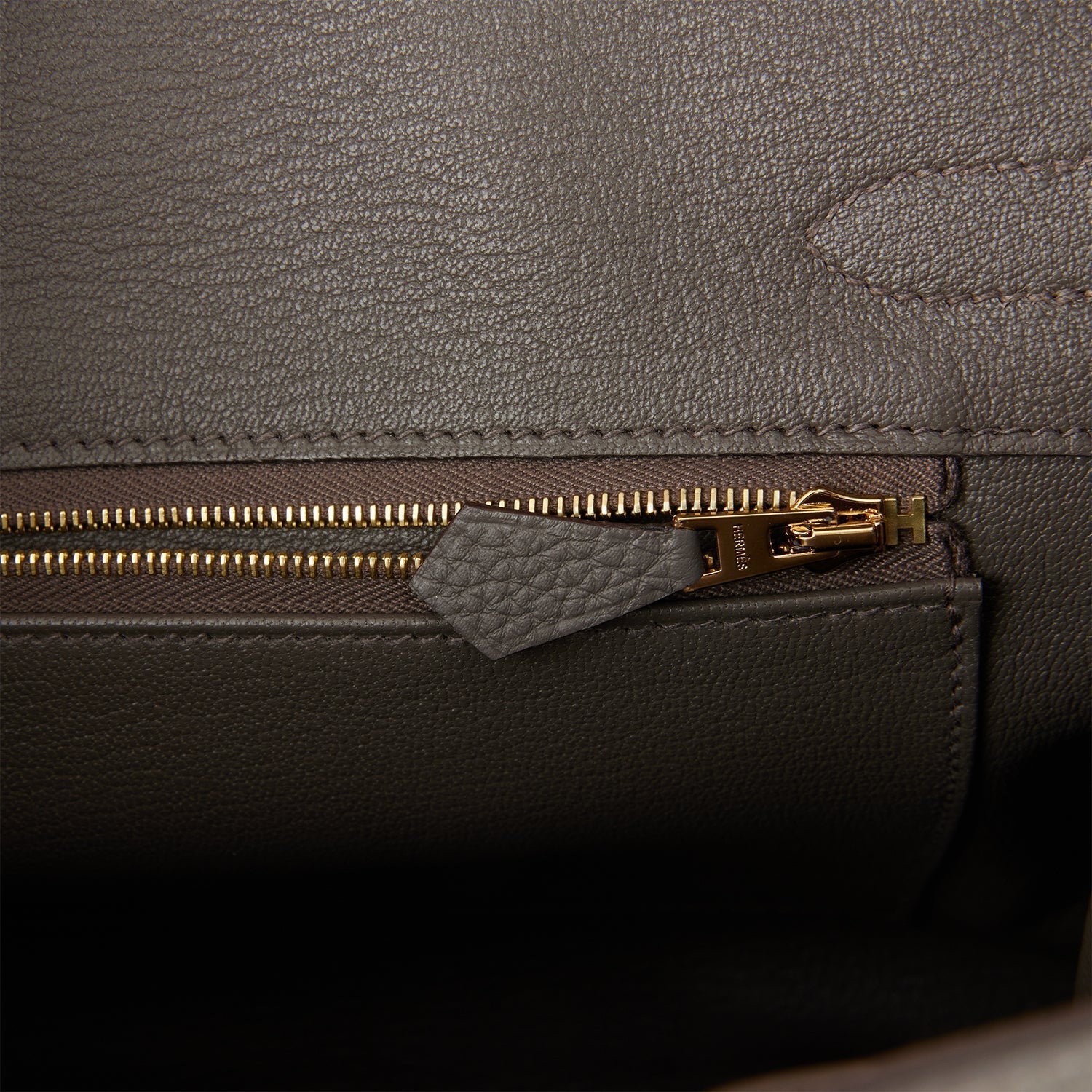 The interior is lined with Etain chevre and has one zip pocket with an Hermes engraved zipper pull and an open pocket on the opposite side.