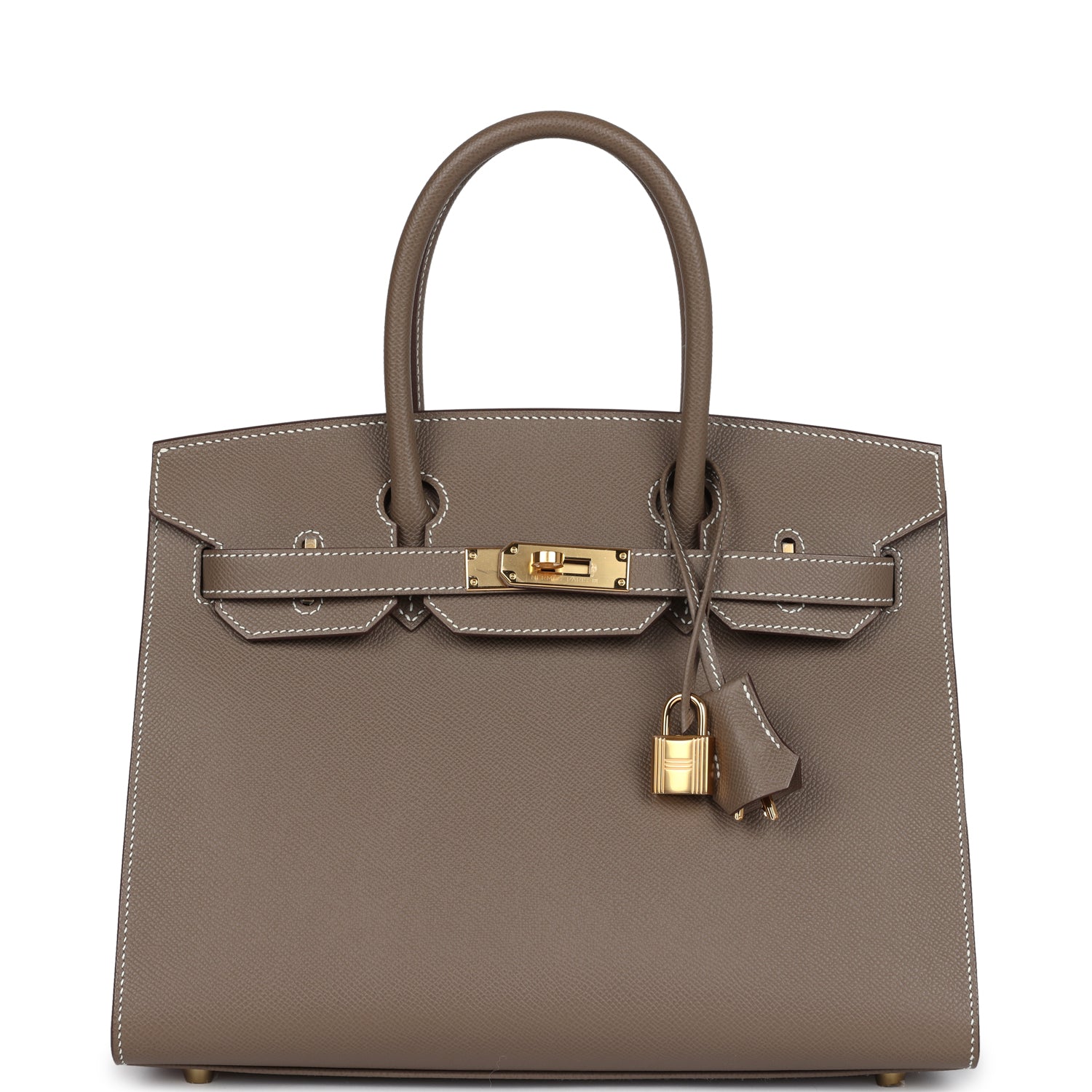 This Birkin is in Etoupe epsom leather with gold hardware and has contrast stitching, two straps with front toggle closure, clochette with lock and two keys and double rolled handles.