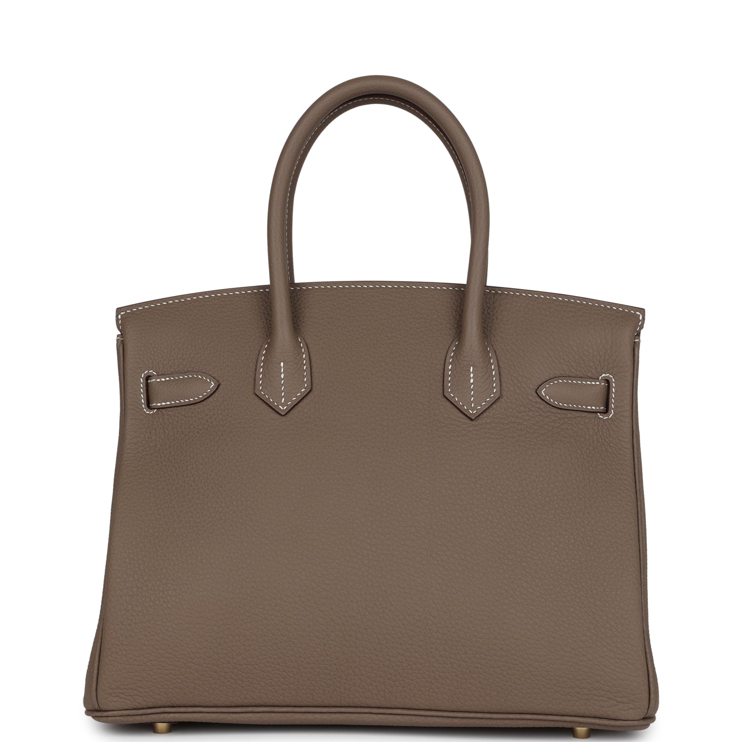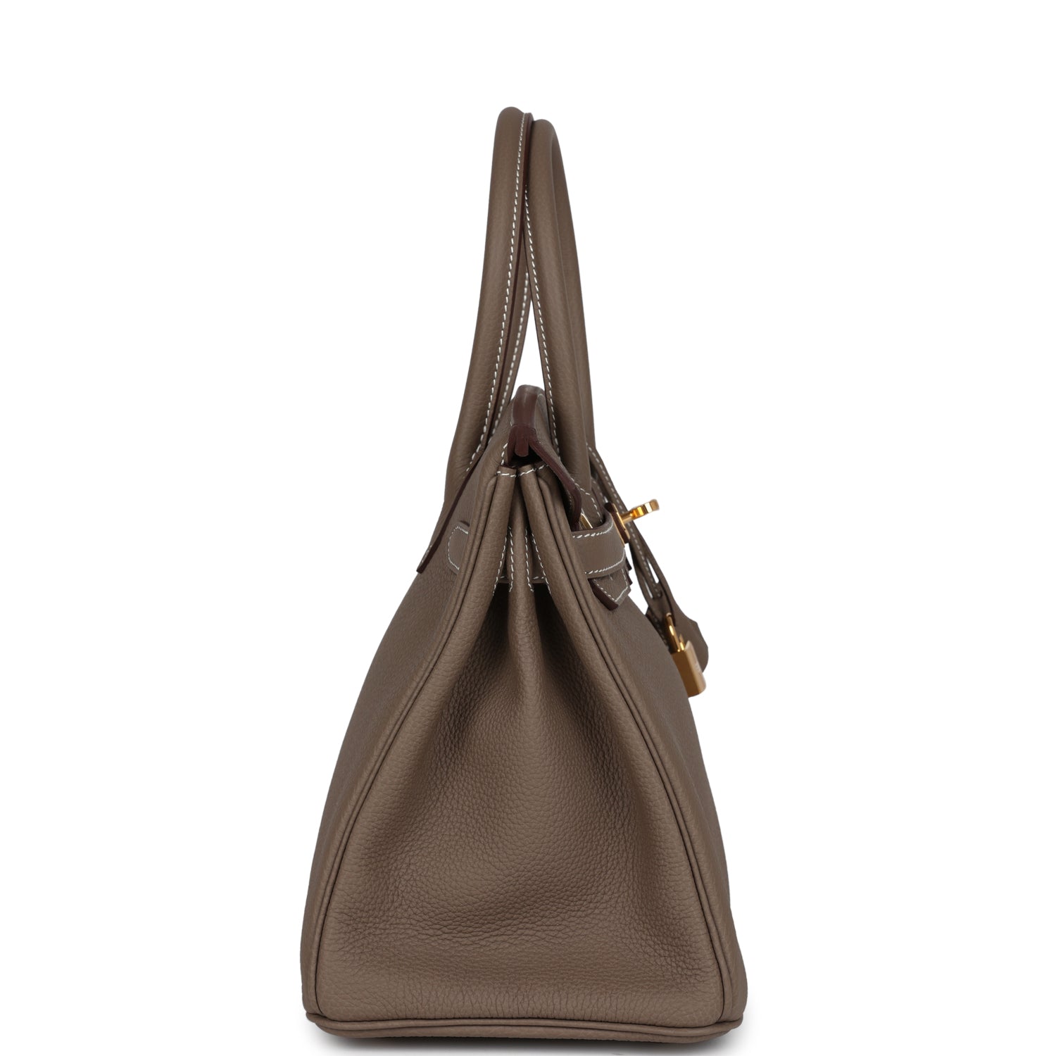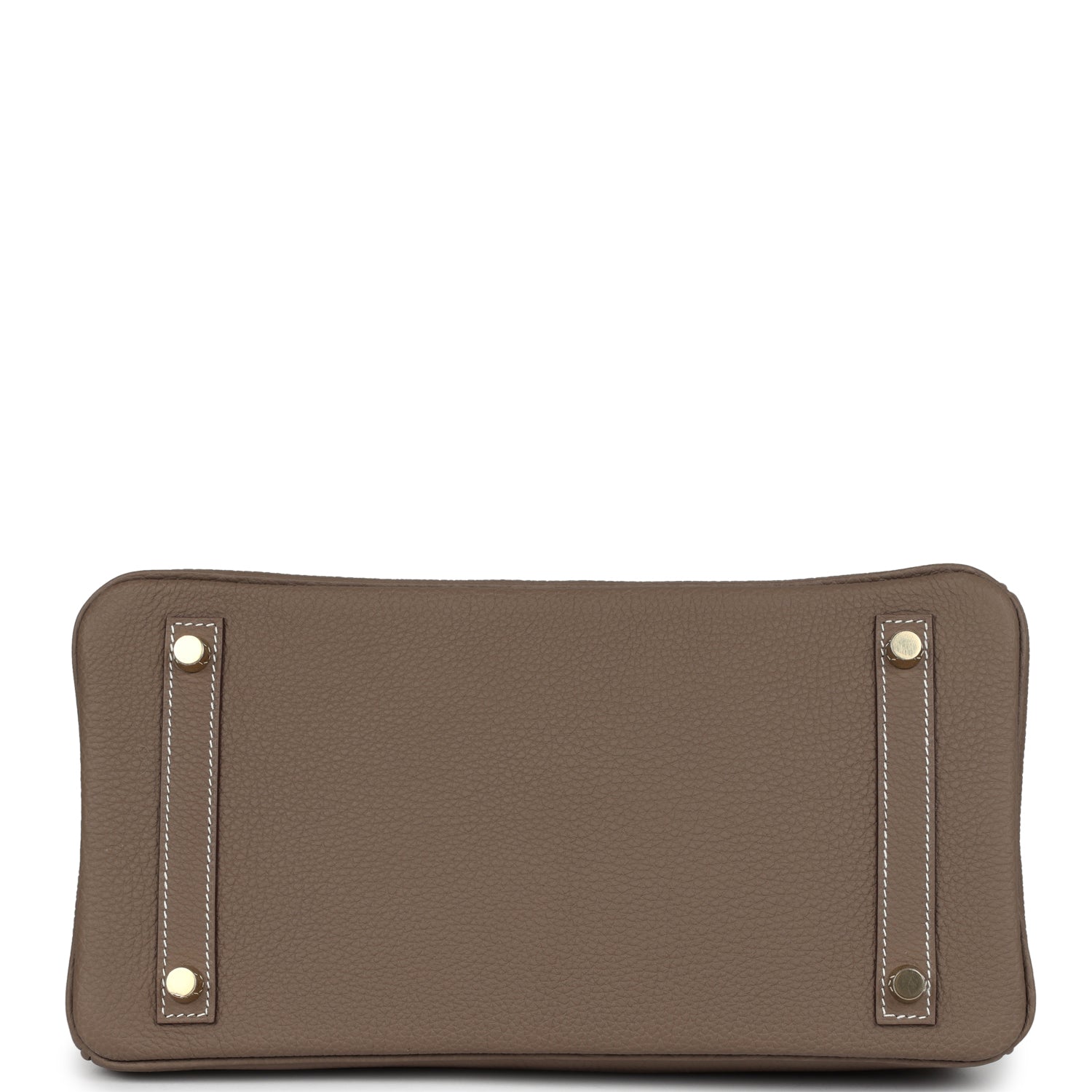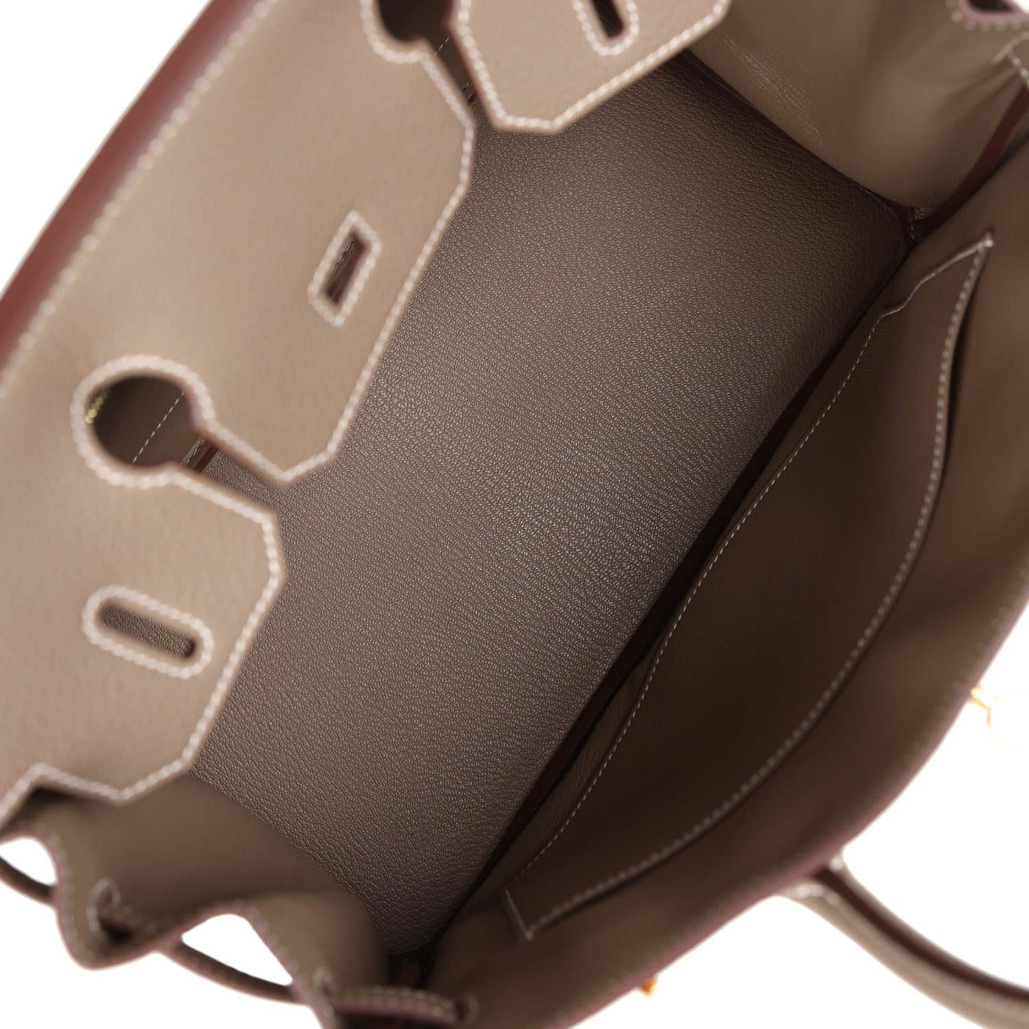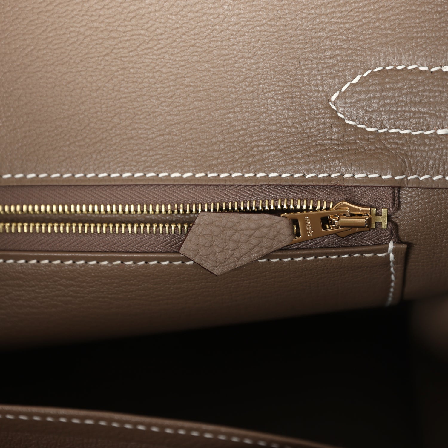 This Birkin is in Etoupe togo leather with gold hardware and has contrast stitching, front flap, two straps with center toggle closure, clochette with lock and two keys and double rolled handles.