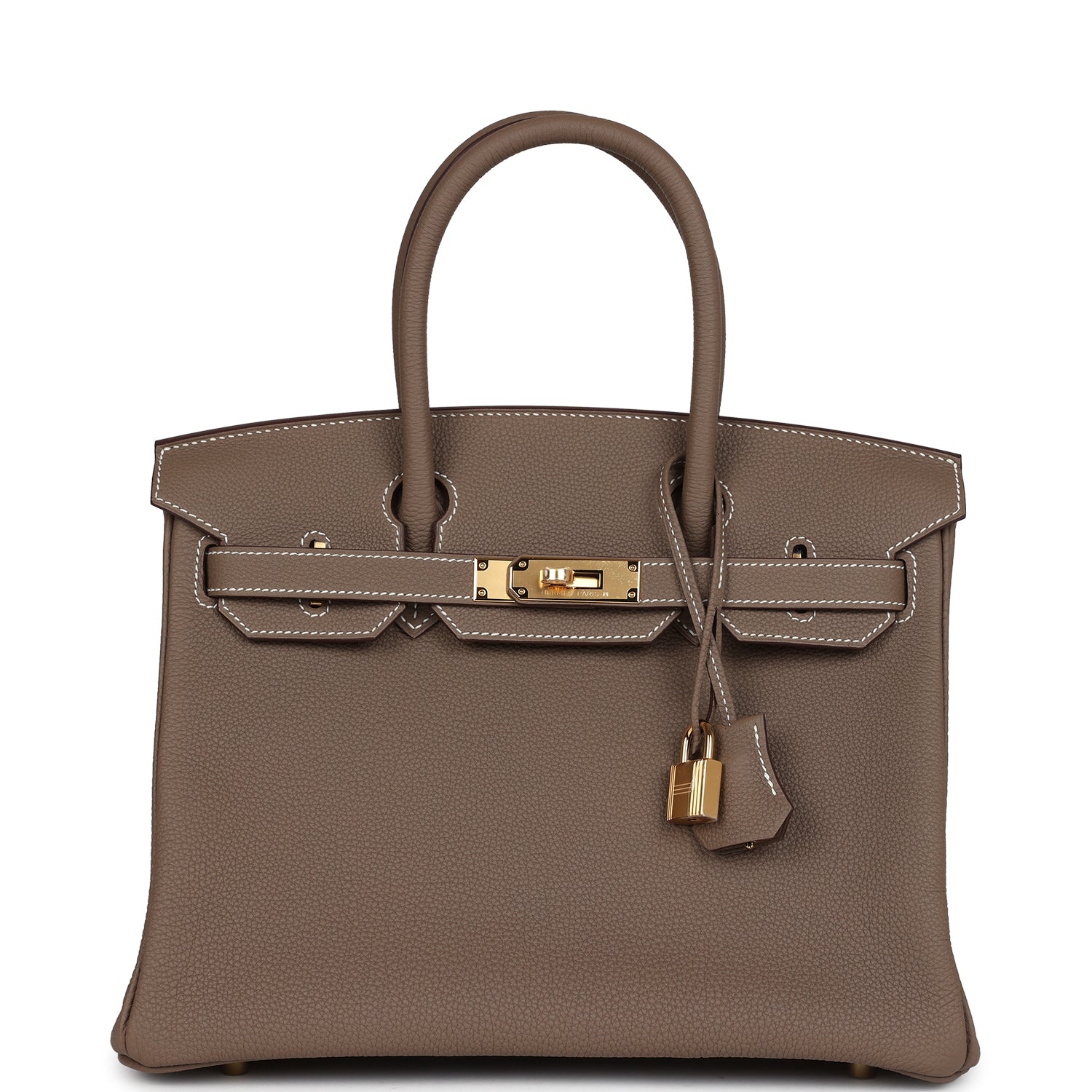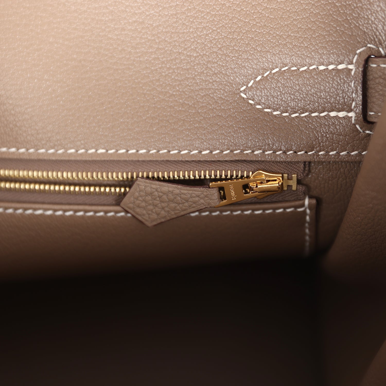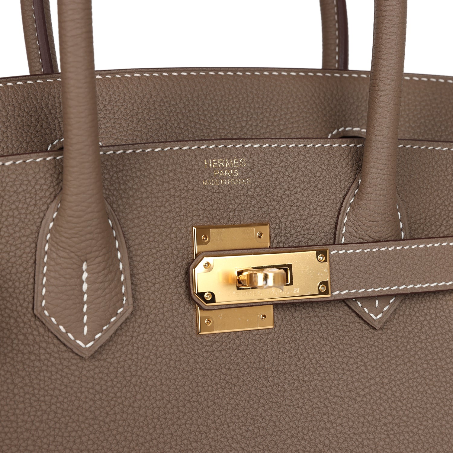 This Birkin is in Etoupe togo leather with gold hardware and has contrast stitching, front flap, two straps with center toggle closure, clochette with lock and two keys and double rolled handles.