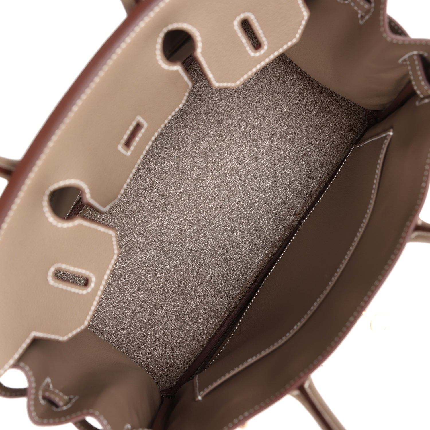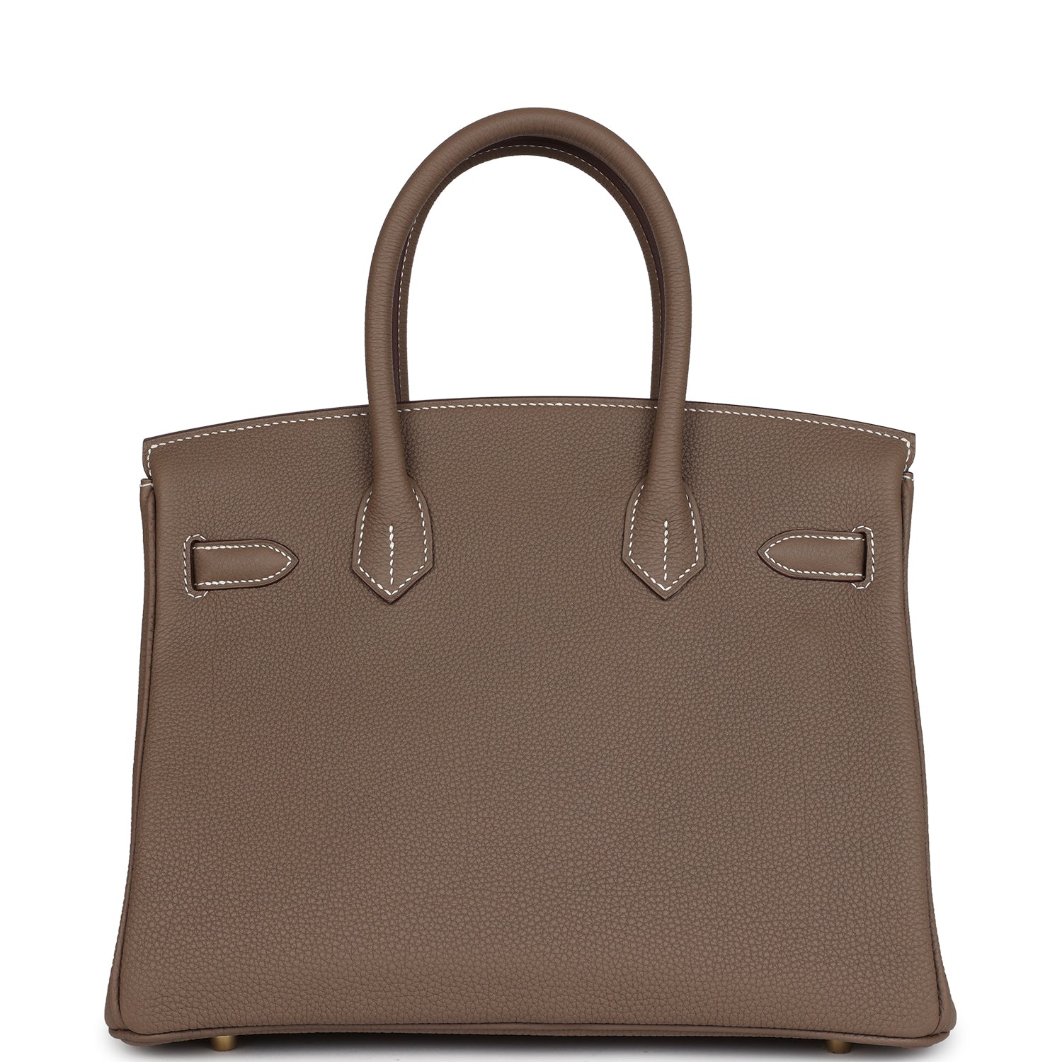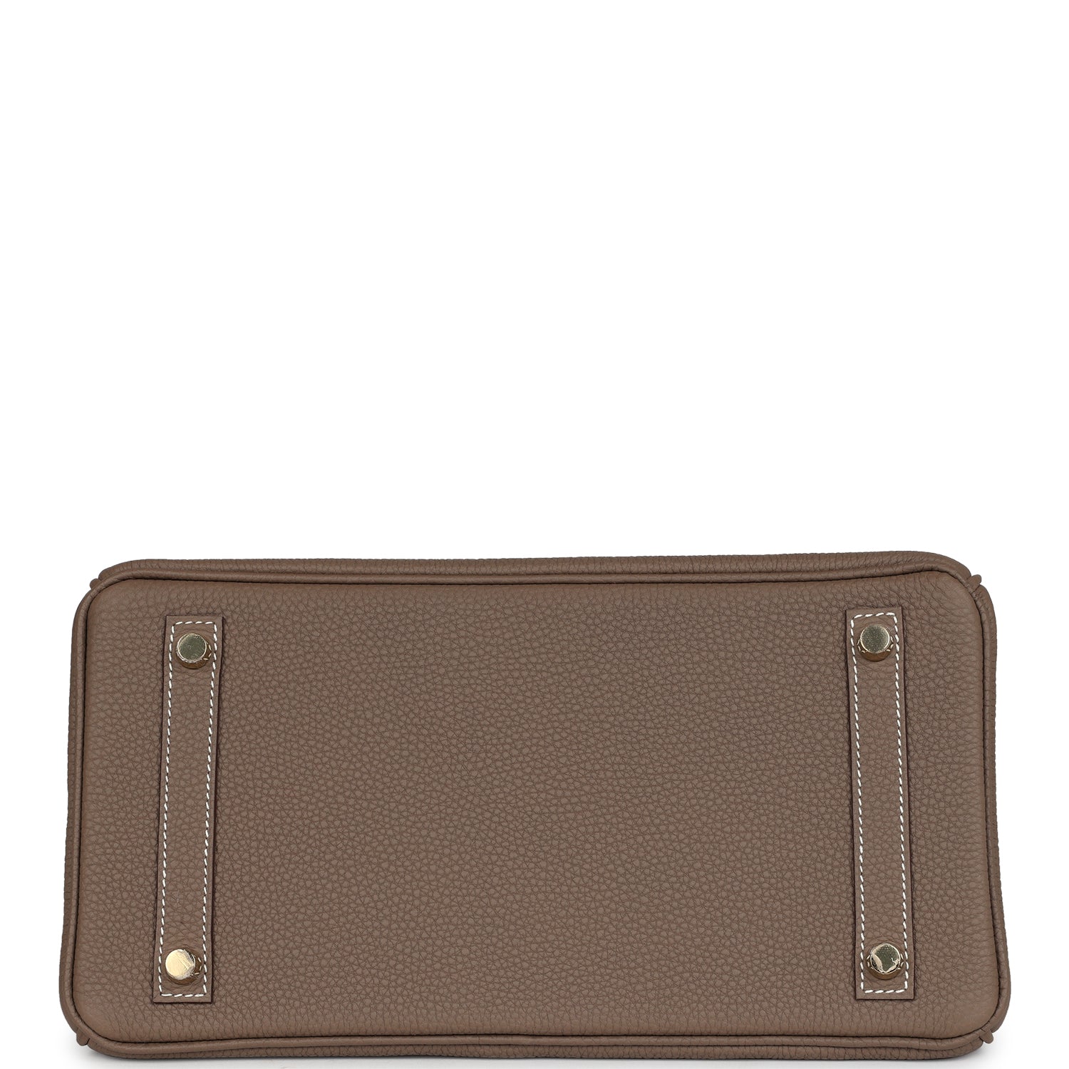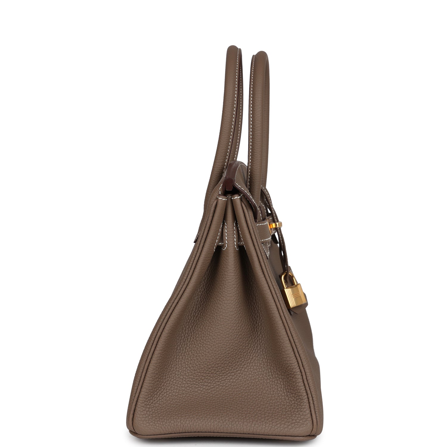 This Birkin is in Etoupe togo leather with gold hardware and has contrast stitching, front flap, two straps with center toggle closure, clochette with lock and two keys and double rolled handles.