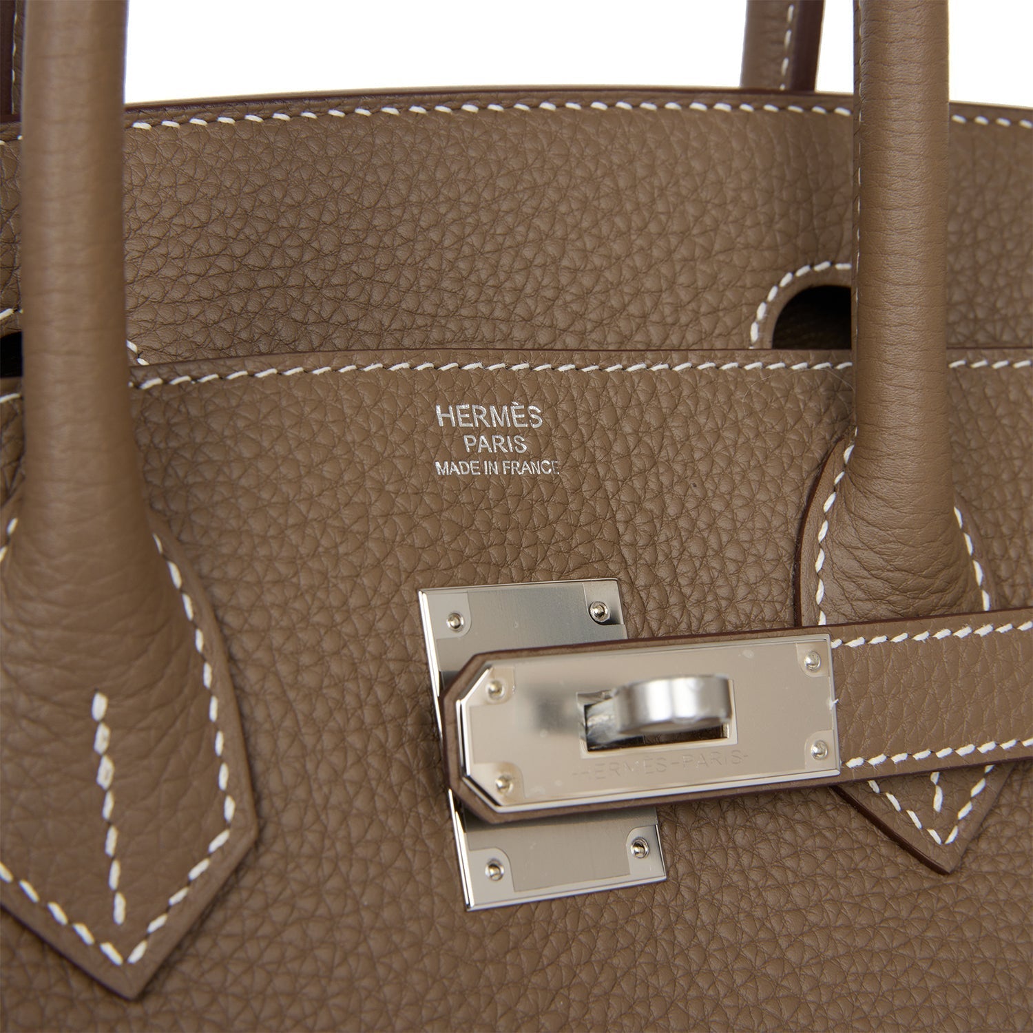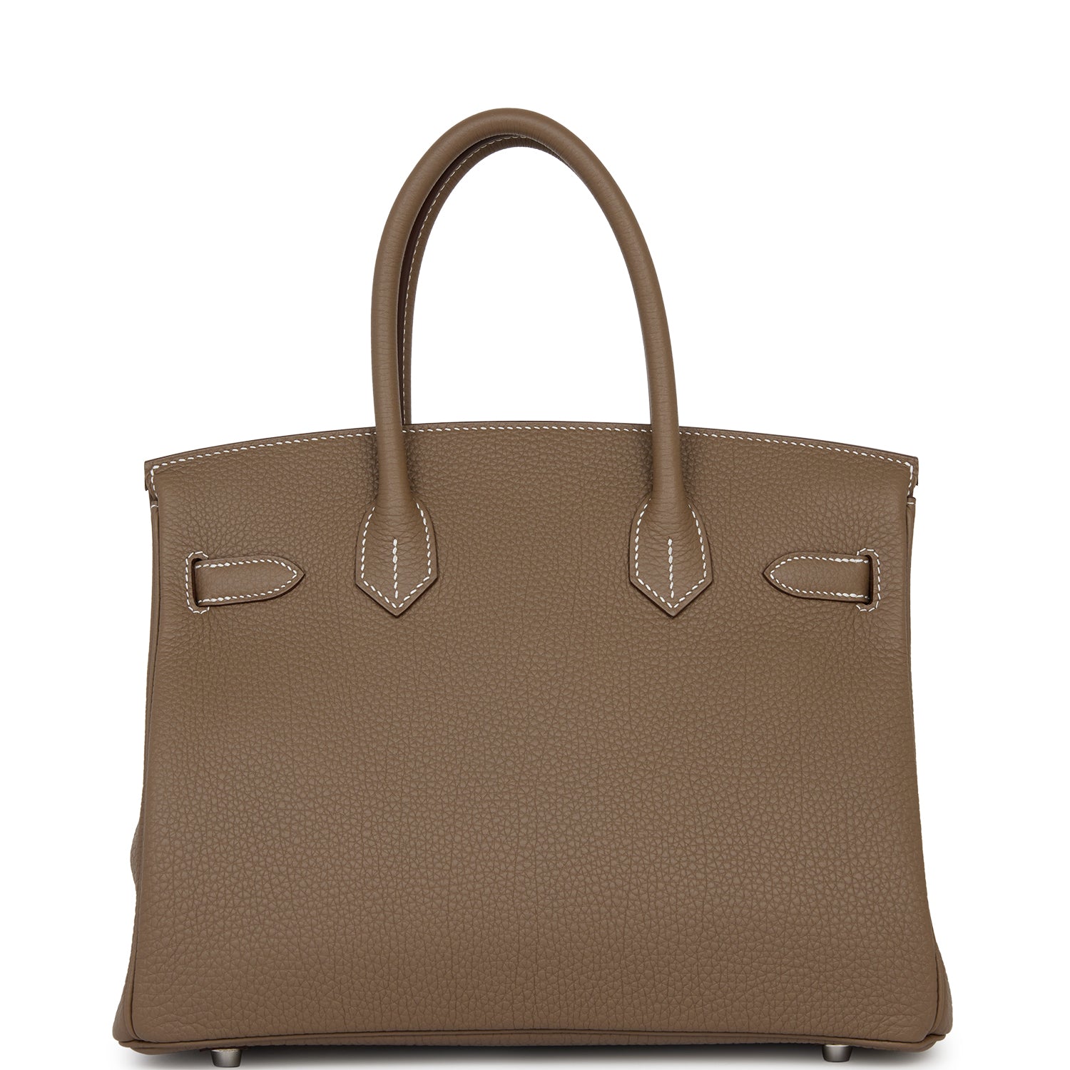 This Birkin is in Etoupe togo leather with palladium hardware and has contrast stitching, two straps with front toggle closure, clochette with lock and two keys and double rolled handles.