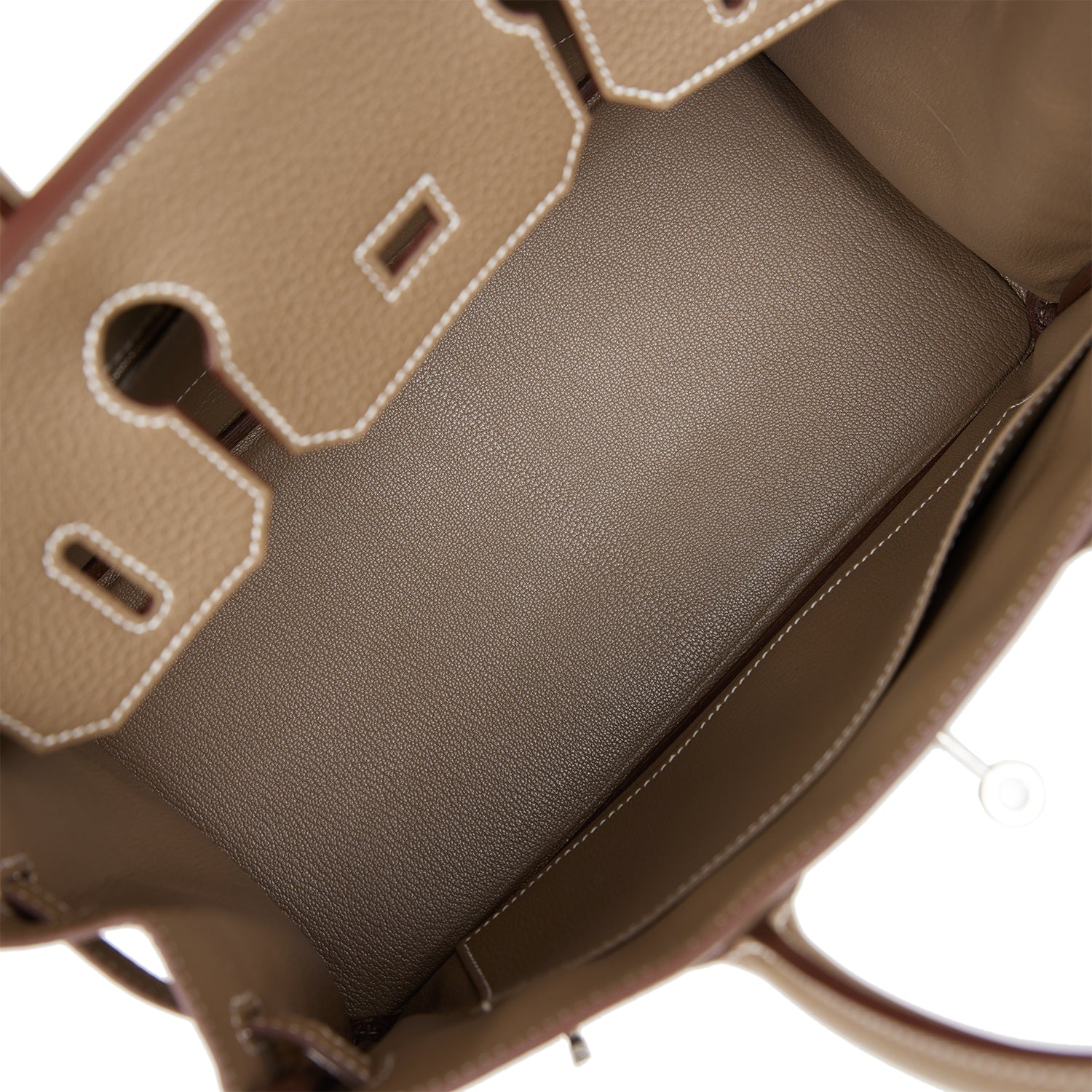 The interior is lined with Etoupe chevre and has one zip pocket with an Hermes engraved zipper pull and an open pocket on the opposite side.