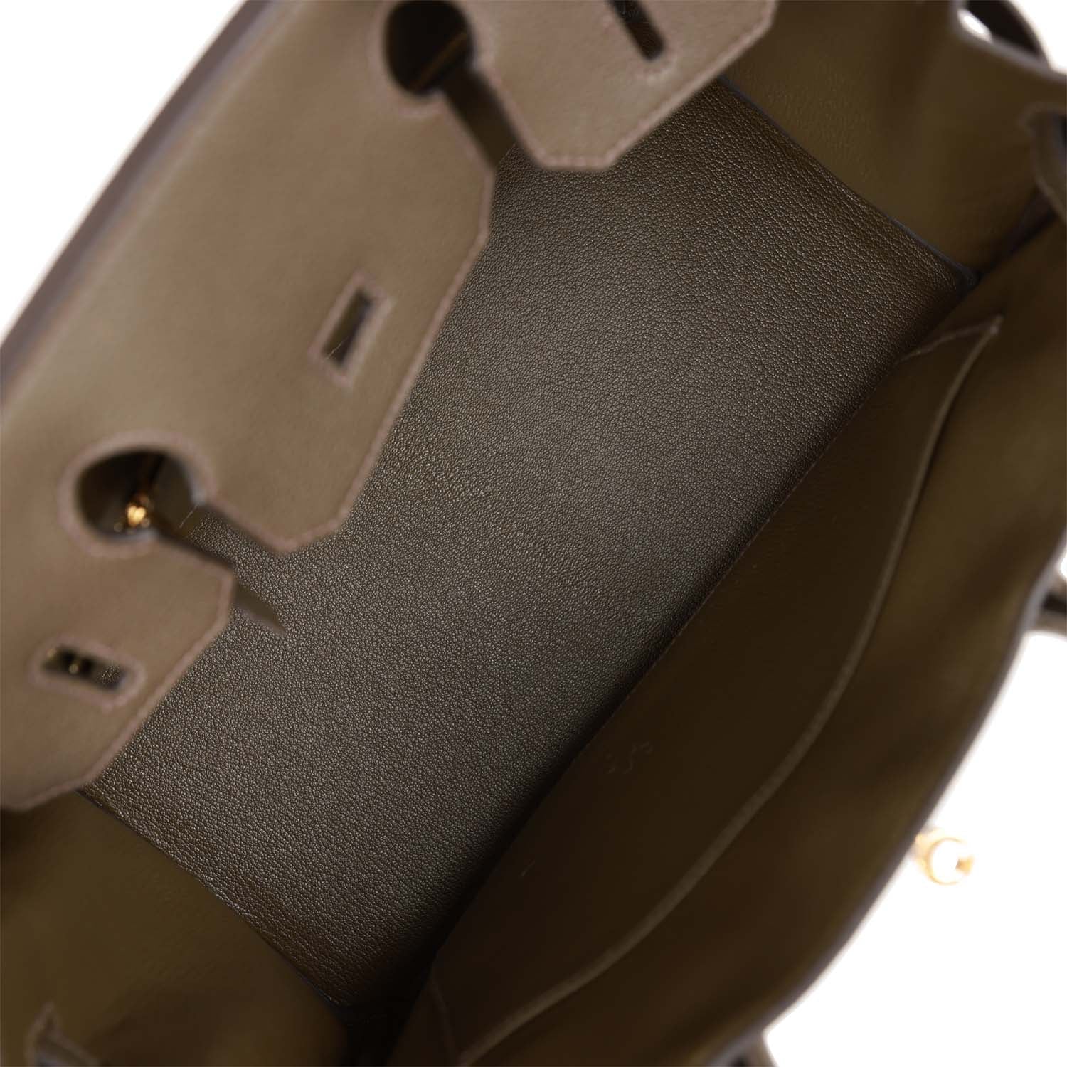 The interior is lined with Eucalyptus chevre and has one zip pocket with an Hermes engraved zipper pull and an open pocket on the opposite side.