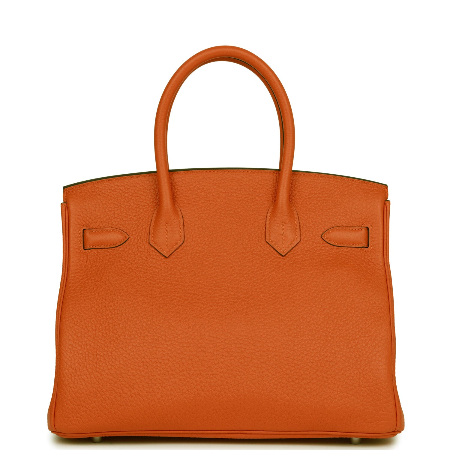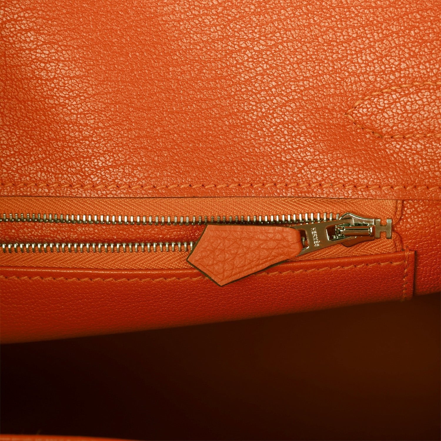 This Birkin is in Feu clemence leather with palladium hardware and has tonal stitching, front flap, two straps with center toggle closure, clochette with lock and two keys, and double rolled handles.
