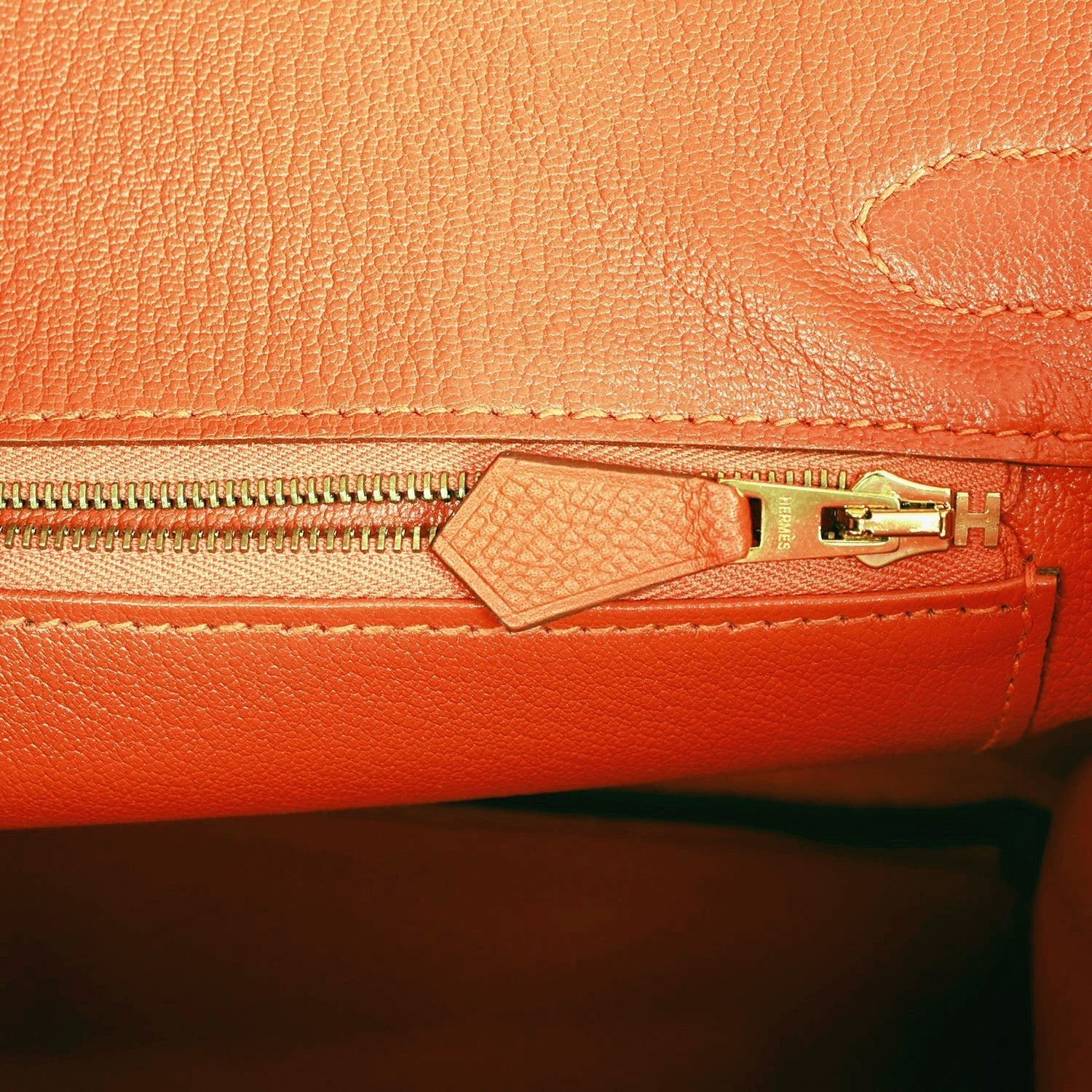 The interior is lined with Feu chevre and has one zip pocket with an Hermes engraved zipper pull and an open pocket on the opposite side.