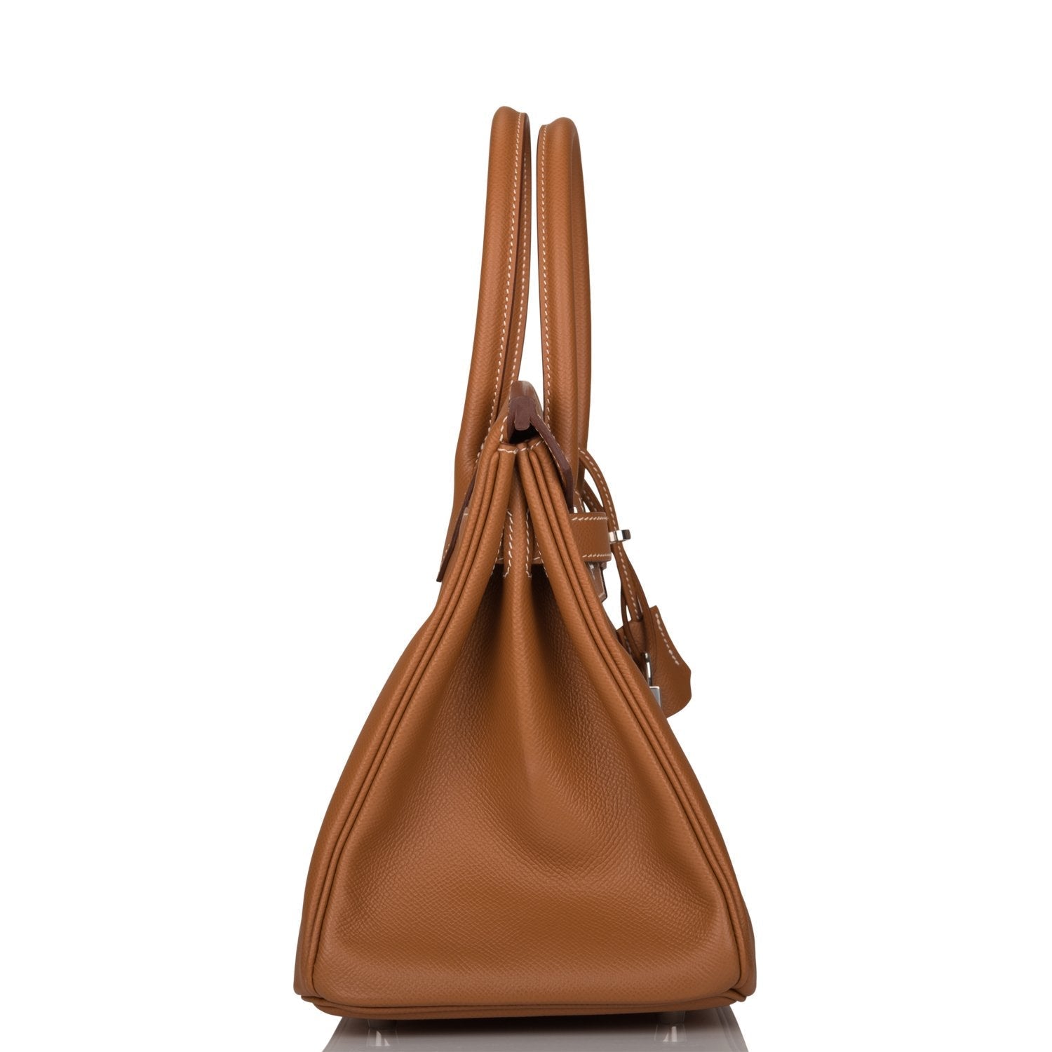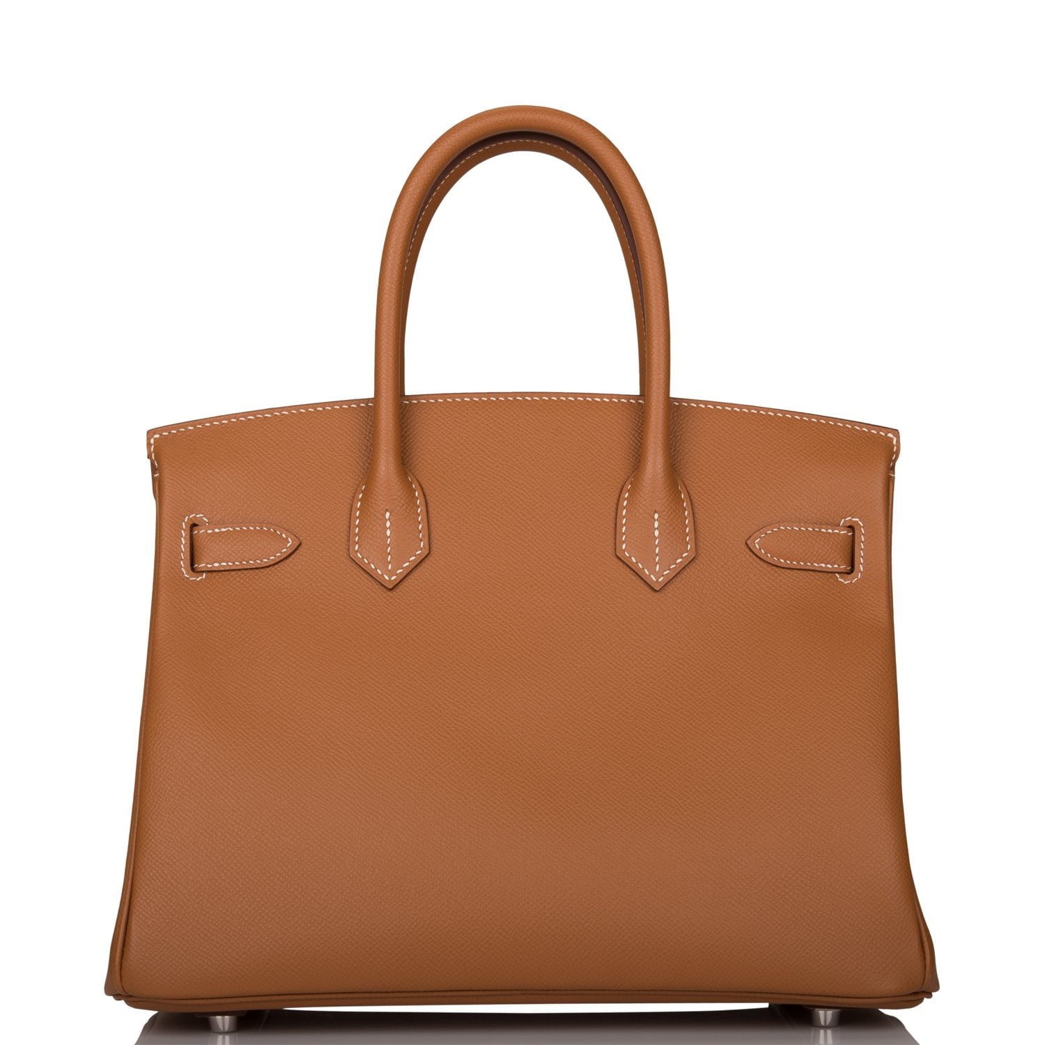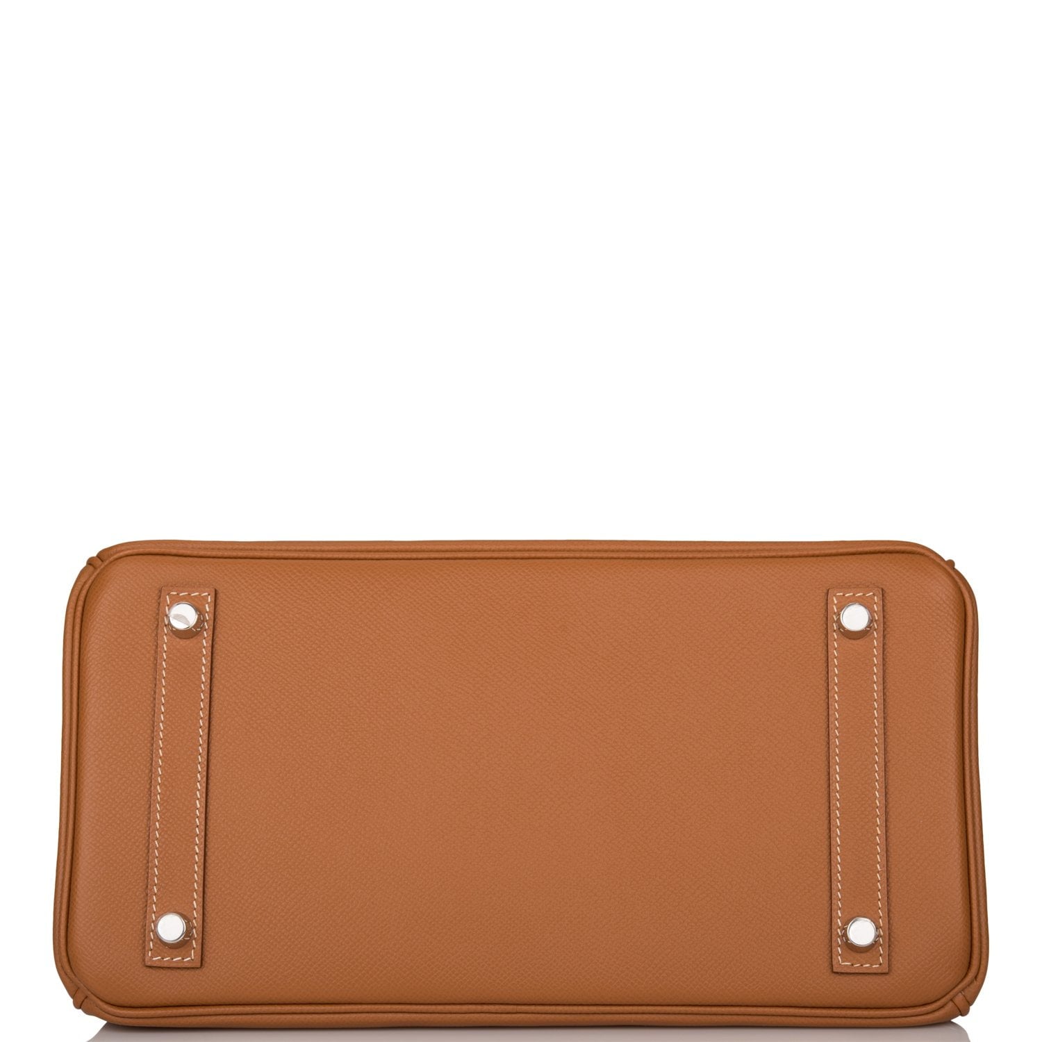 This Birkin is in gold epsom leather with palladium hardware and has contrast stitching, front flap, two straps with center toggle closure, clochette with lock and two keys, and double rolled handles.