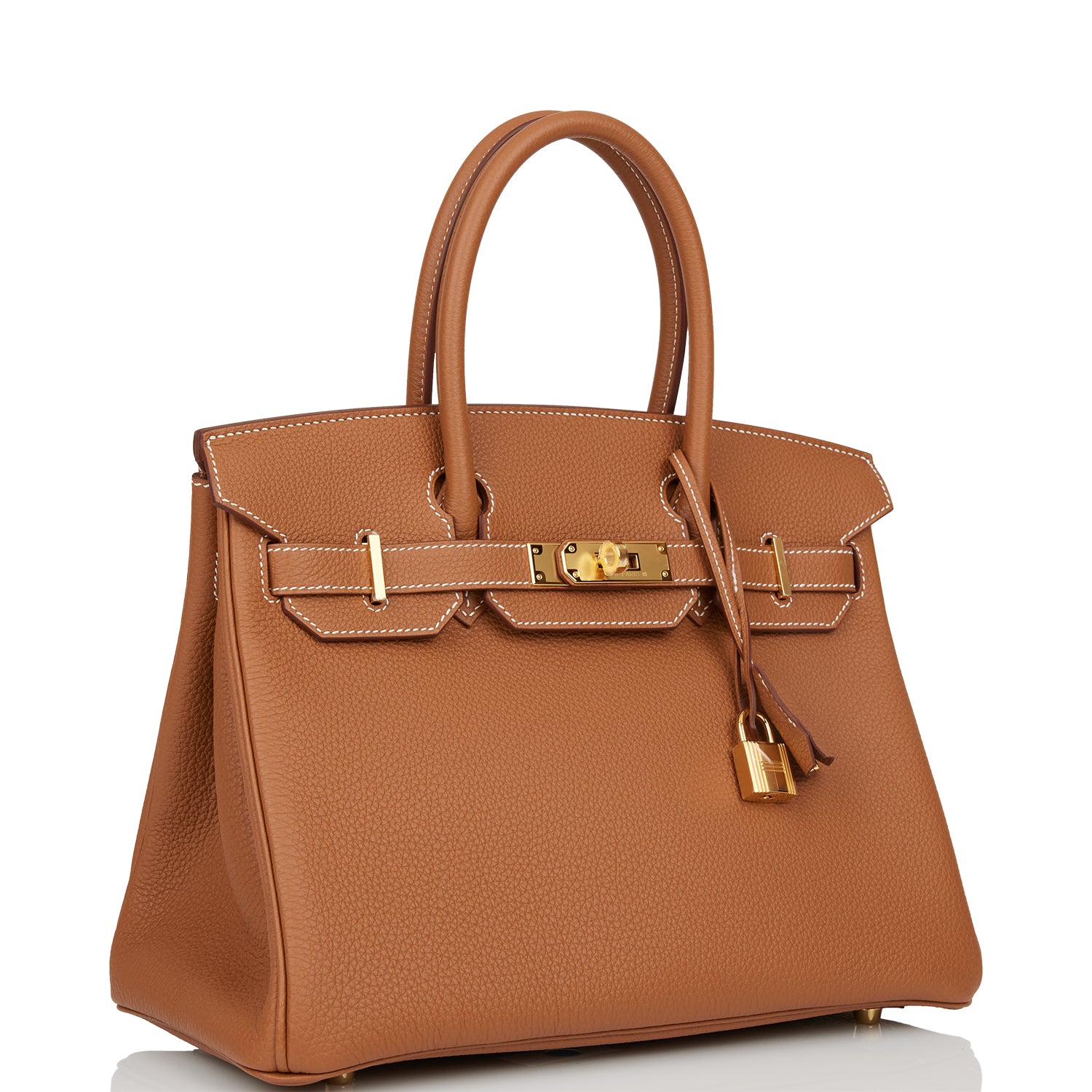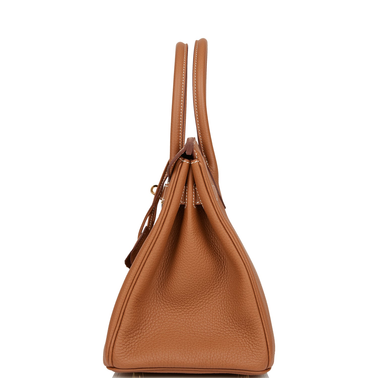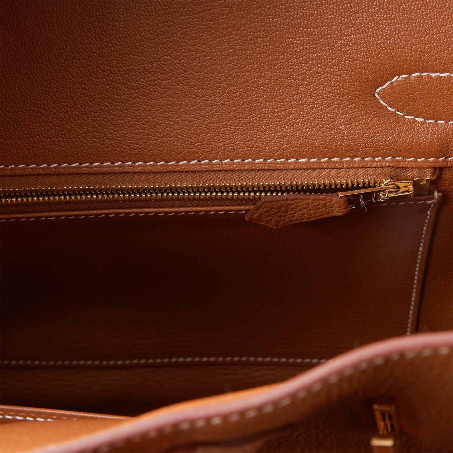 This Birkin is in gold togo leather with gold hardware and has white contrast stitching, front flap, two straps with center toggle closure, clochette with lock and two keys, and double rolled handles.
