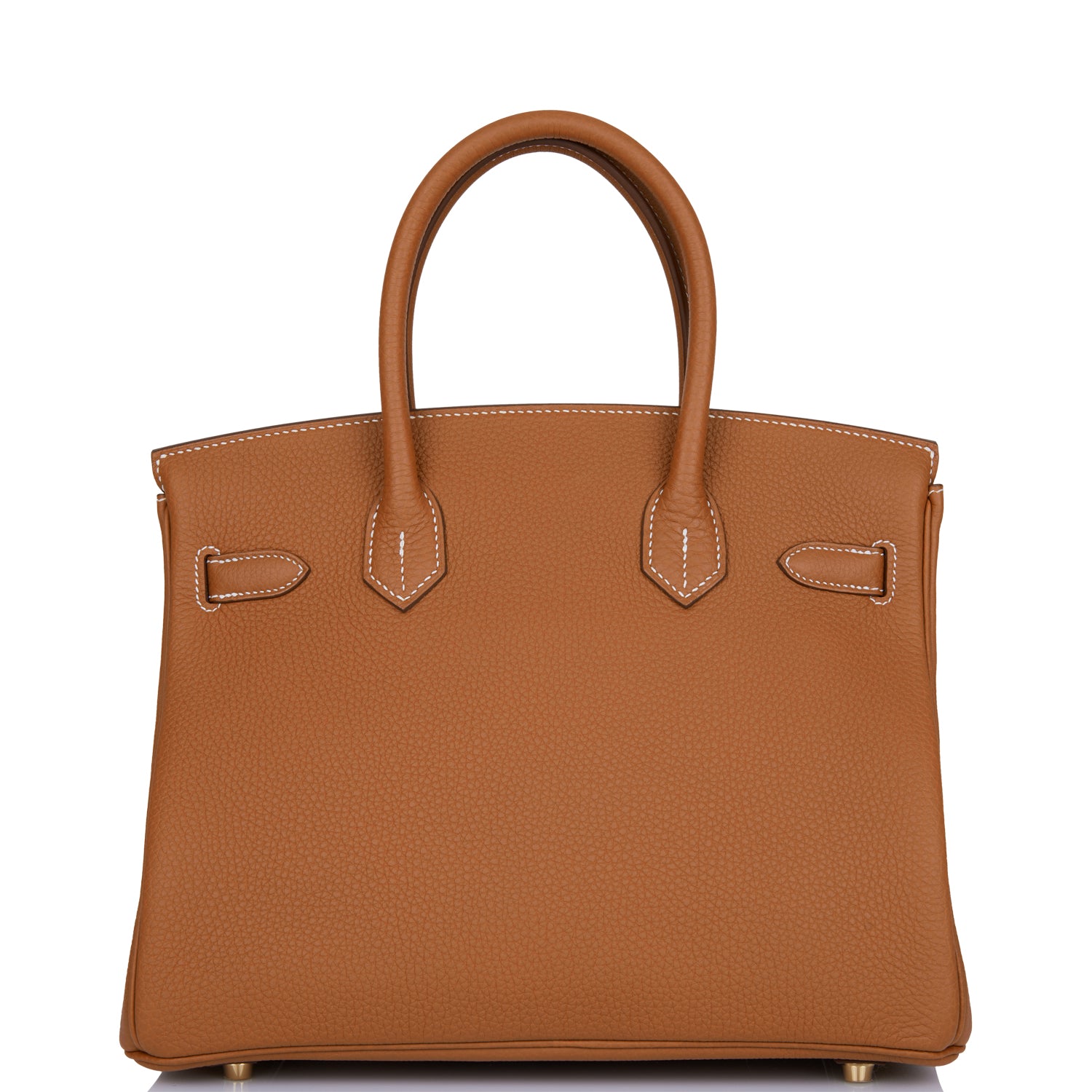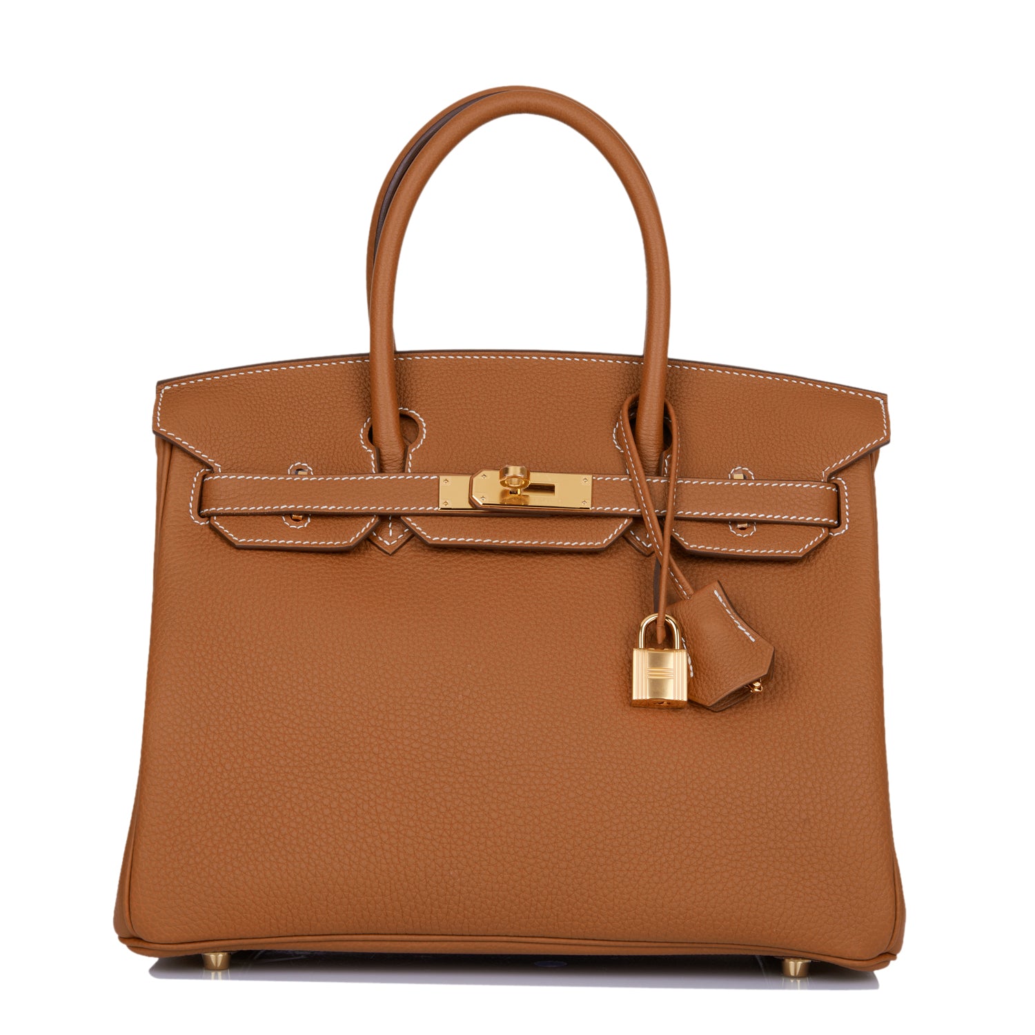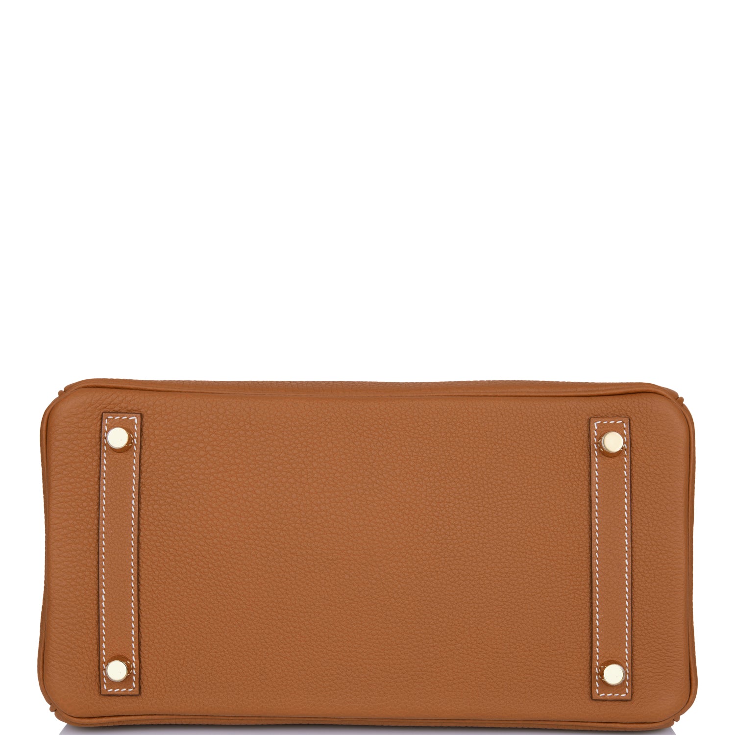 This Birkin is in gold togo leather with gold hardware and has white contrast stitching, front flap, two straps with center toggle closure, clochette with lock and two keys, and double rolled handles.