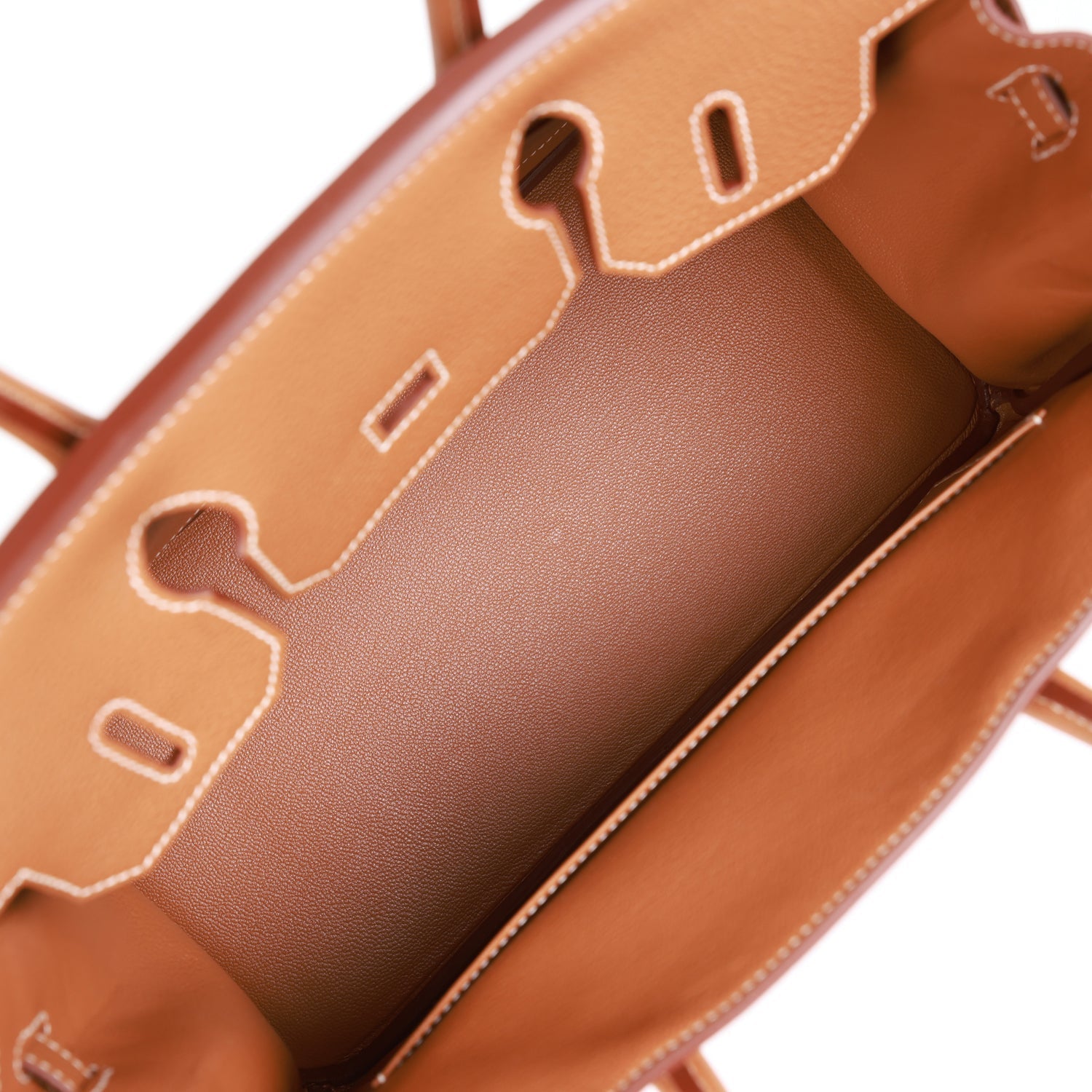 This Birkin is in gold togo leather with gold hardware and has white contrast stitching, front flap, two straps with center toggle closure, clochette with lock and two keys, and double rolled handles.