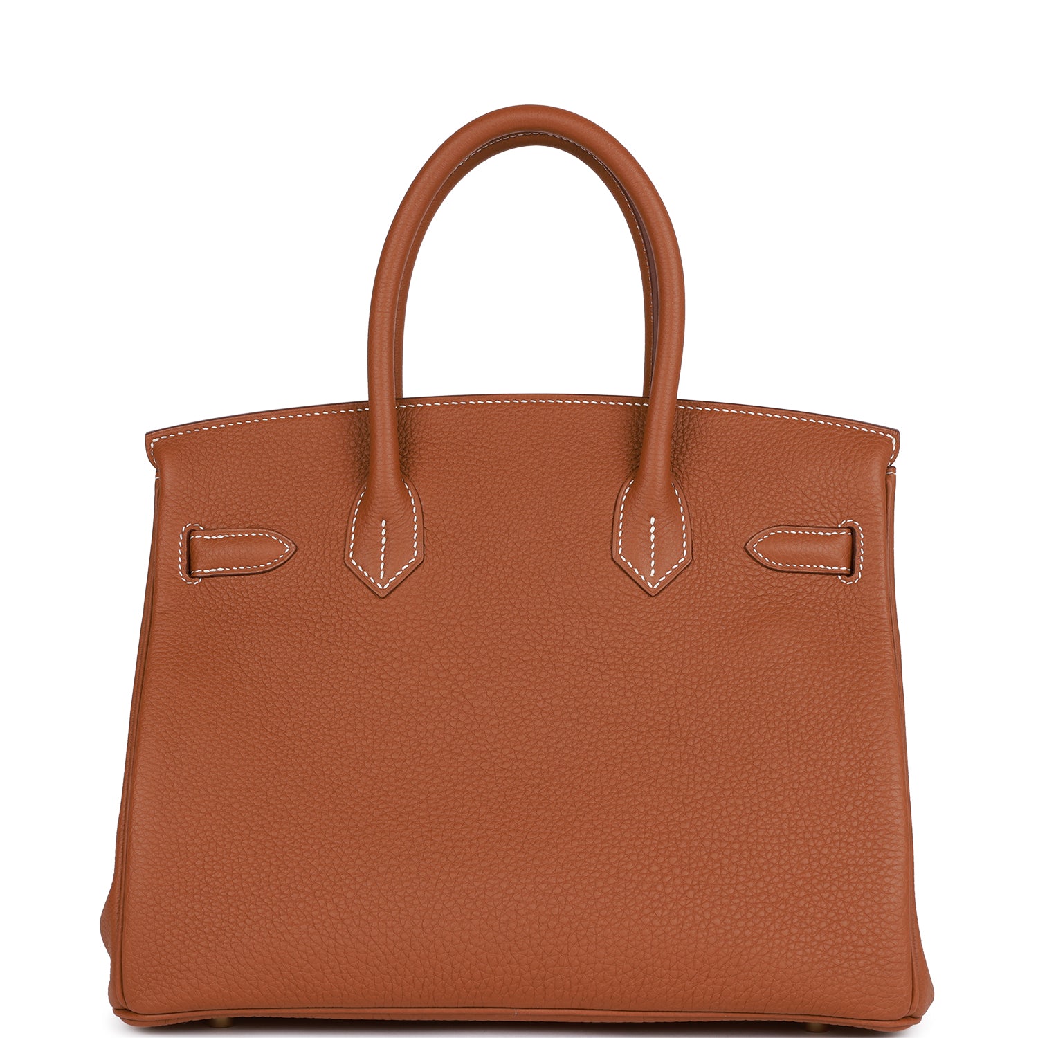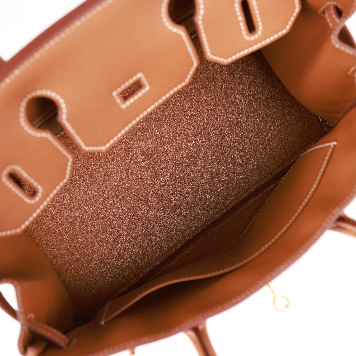 This Birkin is in gold togo leather with gold hardware and has white contrast stitching, front flap, two straps with center toggle closure, clochette with lock and two keys, and double rolled handles.