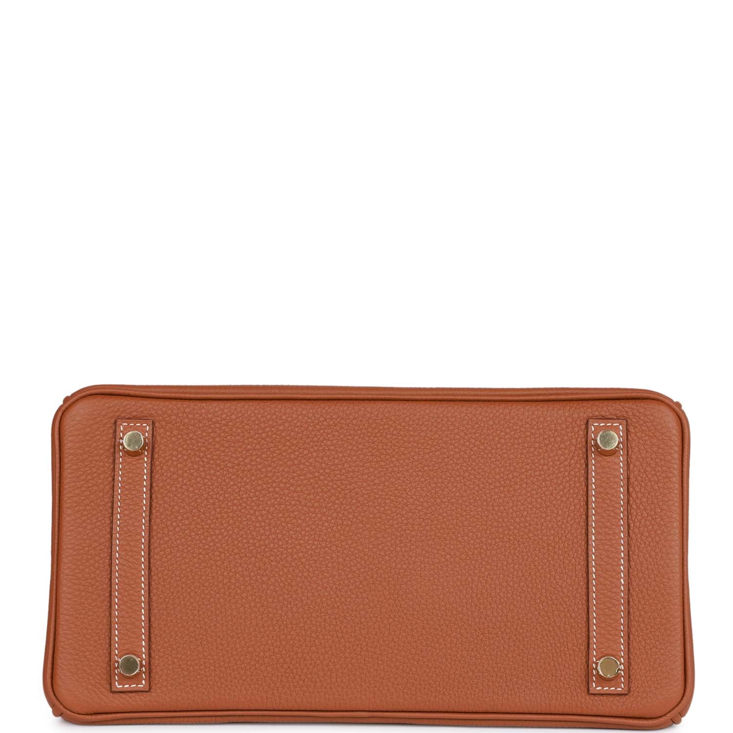 This Birkin is in gold togo leather with gold hardware and has white contrast stitching, front flap, two straps with center toggle closure, clochette with lock and two keys, and double rolled handles.