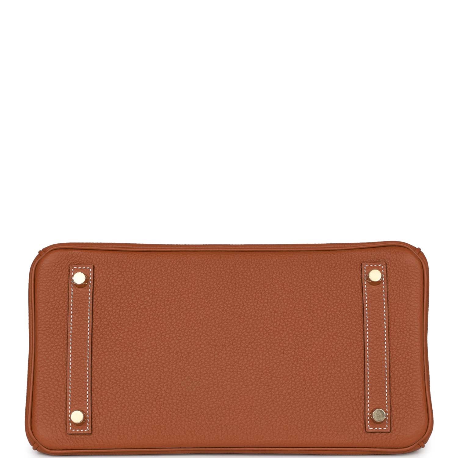 This Birkin 30 is in Gold togo leather with gold hardware and has tonal stitching, front flap, two straps with center toggle closure, clochette with lock and two keys, and double rolled handles.
