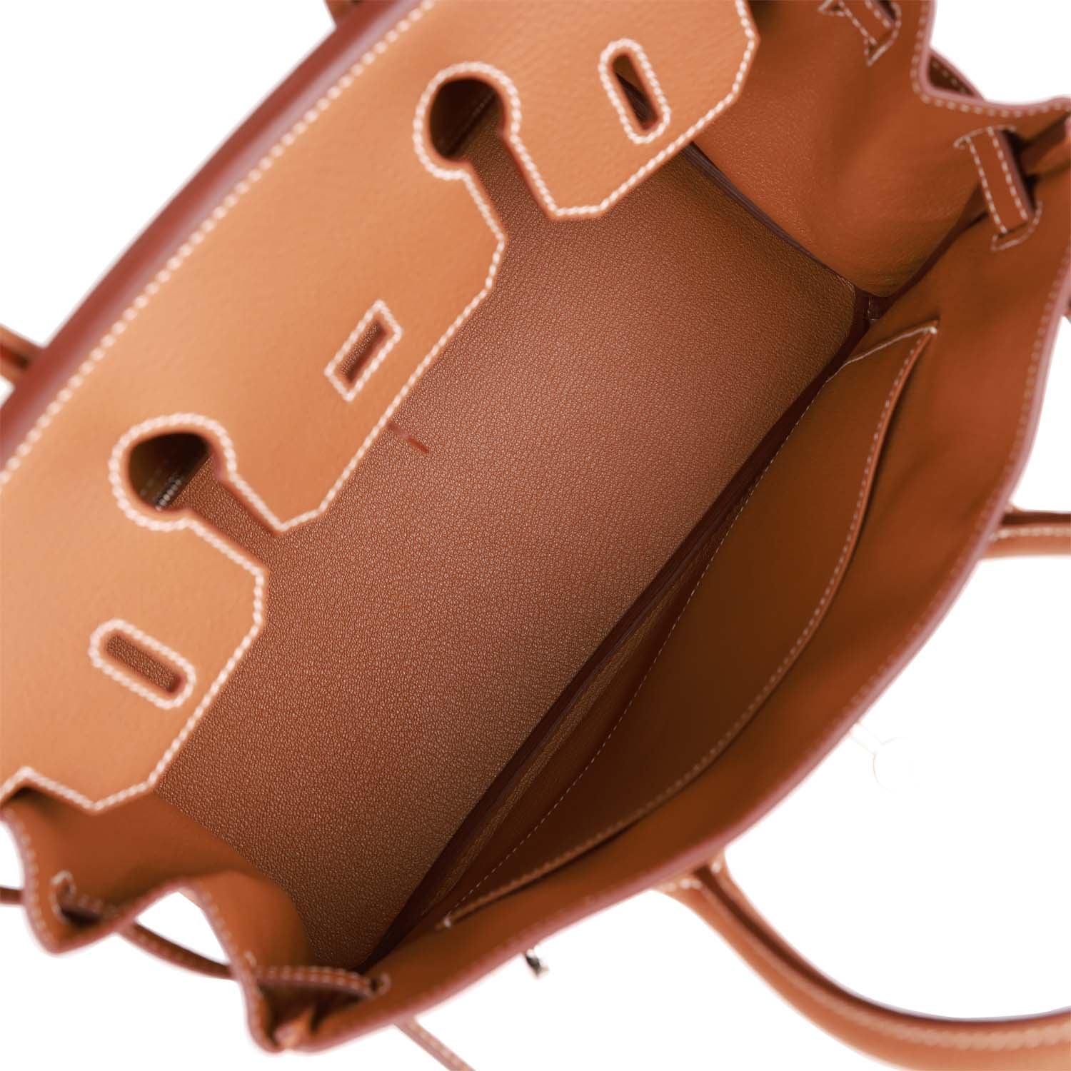 The interior is lined with gold chevre and has one zip pocket with an Hermes engraved zipper pull and an open pocket on the opposite side.