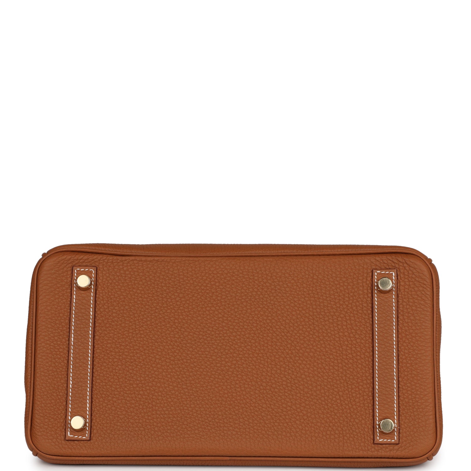 This Birkin is in Gold togo leather with gold hardware, contrast stitching, front flap, two straps with center toggle closure, clochette with lock and two keys, and double rolled handles.