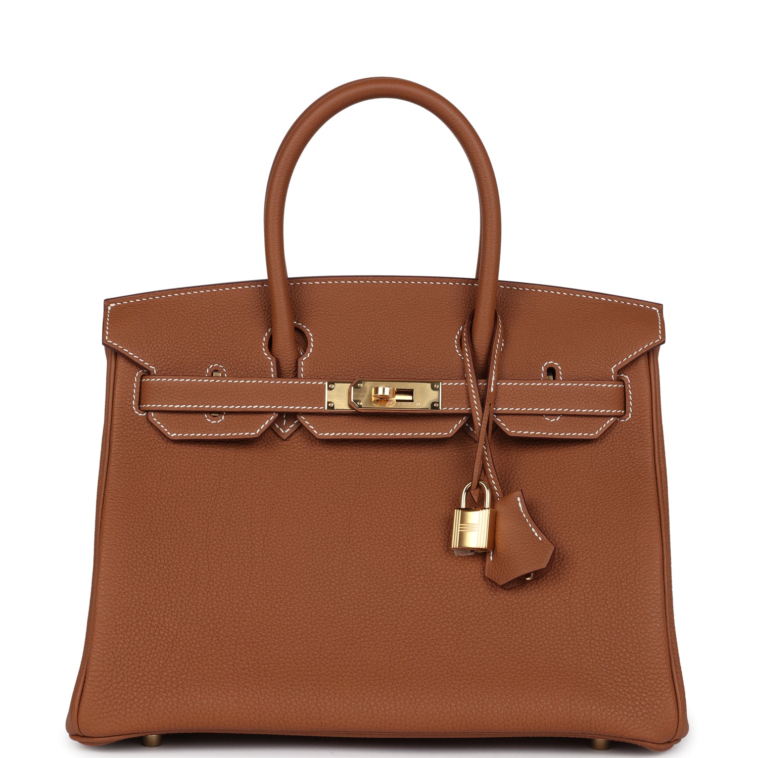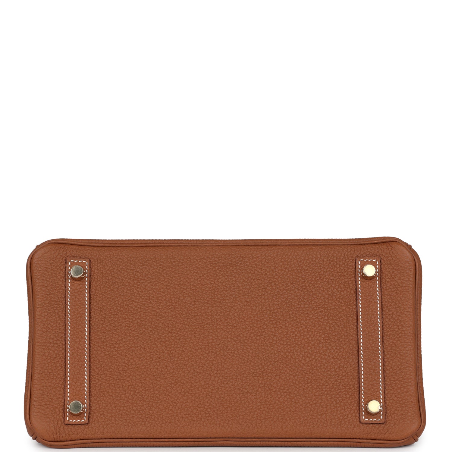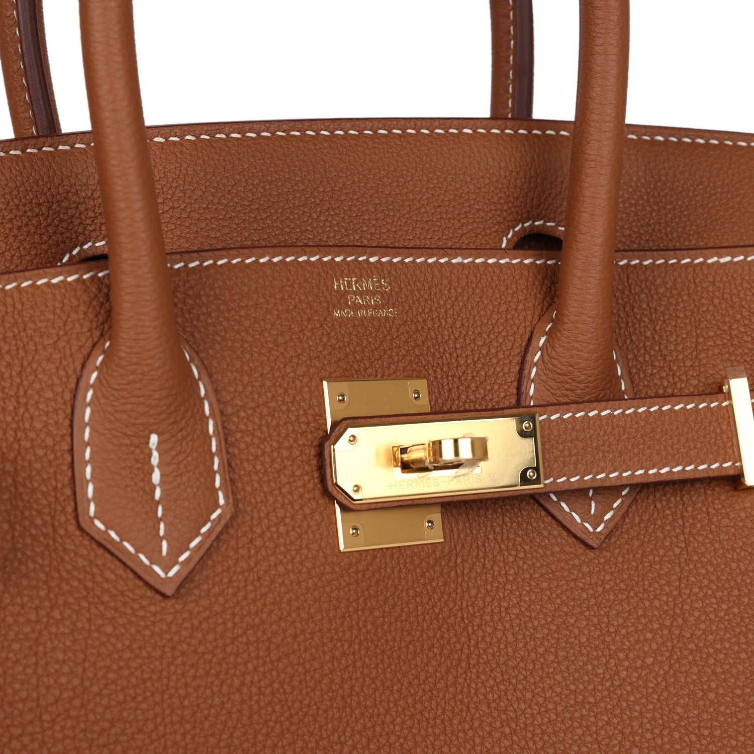 This Birkin is in Gold togo leather with gold hardware and has contrast stitching, front flap, two straps with center toggle closure, clochette with lock and two keys, and double rolled handles.