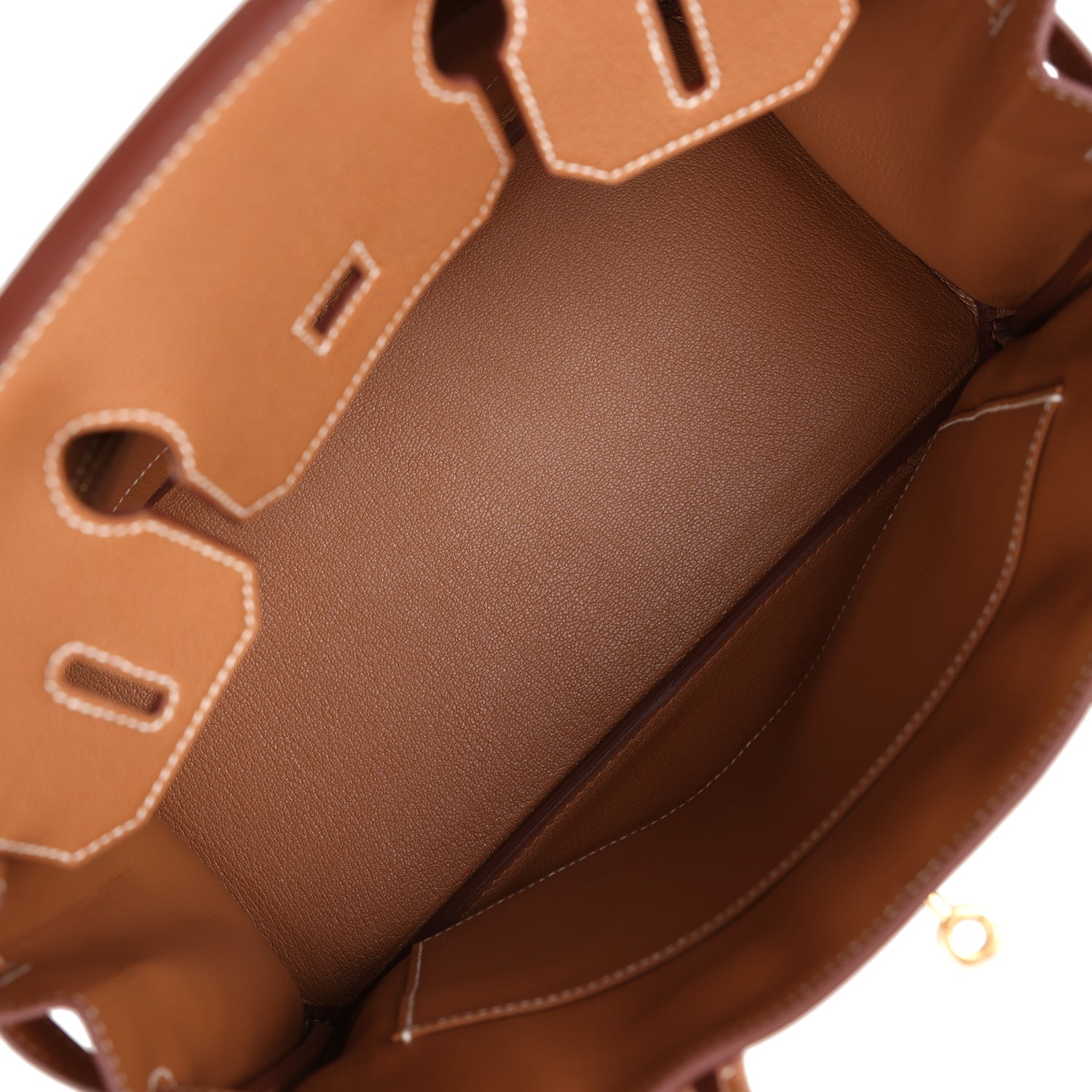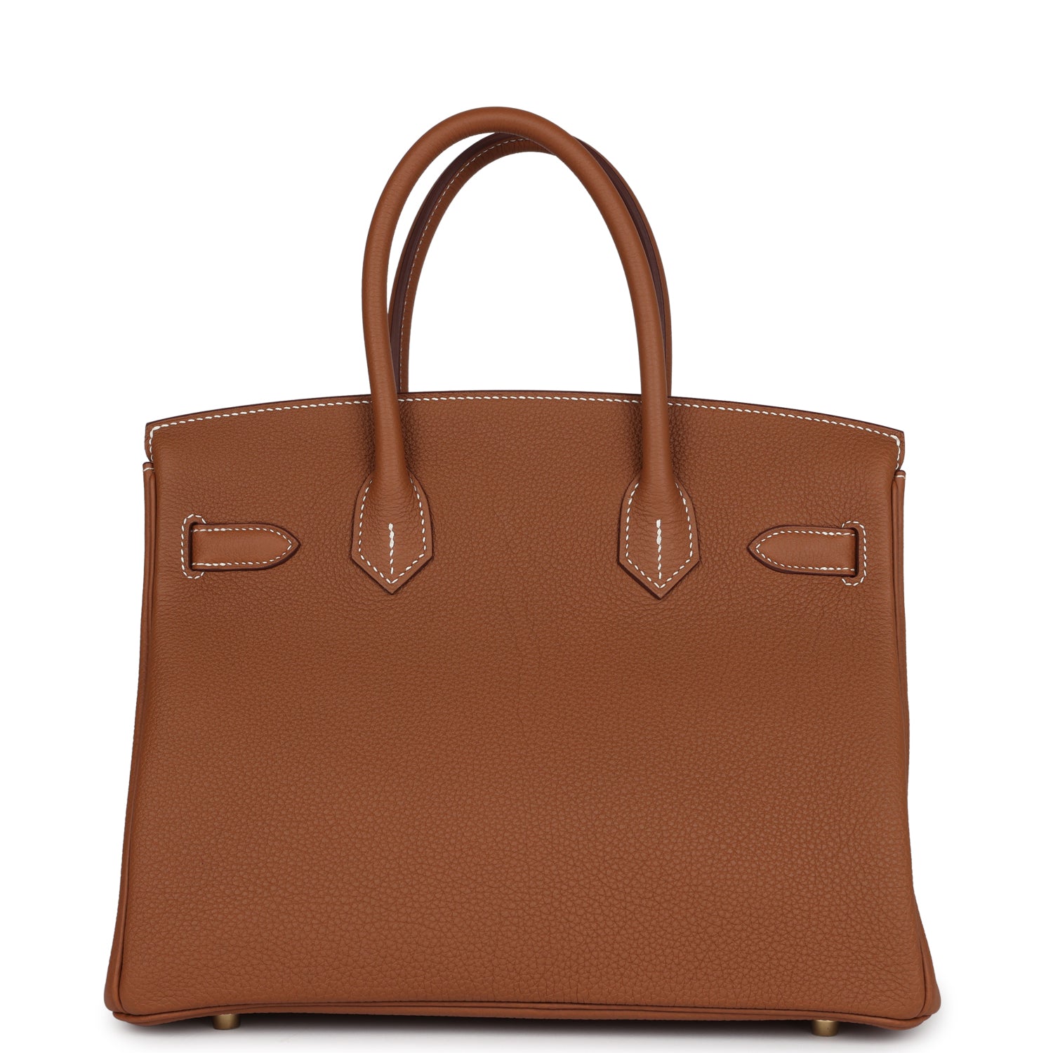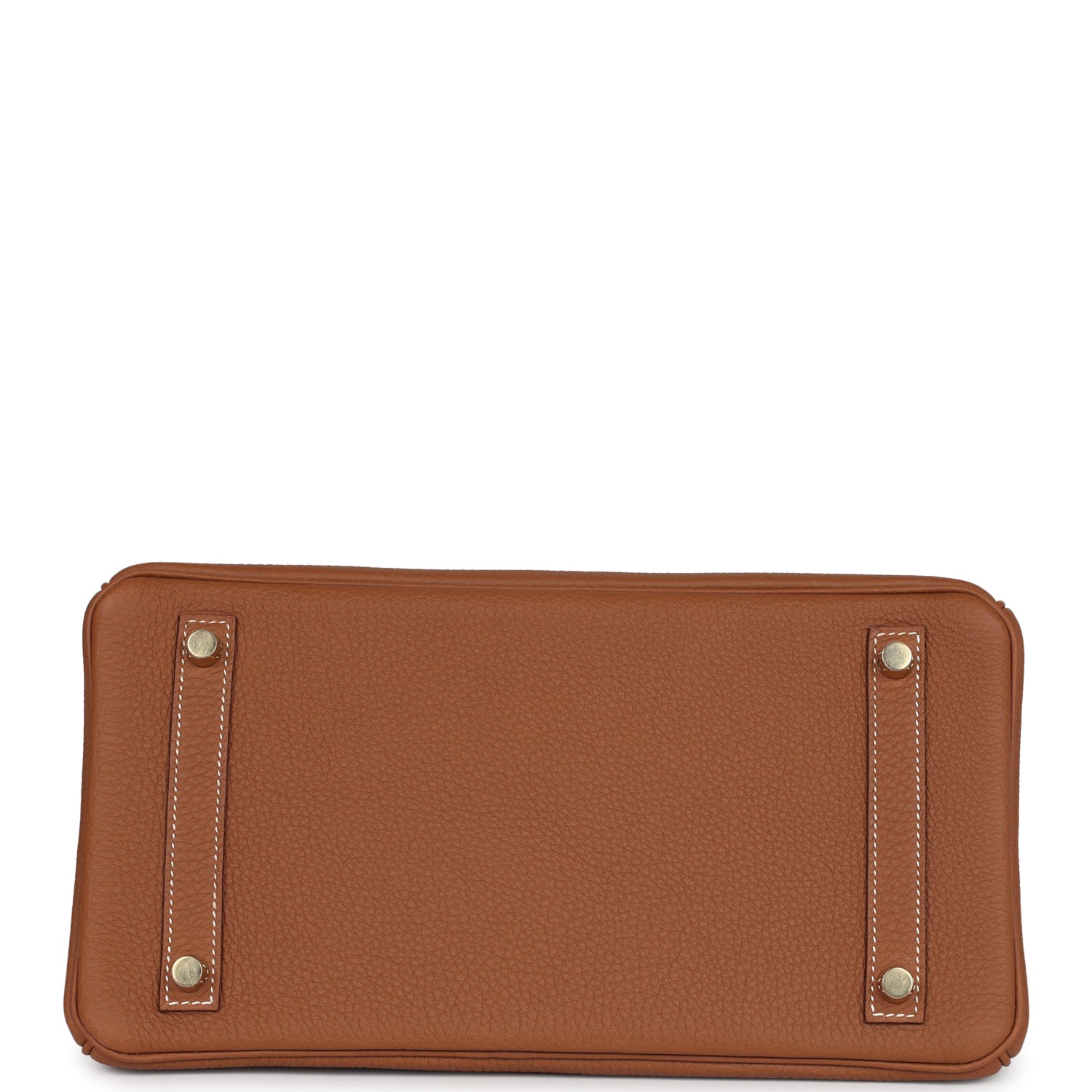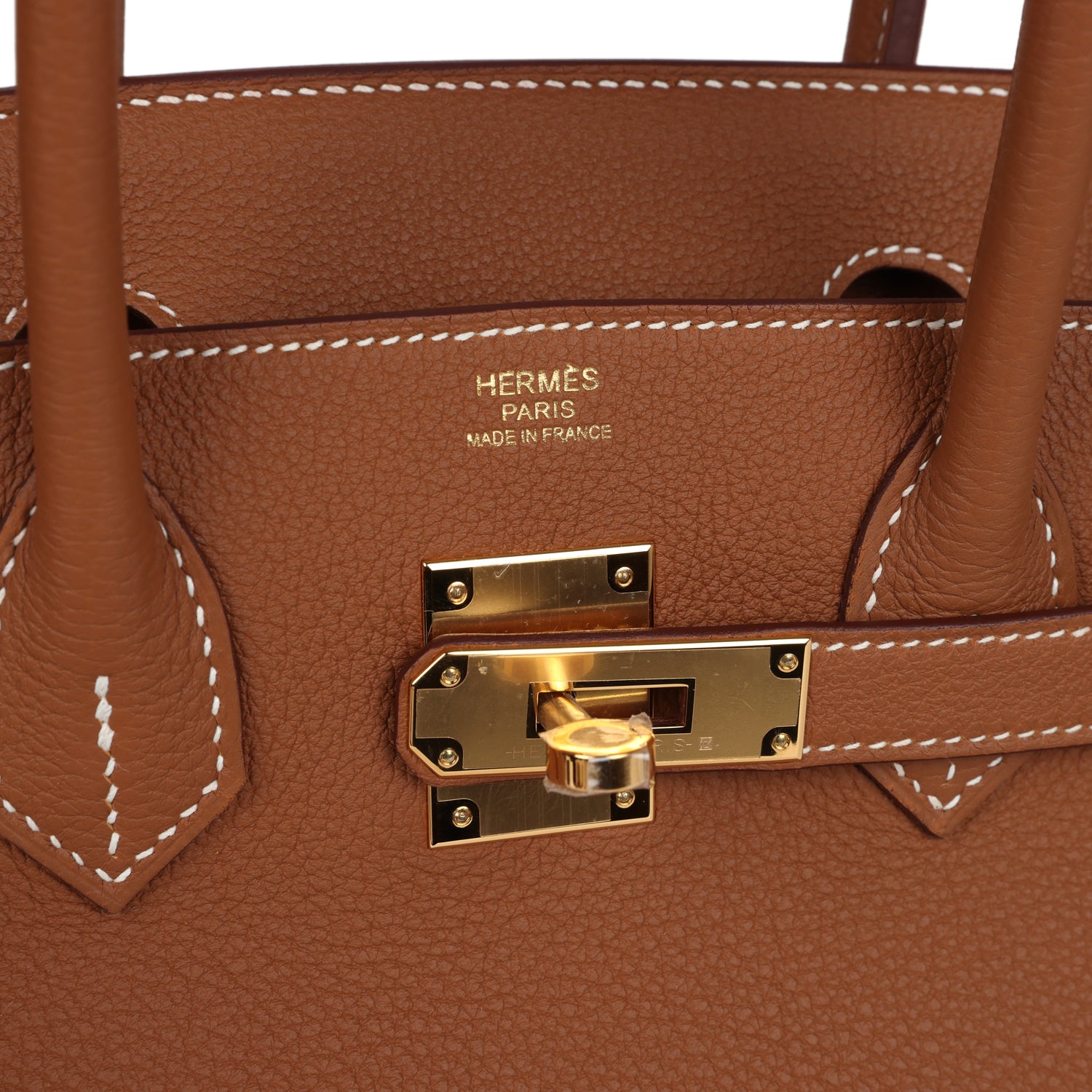 This Birkin is in Gold togo leather with gold hardware and has contrast stitching, front flap, two straps with center toggle closure, clochette with lock and two keys, and double rolled handles.