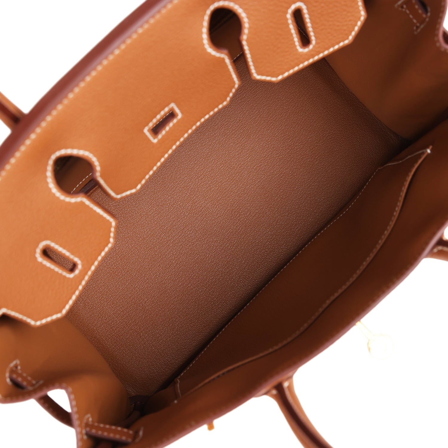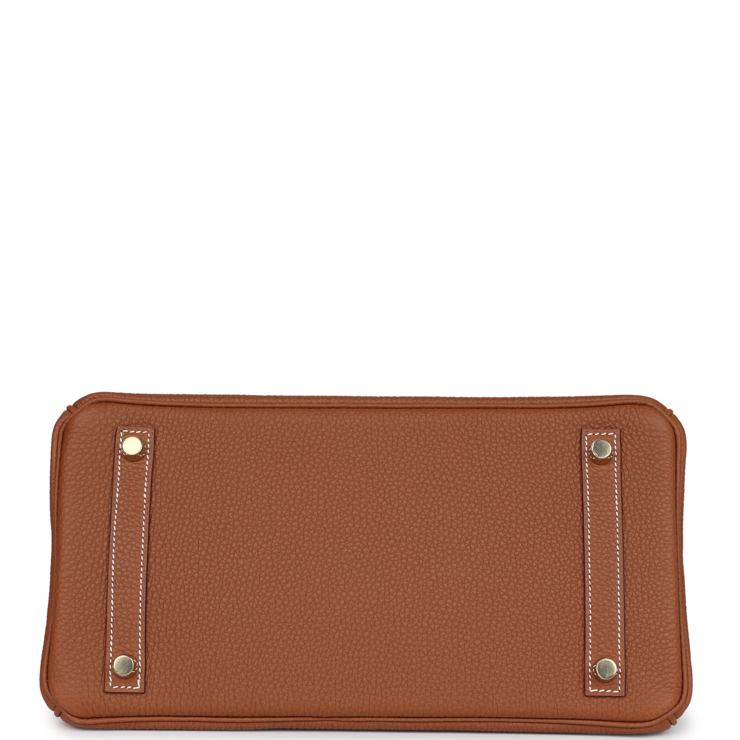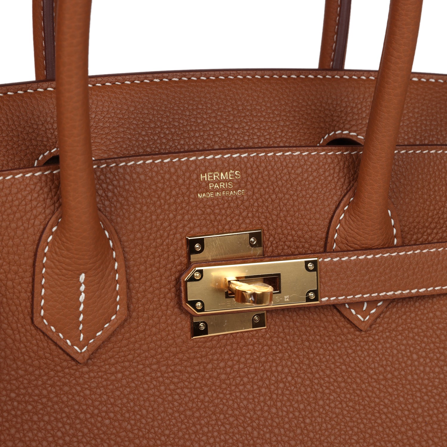 This Birkin is in Gold togo leather with gold hardware and has contrast stitching, front flap, two straps with center toggle closure, clochette with lock and two keys, and double rolled handles.
