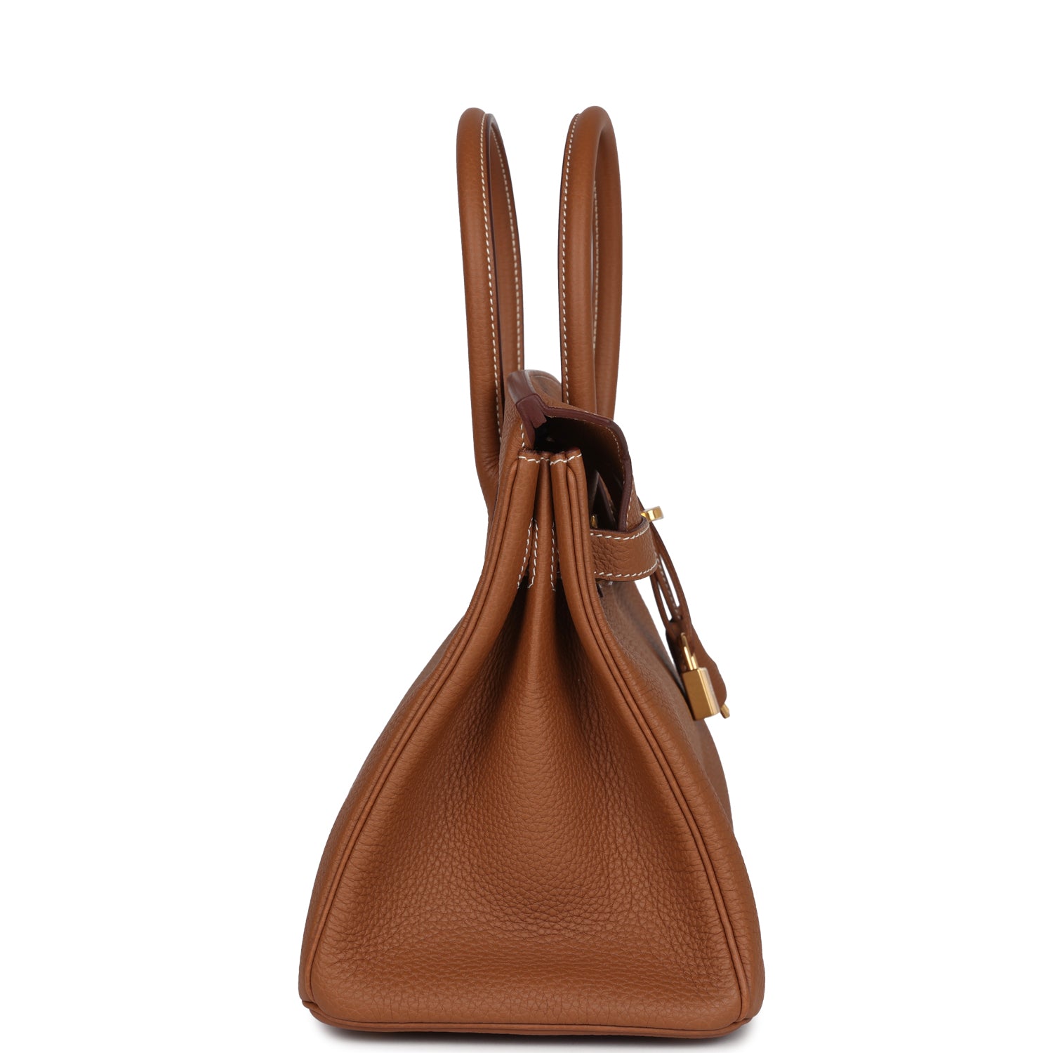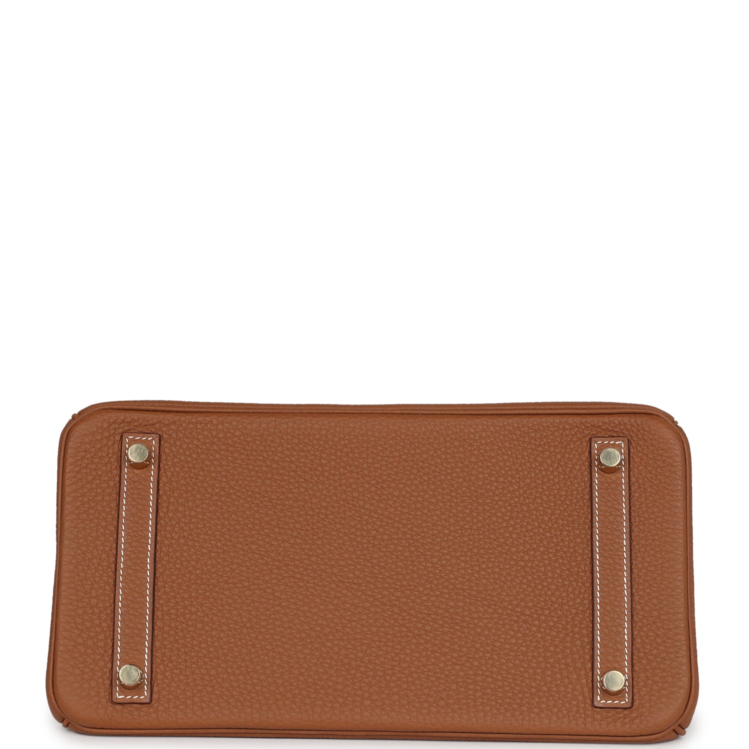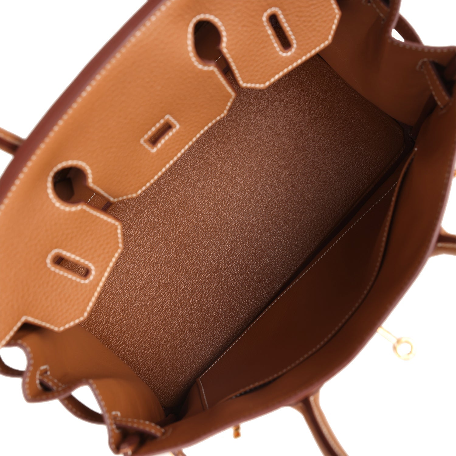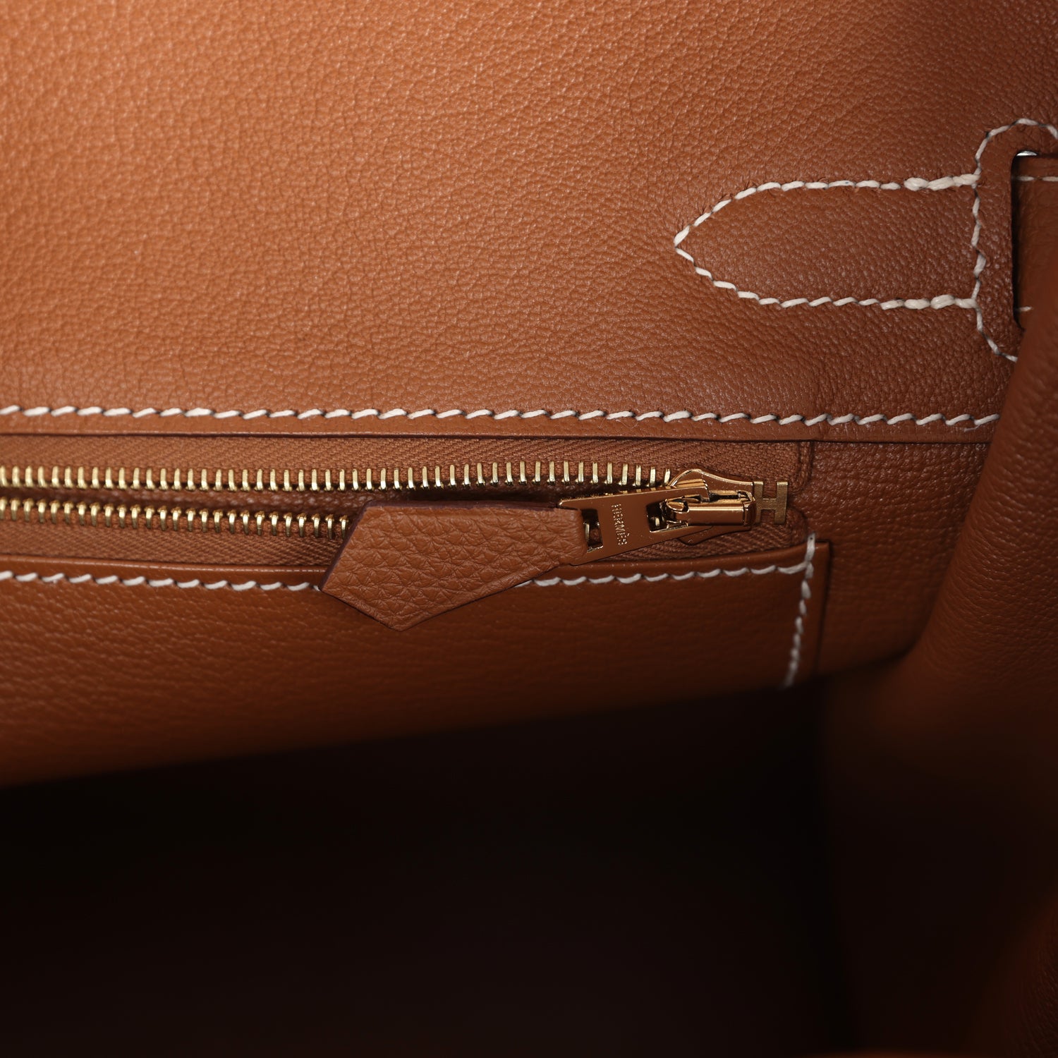 This Birkin is in Gold togo leather with gold hardware and has contrast stitching, front flap, two straps with center toggle closure, clochette with lock and two keys, and double rolled handles.