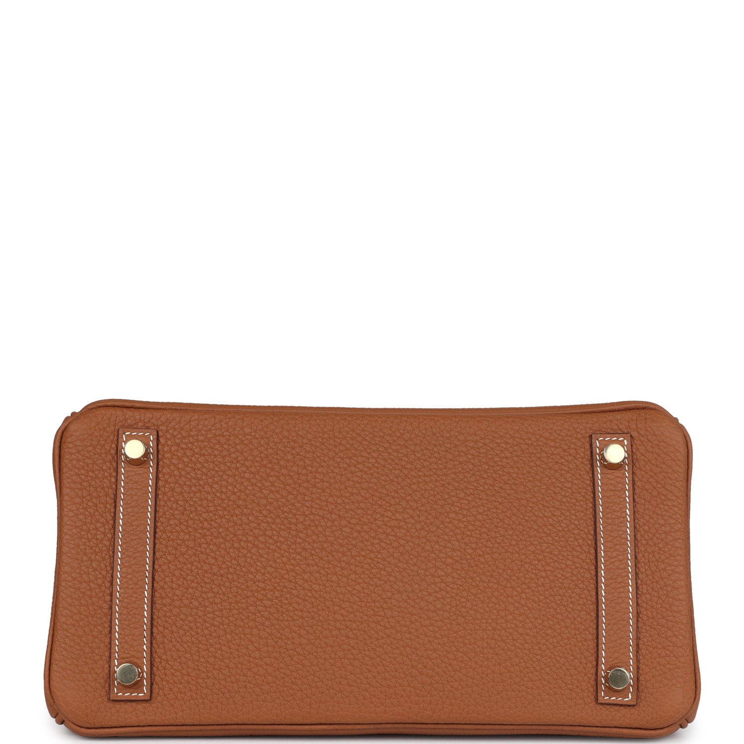 This Birkin is in Gold togo leather with gold hardware and has contrast stitching, front flap, two straps with center toggle closure, clochette with lock and two keys, and double rolled handles.