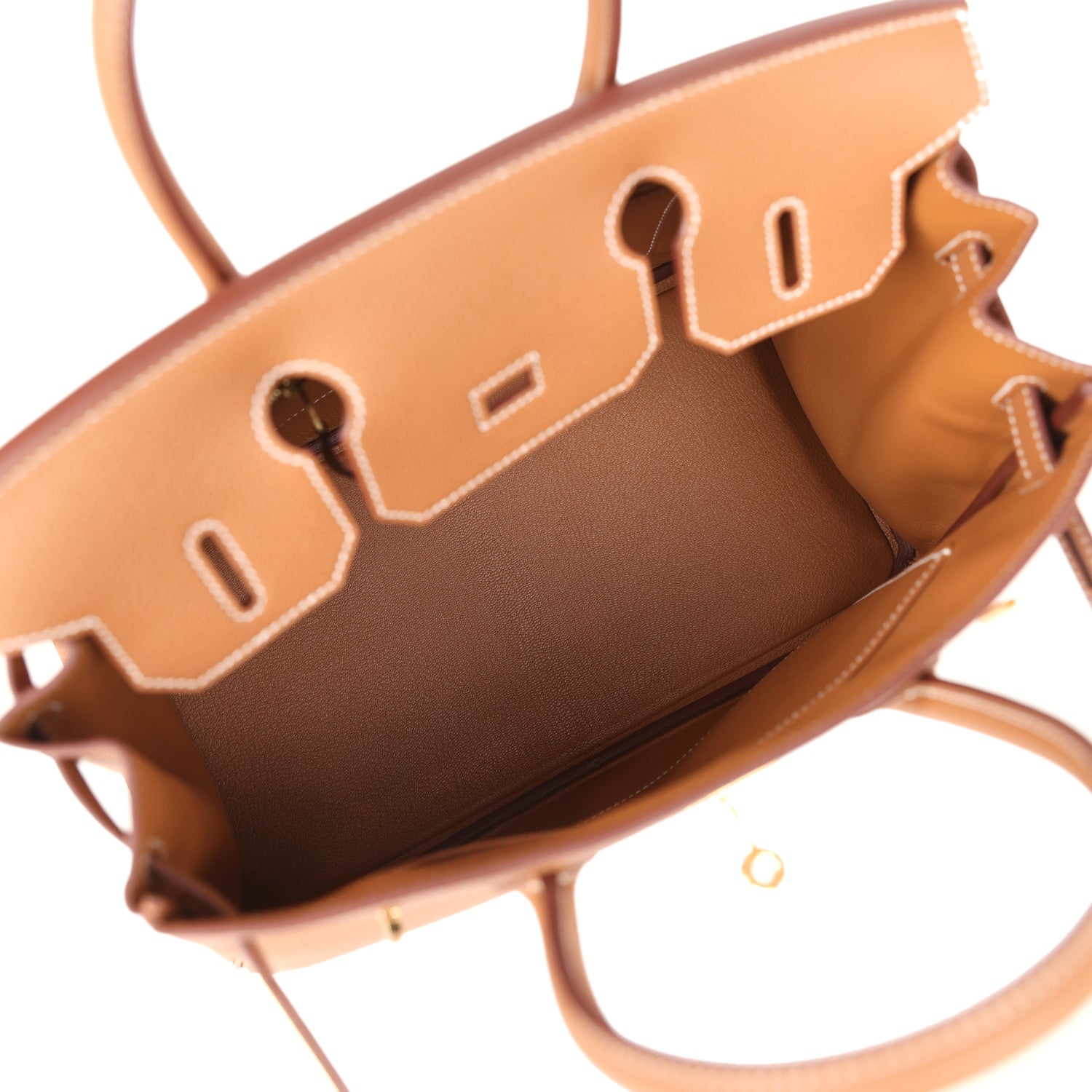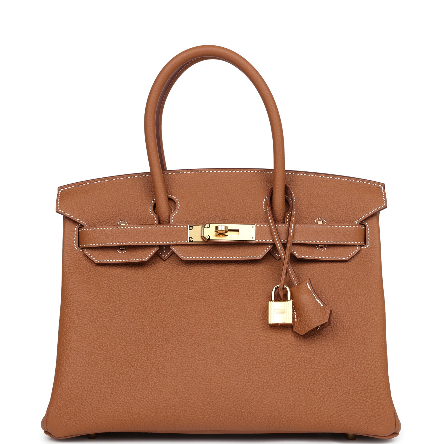 This Birkin is in Gold togo leather with gold hardware and has contrast stitching, front flap, two straps with center toggle closure, clochette with lock and two keys, and double rolled handles.
