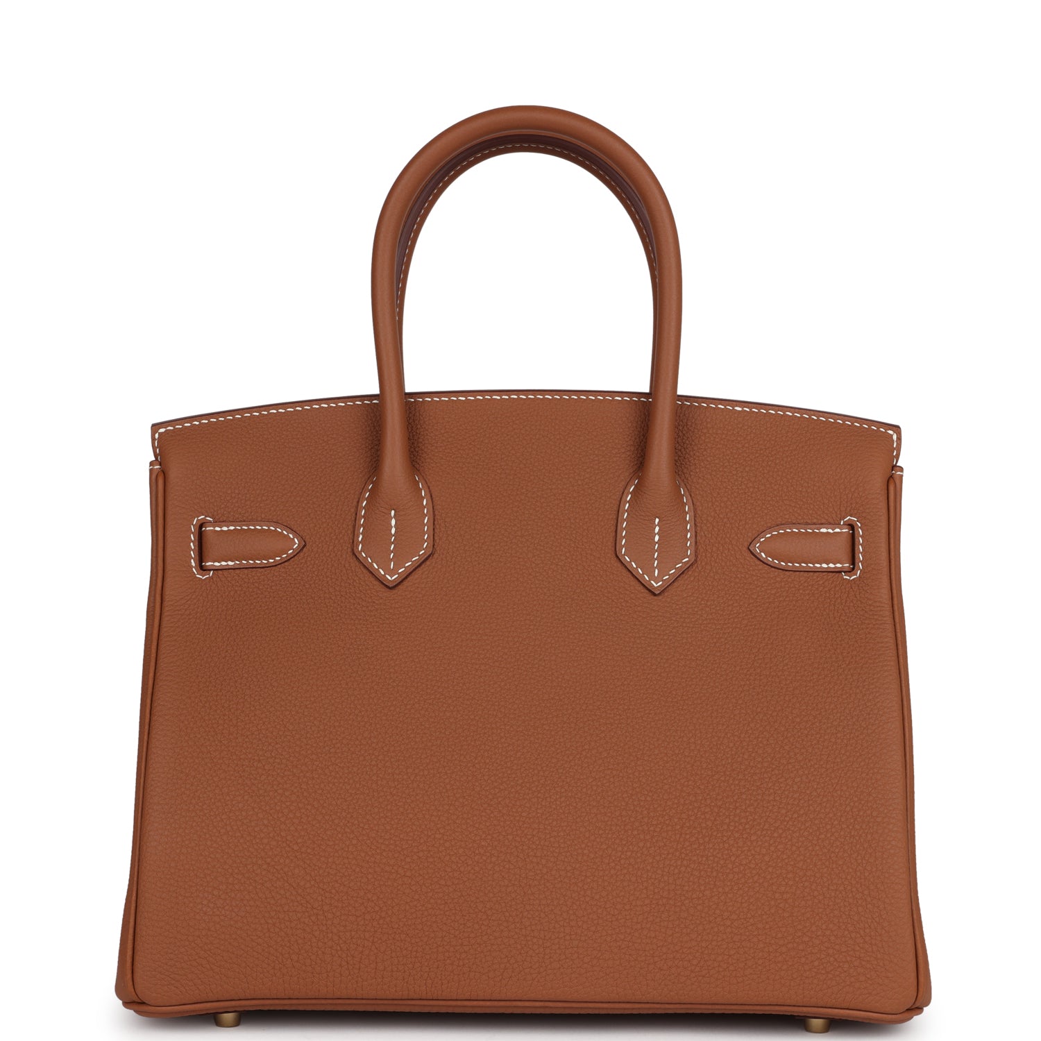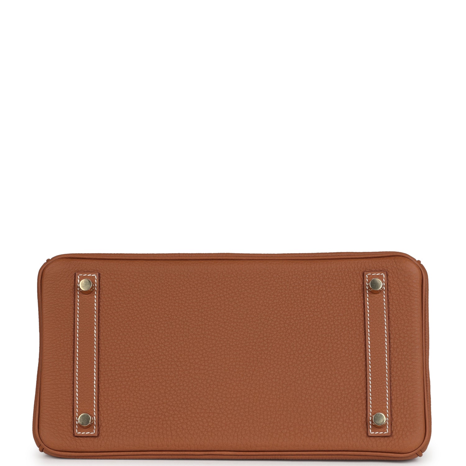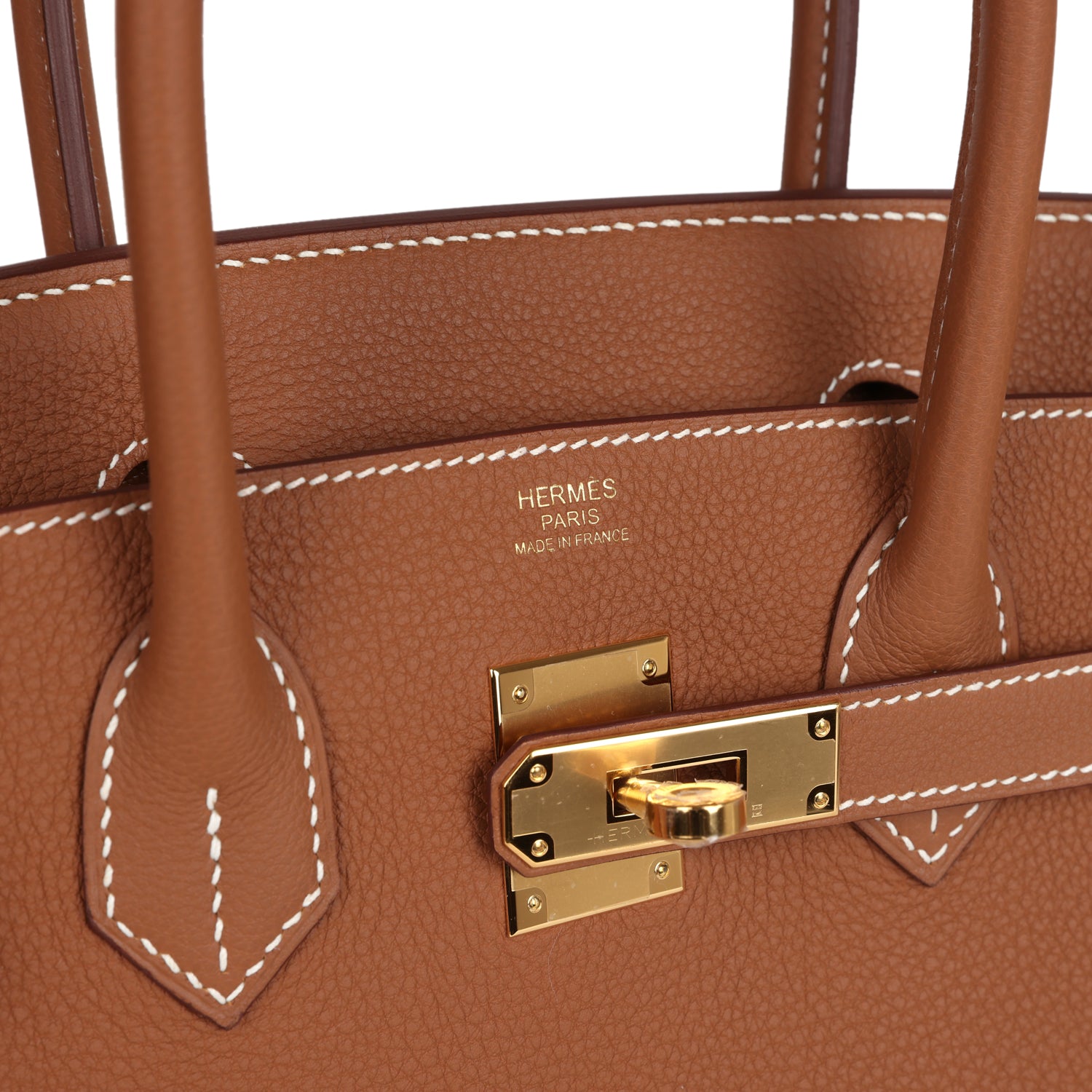 This Birkin is in Gold togo leather with gold hardware and has contrast stitching, front flap, two straps with center toggle closure, clochette with lock and two keys, and double rolled handles.